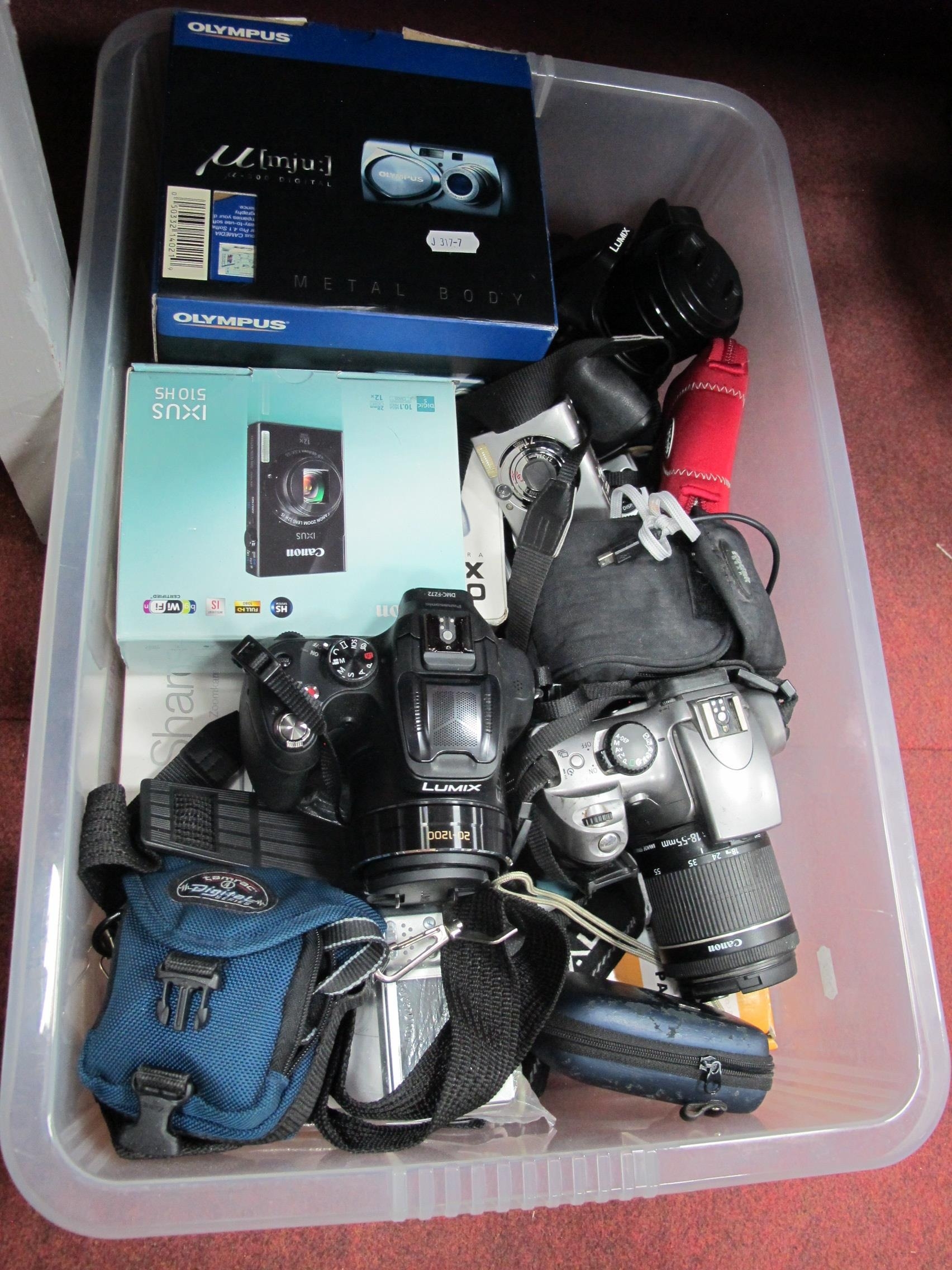 Digital and Compact Cameras, including boxed Nikon 4600, Panasonic FS5/FZ72, Kodak DX6440, Olympus u300, Canon DS6041/510HS/S410, etc:- One Box. [533653]