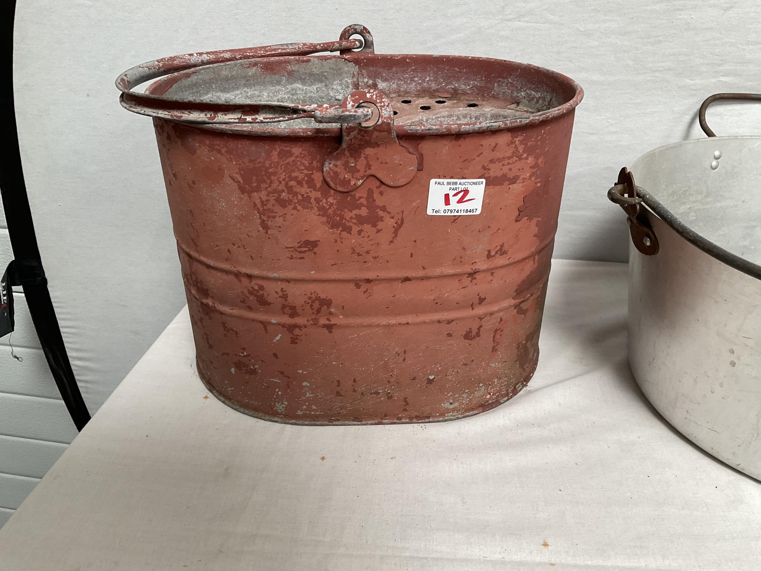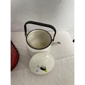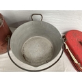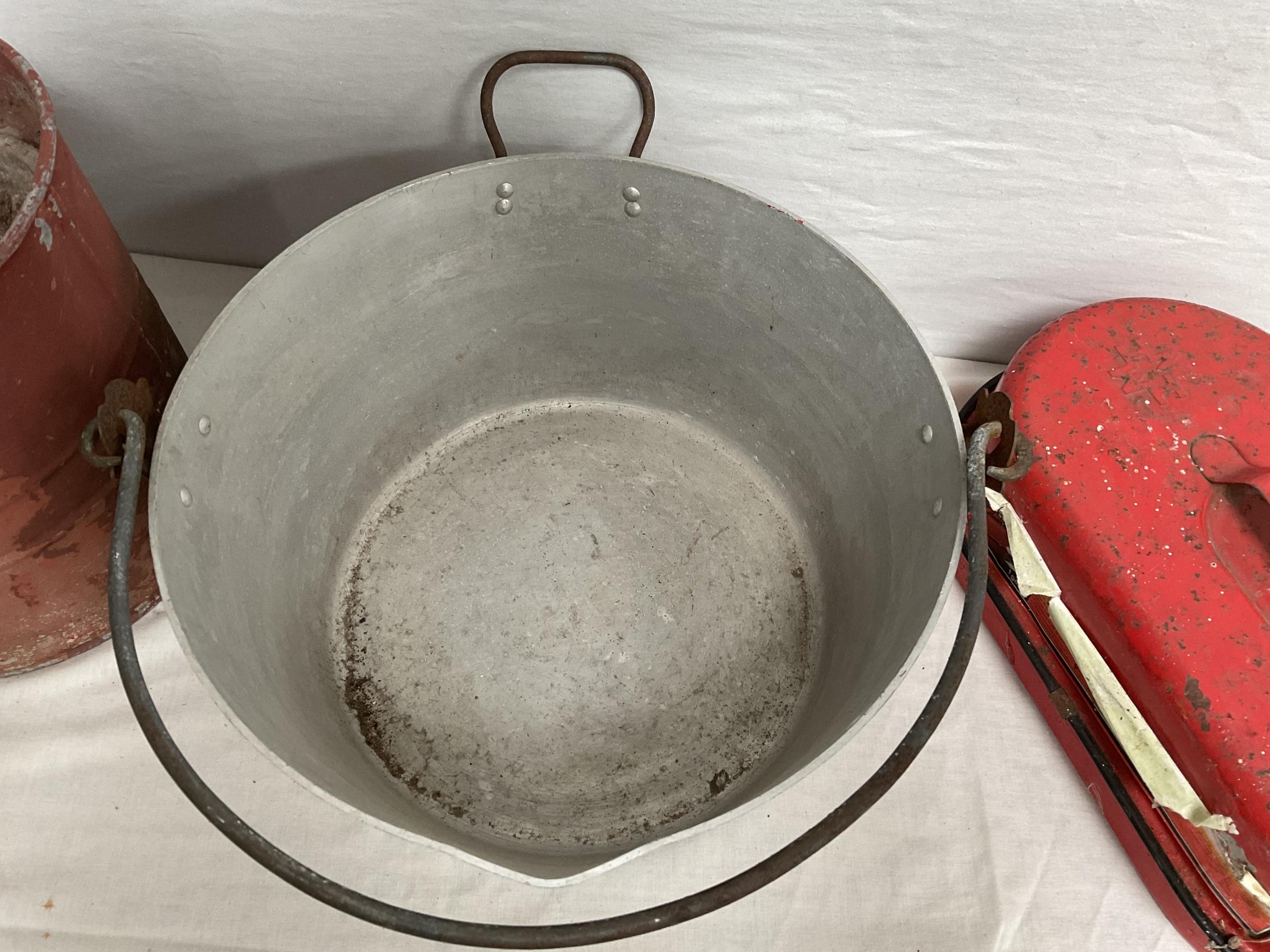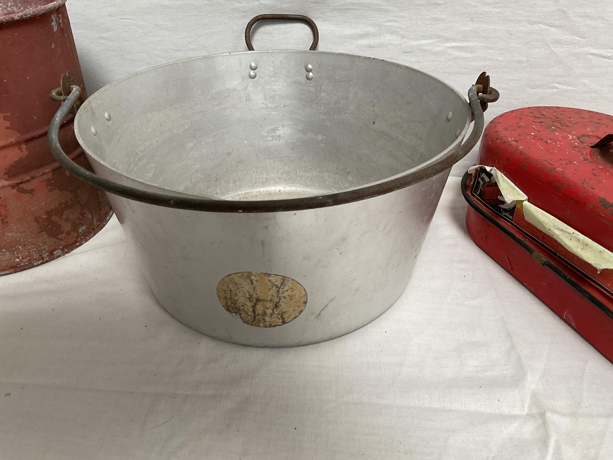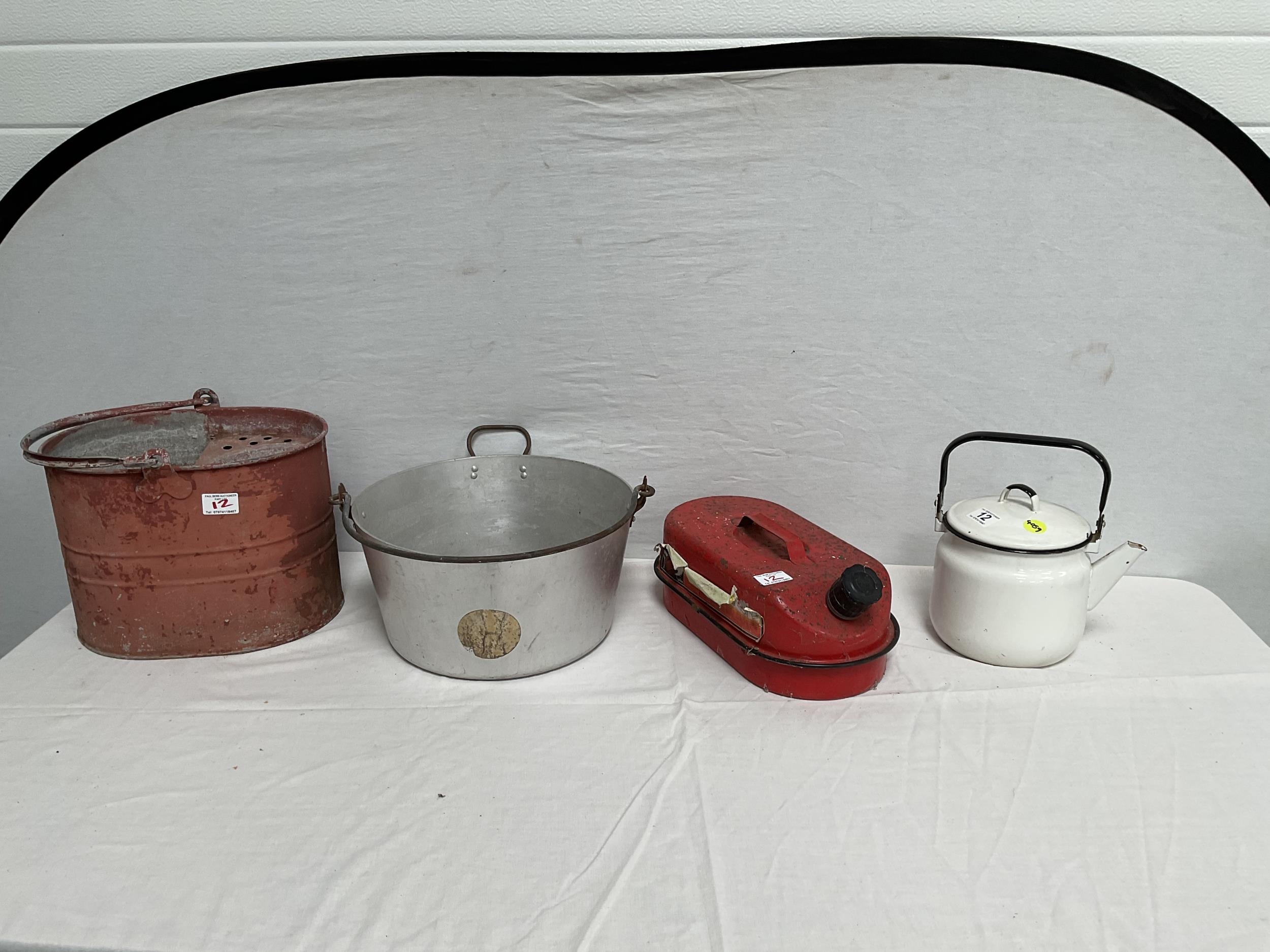 VINTAGE ENAMELLED POT WITH COVER, MOP BUCKET, JAM KETTLE, AND PETROL CAN