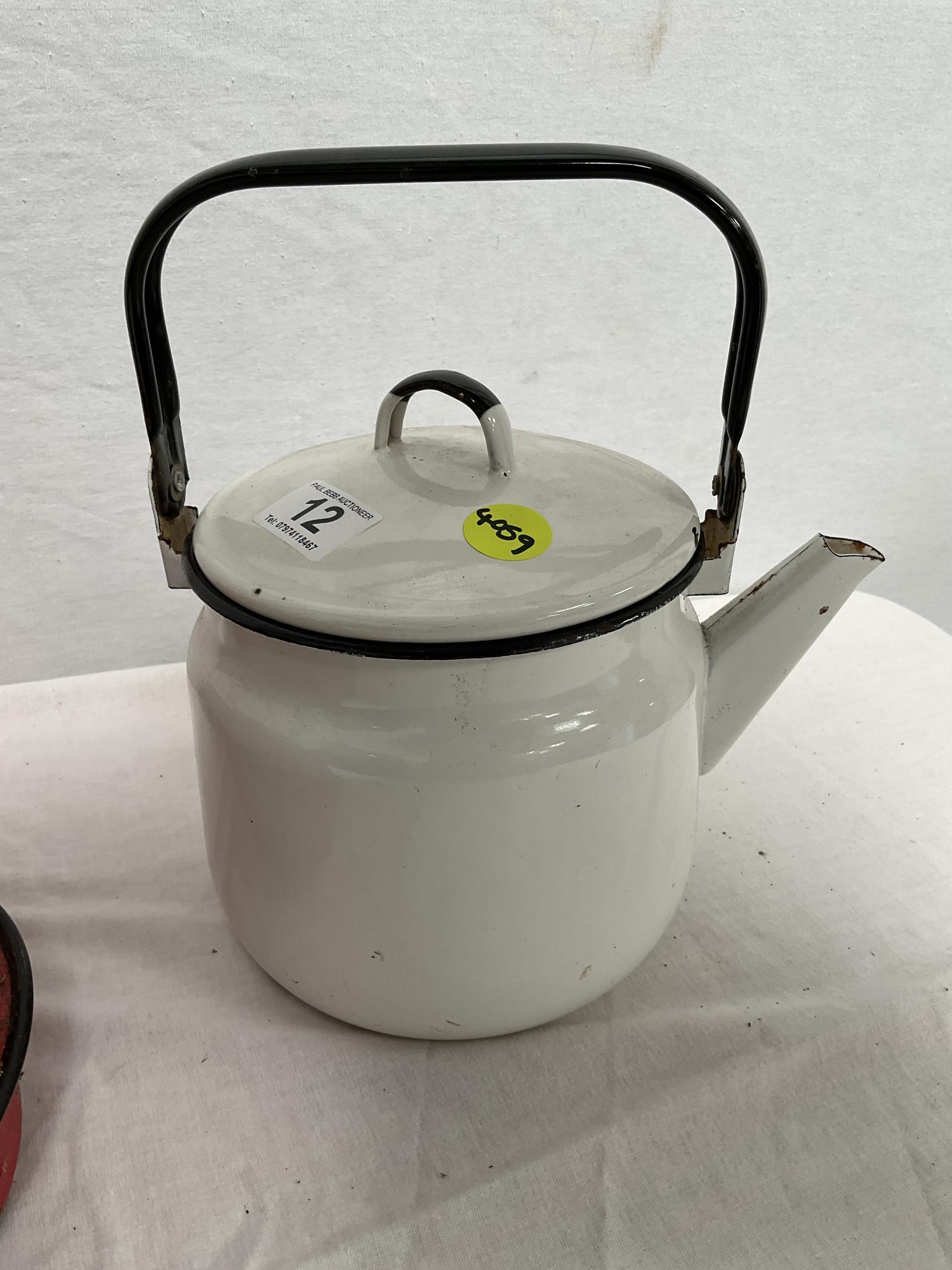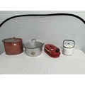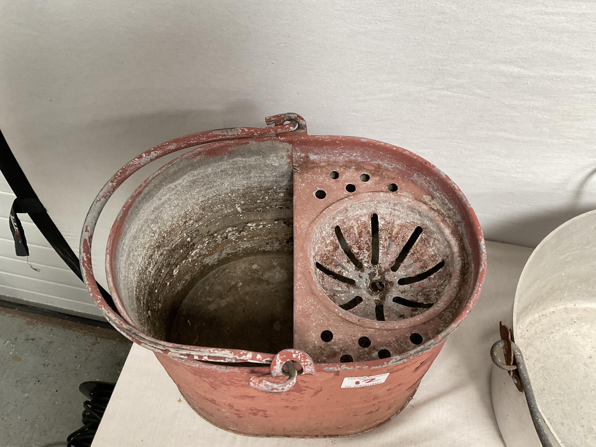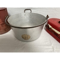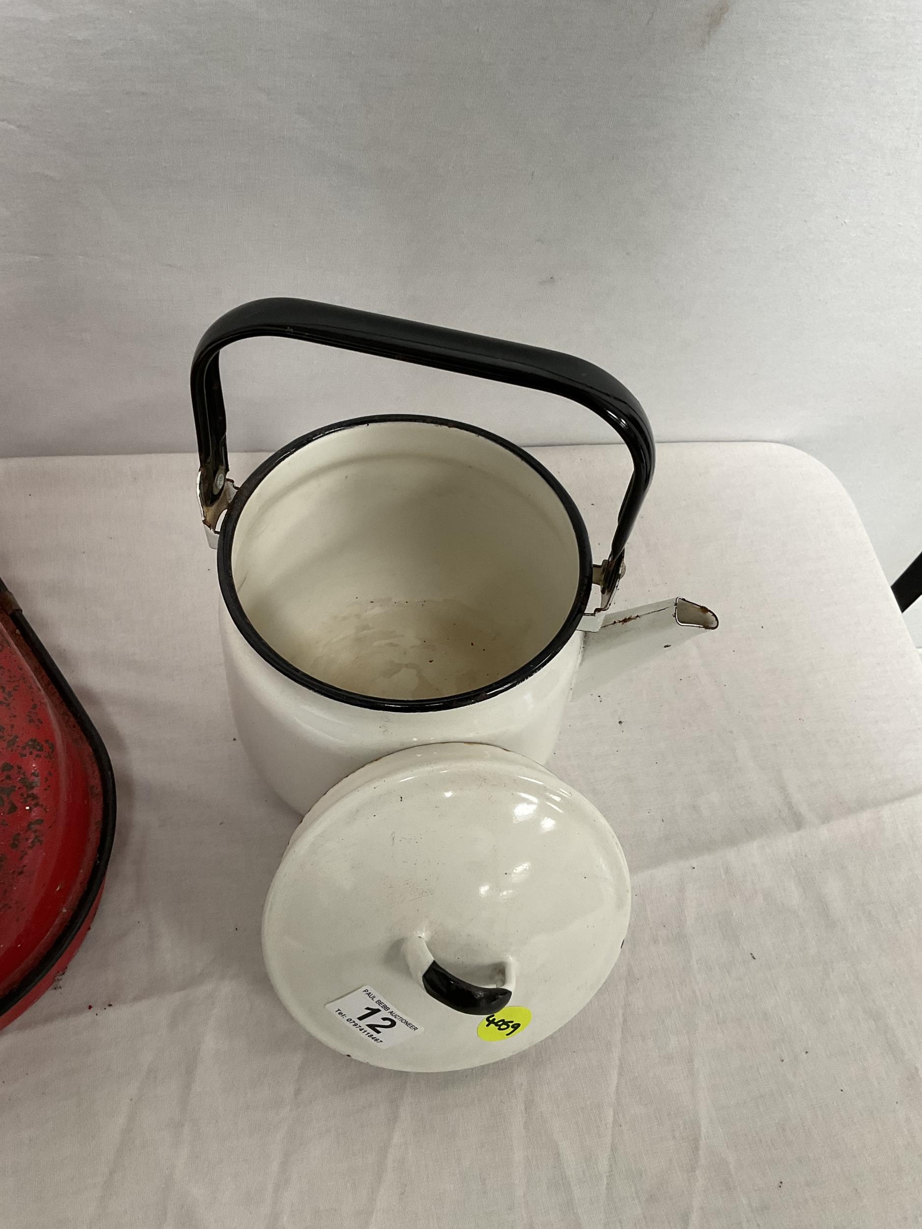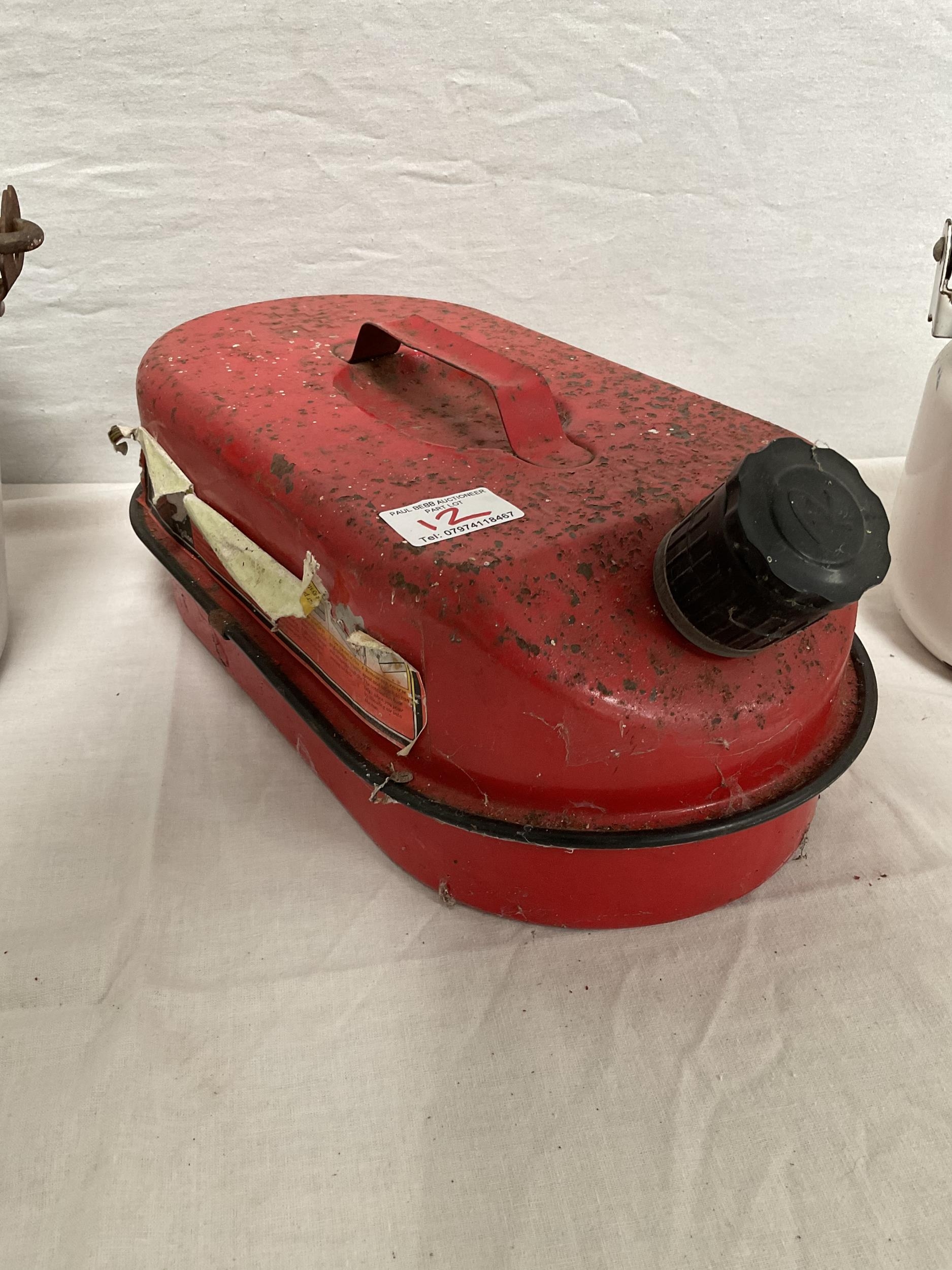 VINTAGE ENAMELLED POT WITH COVER, MOP BUCKET, JAM KETTLE, AND PETROL CAN