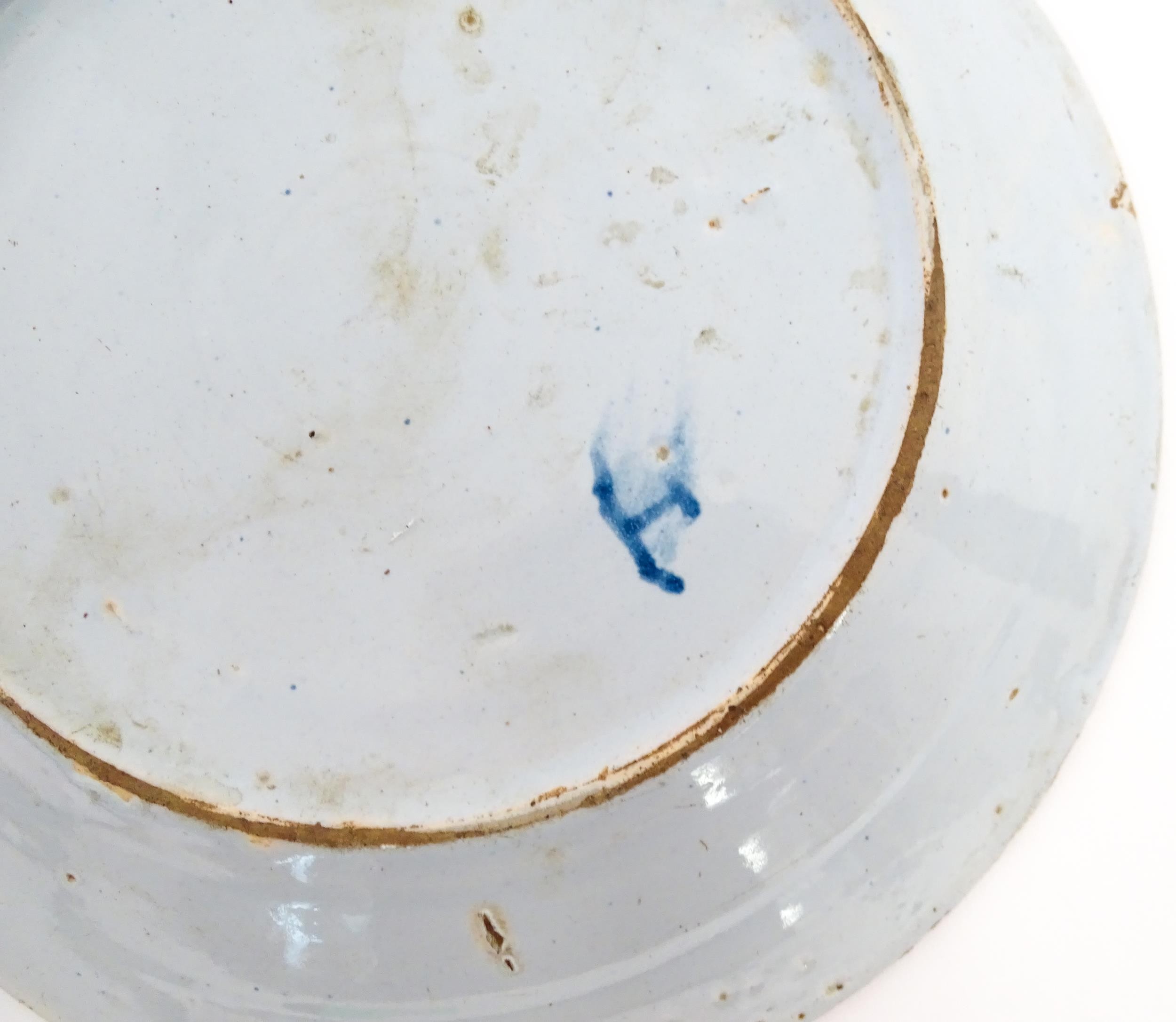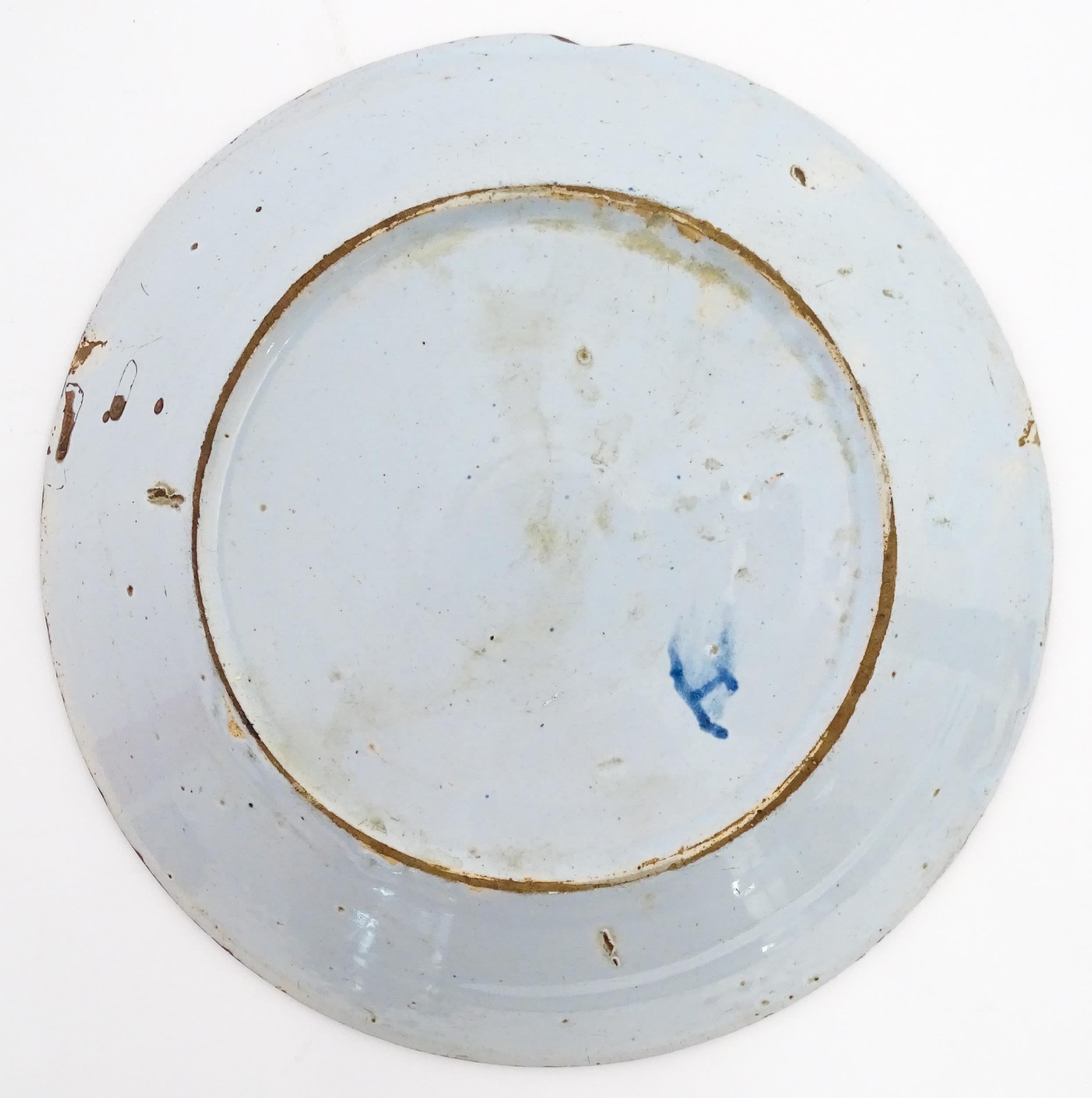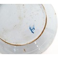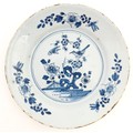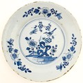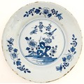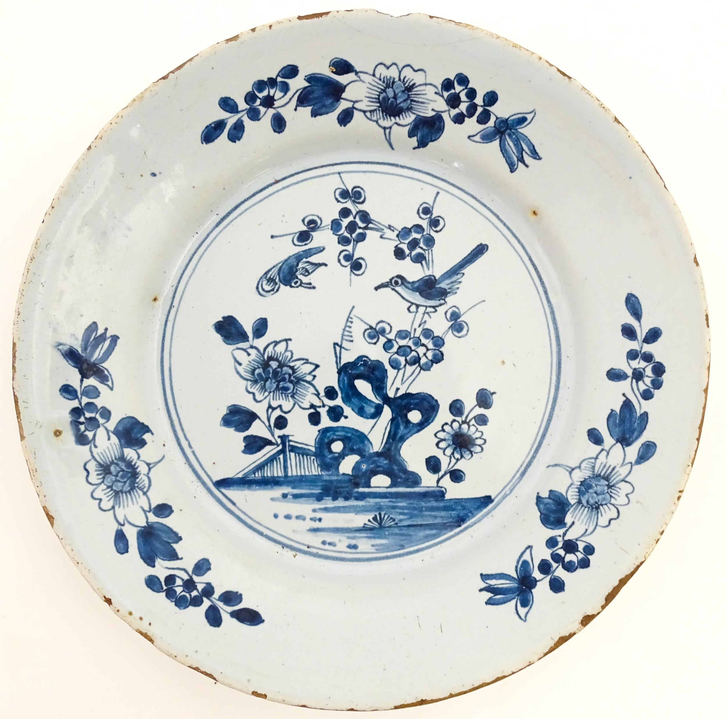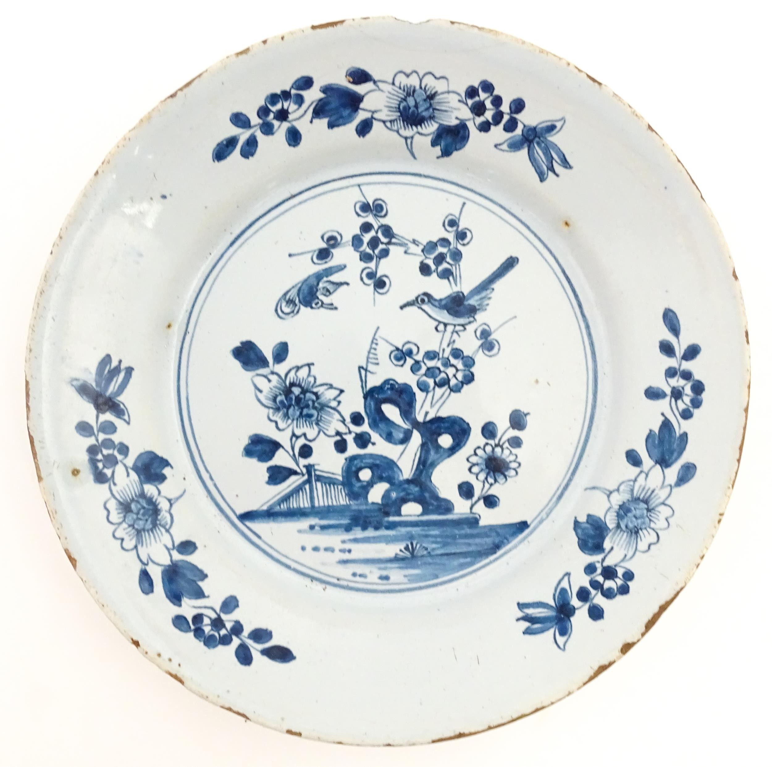A Delft blue and white plate decorated in the Chinese style with taihu rock, birds, flowers and foliage. With a floral border. Approx. 8 1/2" diameter