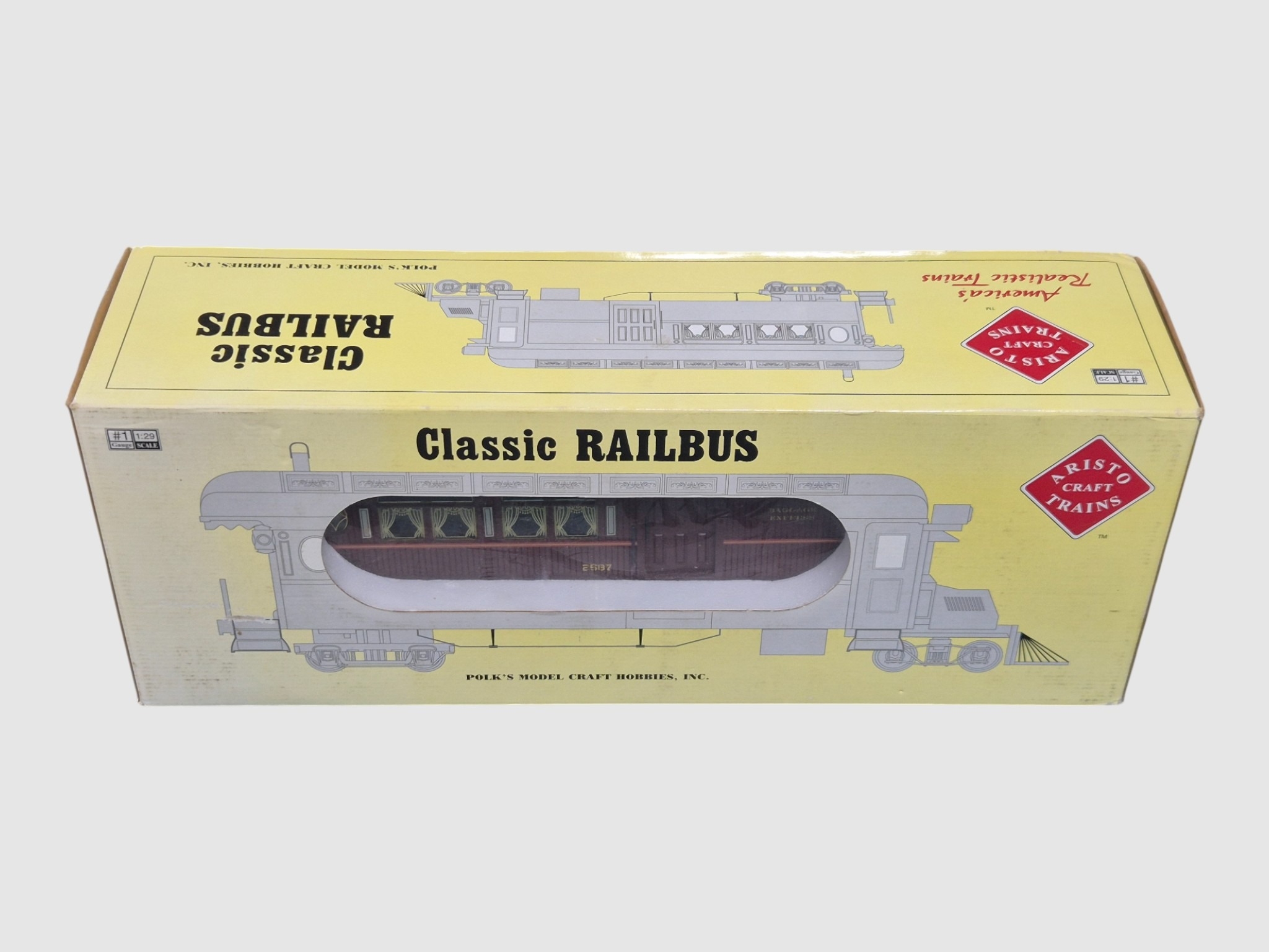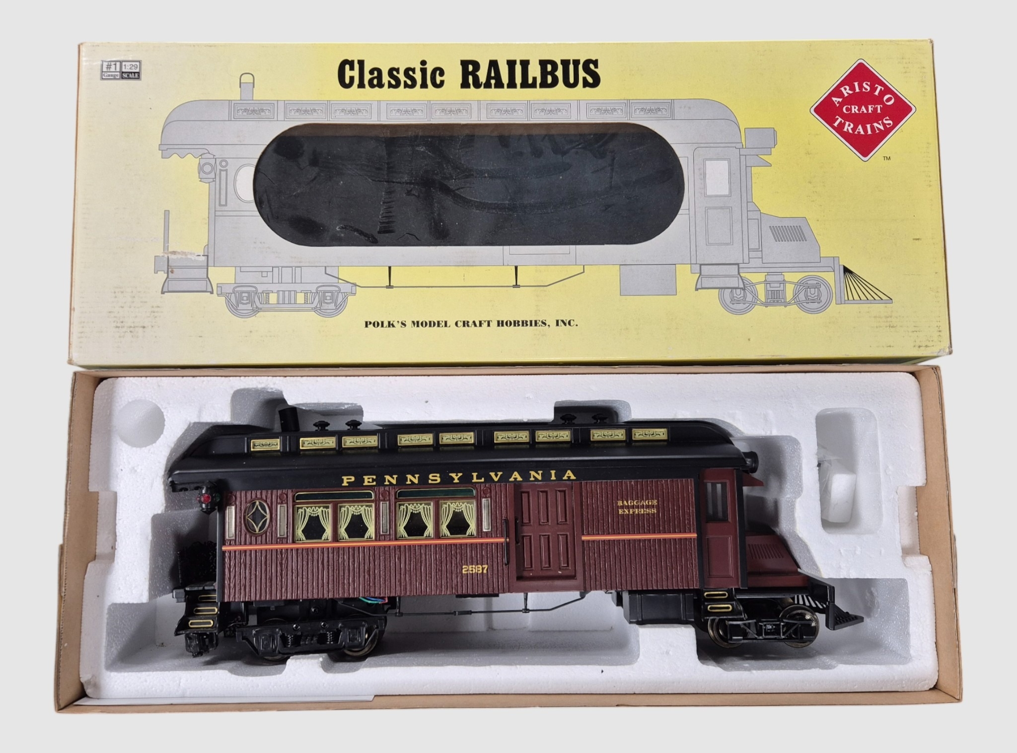 Aristo Craft G gauge Classic Railbus PRR/Pennsylvania maroon 2587 No. ART83106, generally excellent to good plus in good plus box and polystyrene inner. Contents unchecked for completeness or correctness and untested. Viewing recommended.