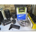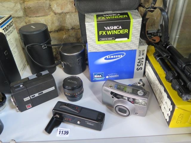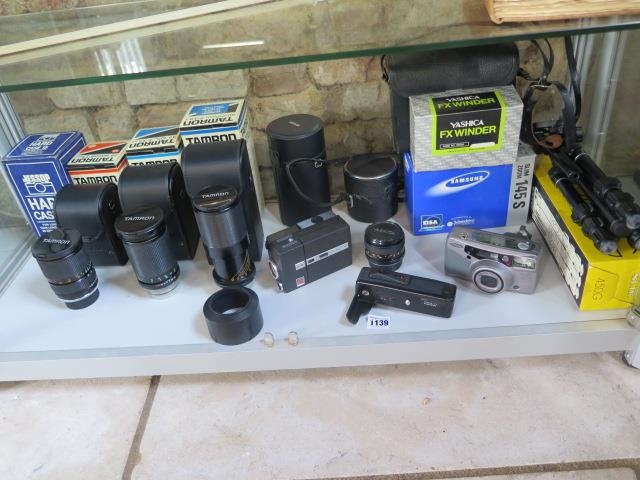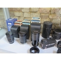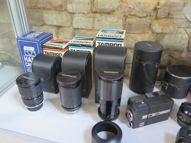 A collection of camera equipment and lenses, including Tamron 80-210mm, Tamron 28-80mm, Kodak Instamatic movie camera, Samsung 145S camera etc
