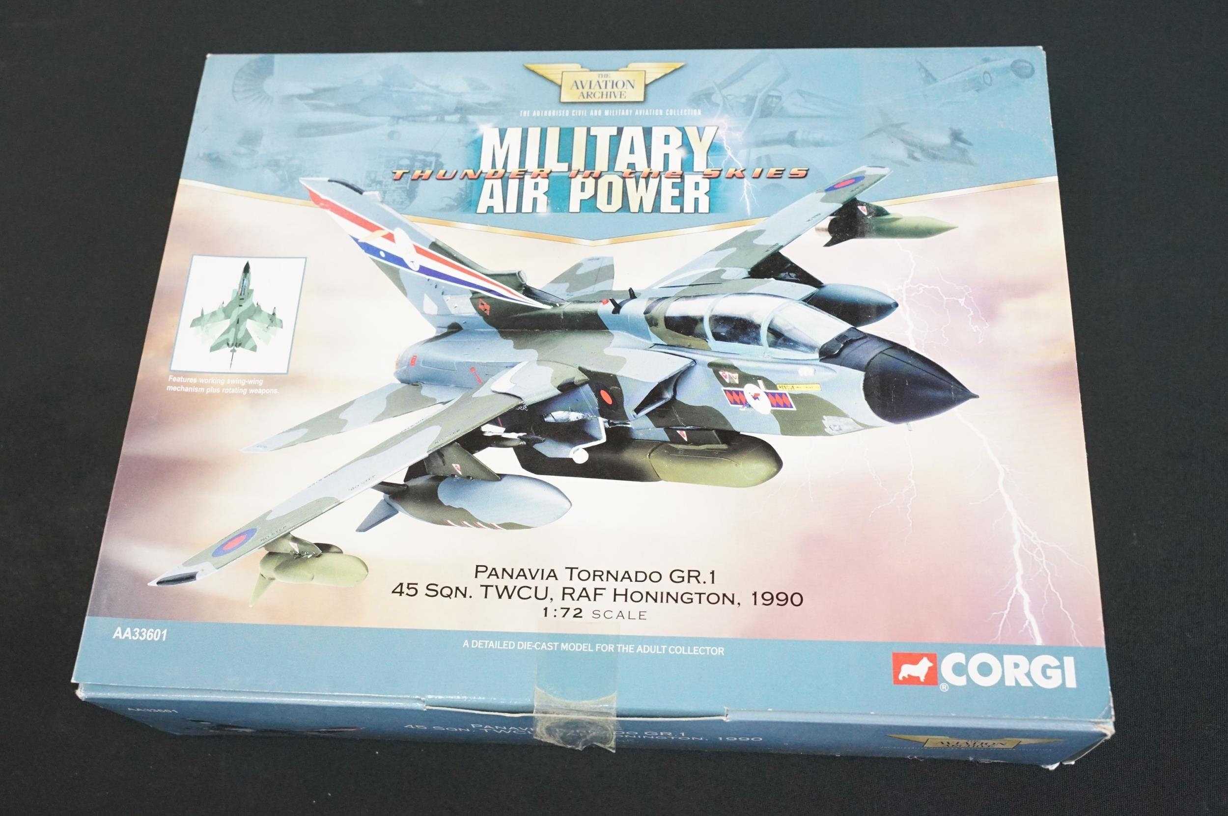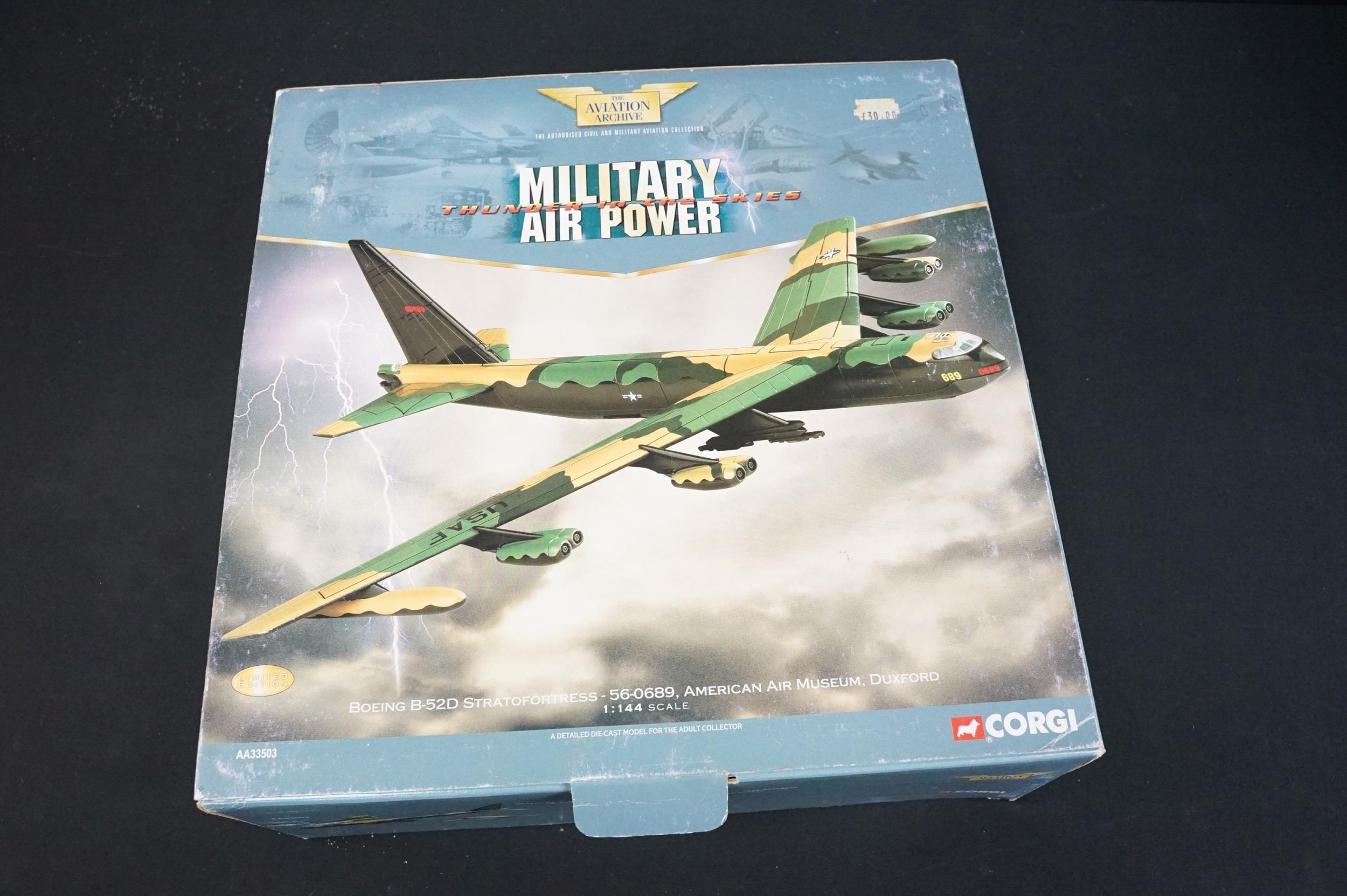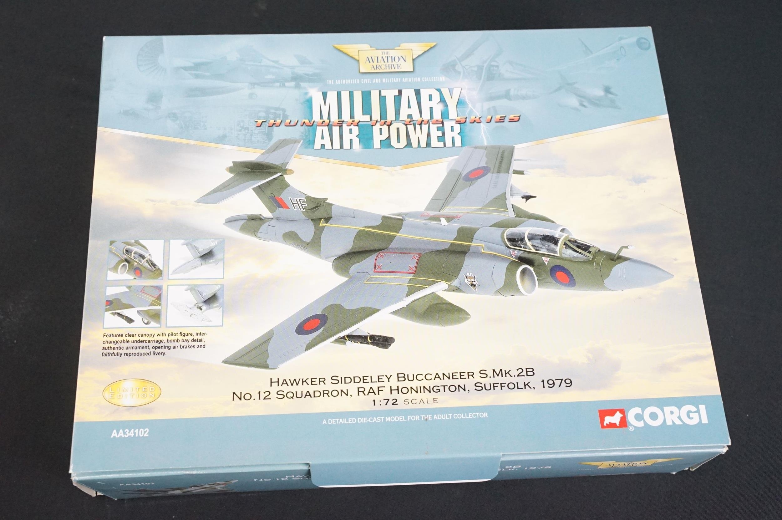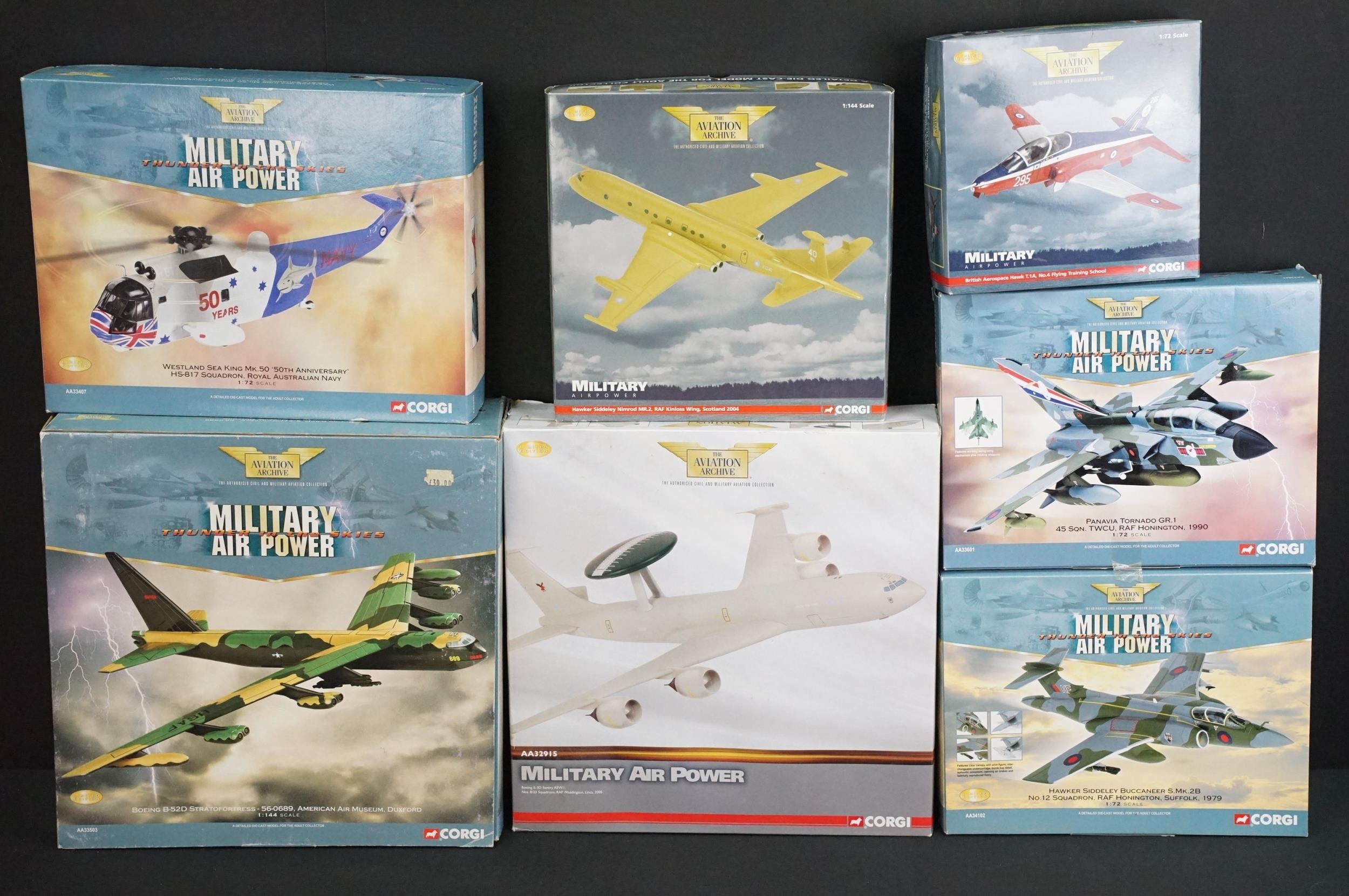 Seven boxed Corgi Aviation Archive Military Air Power diecast models to include AA33503 Boeing B-52D Stratofortress 56-0689 American Air Museum, AA33407 Westland Sea king Mk50 59th Anniversary, AA33601 Panavia Tornado GR 1, AA34102 Hawker Siddeley Bucaneer S Mk 2B, AA32915 Boeing E-3D Sentry AEW1, AA35601 Hawker Siddeley Nimrod MR2 and AA36002 British Aerospace Hawk T1A no 4 Flying School, diecast appears to be complete and ex, boxes vg