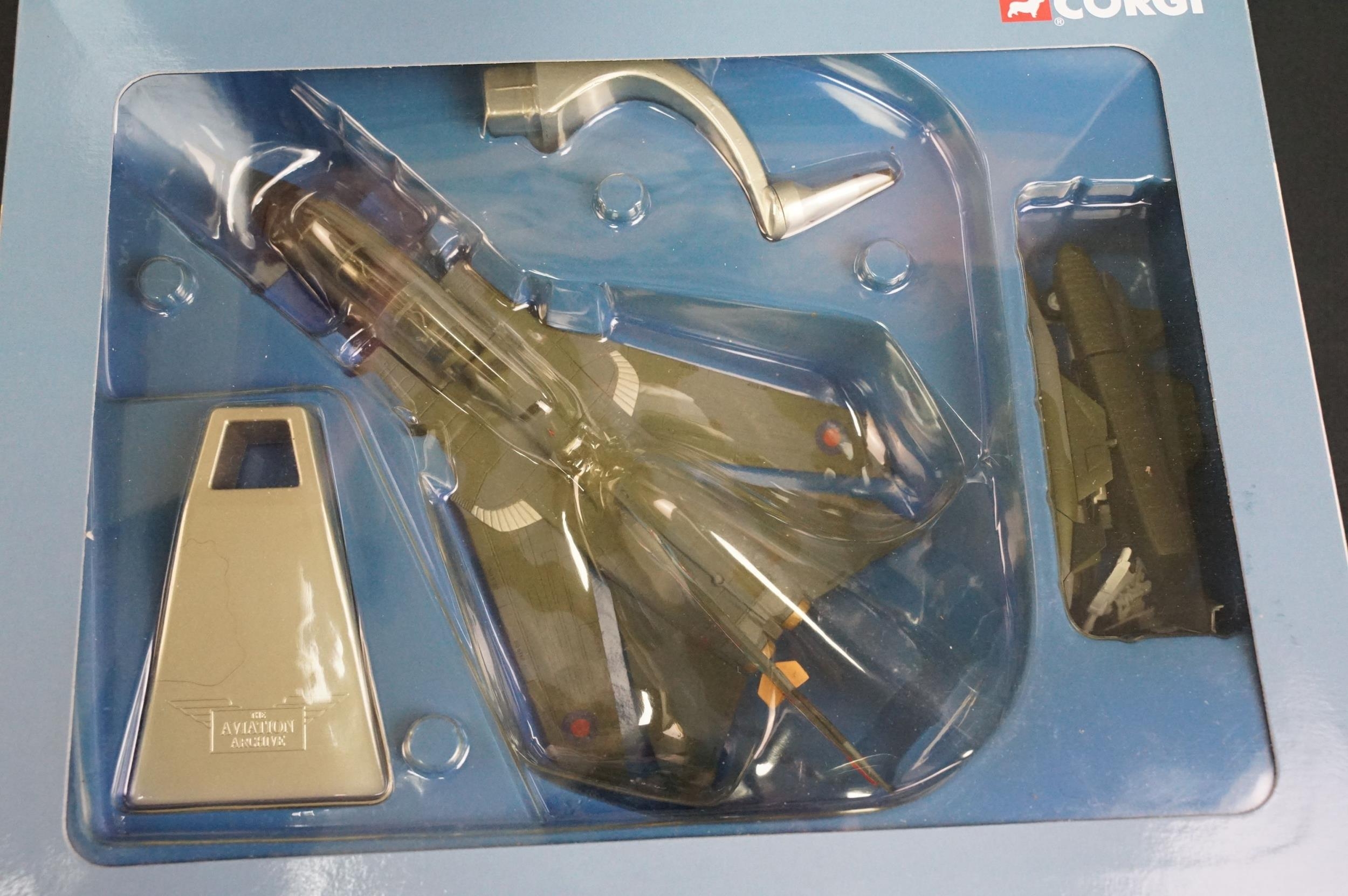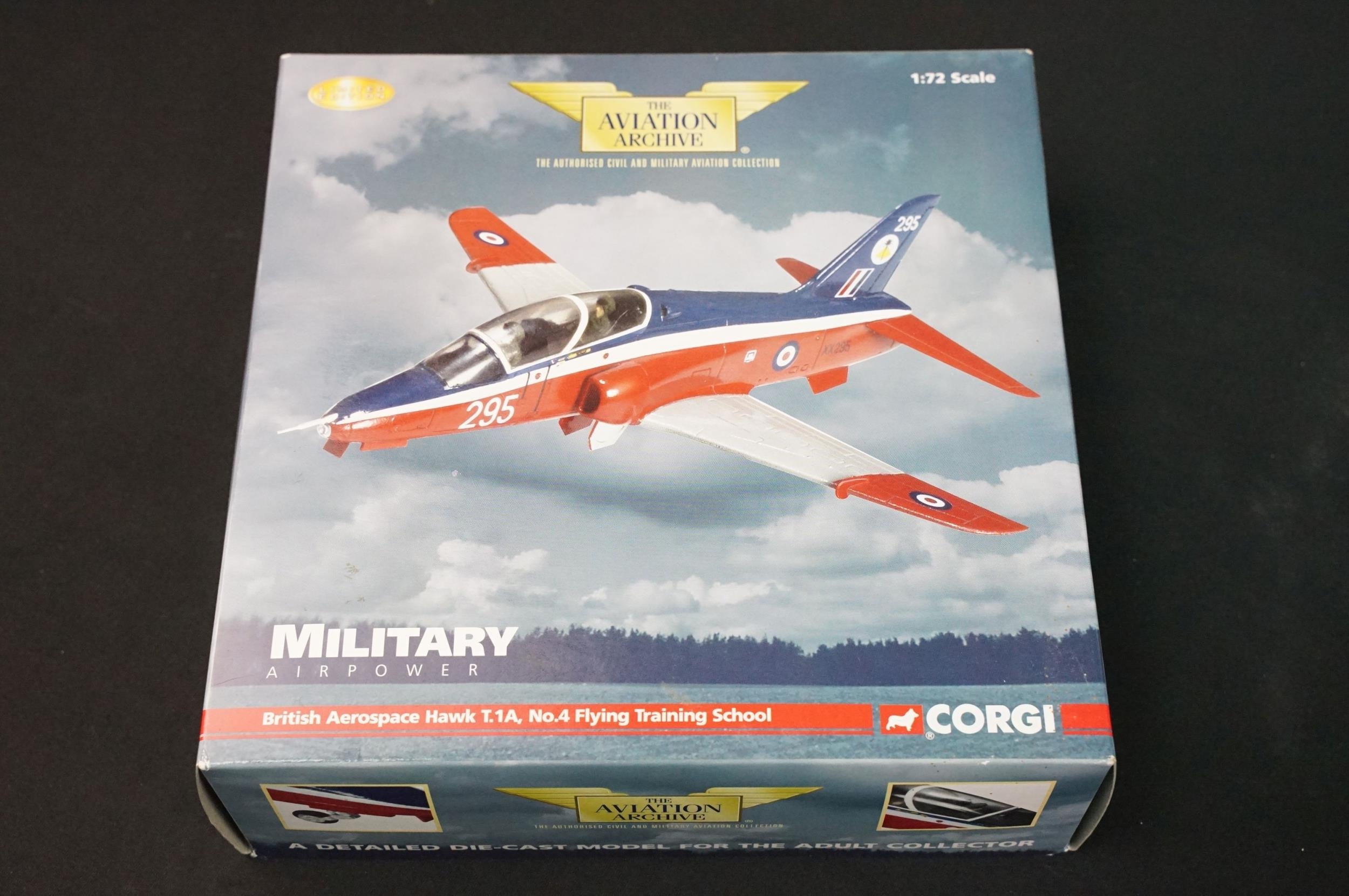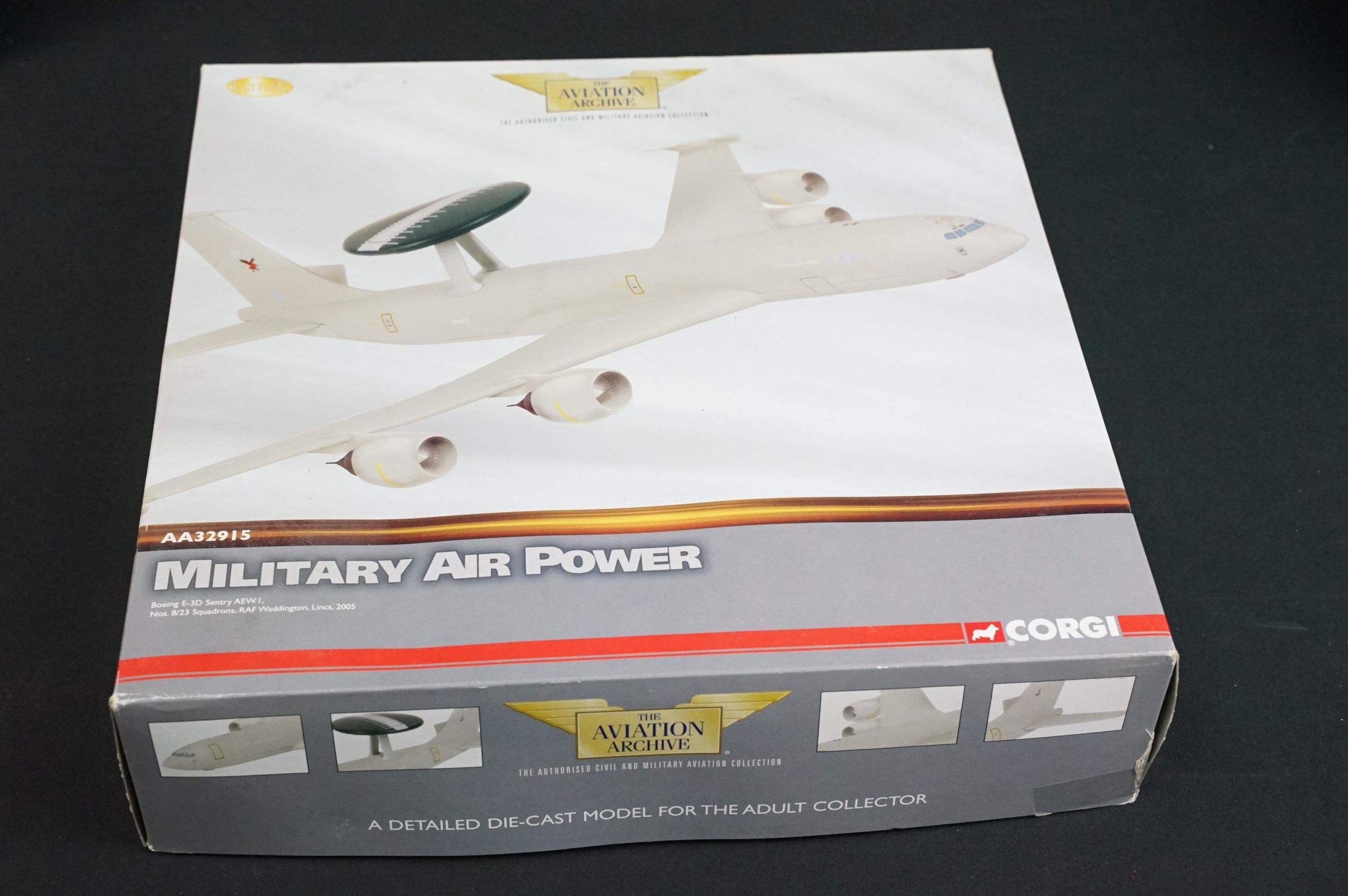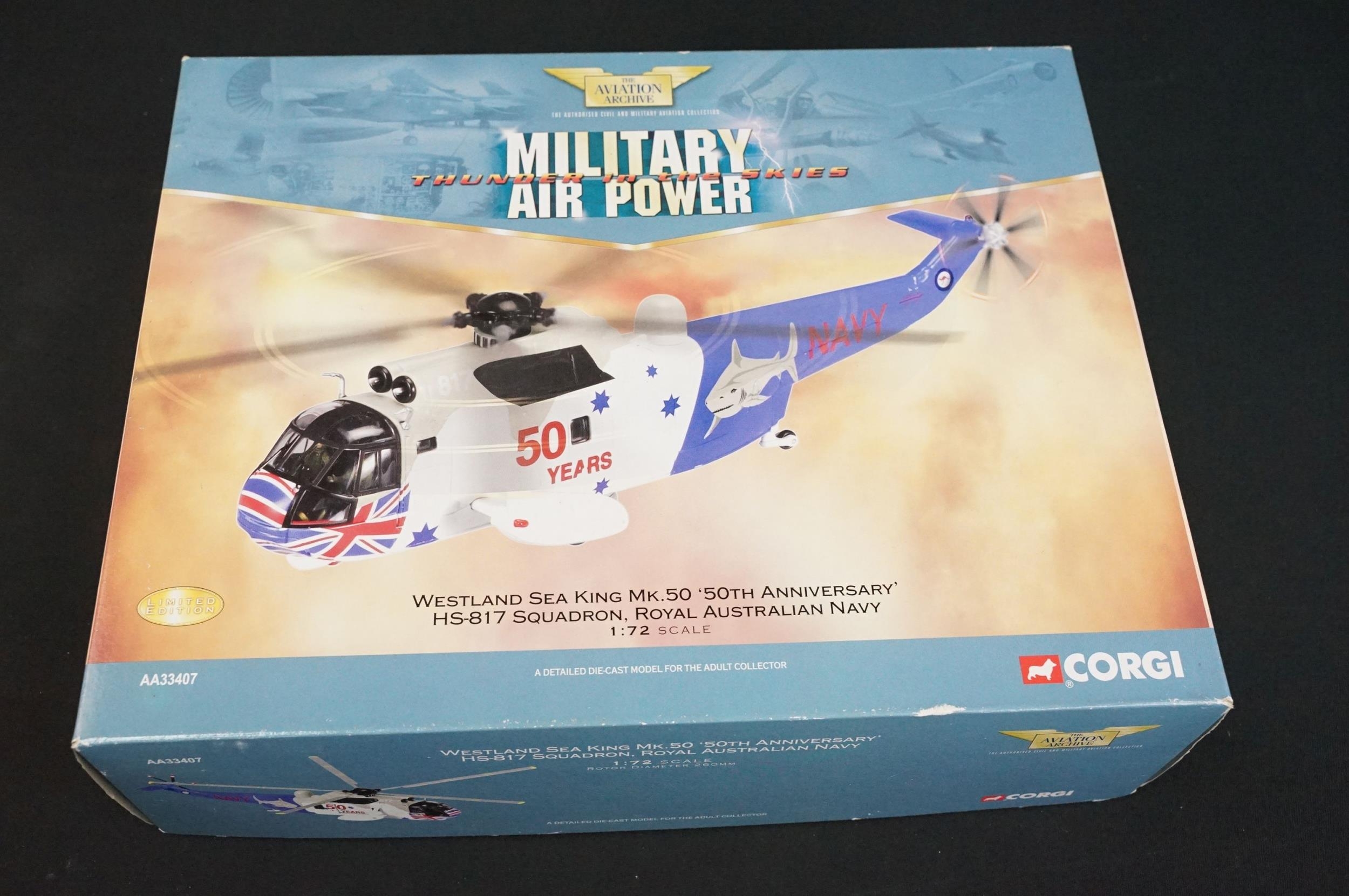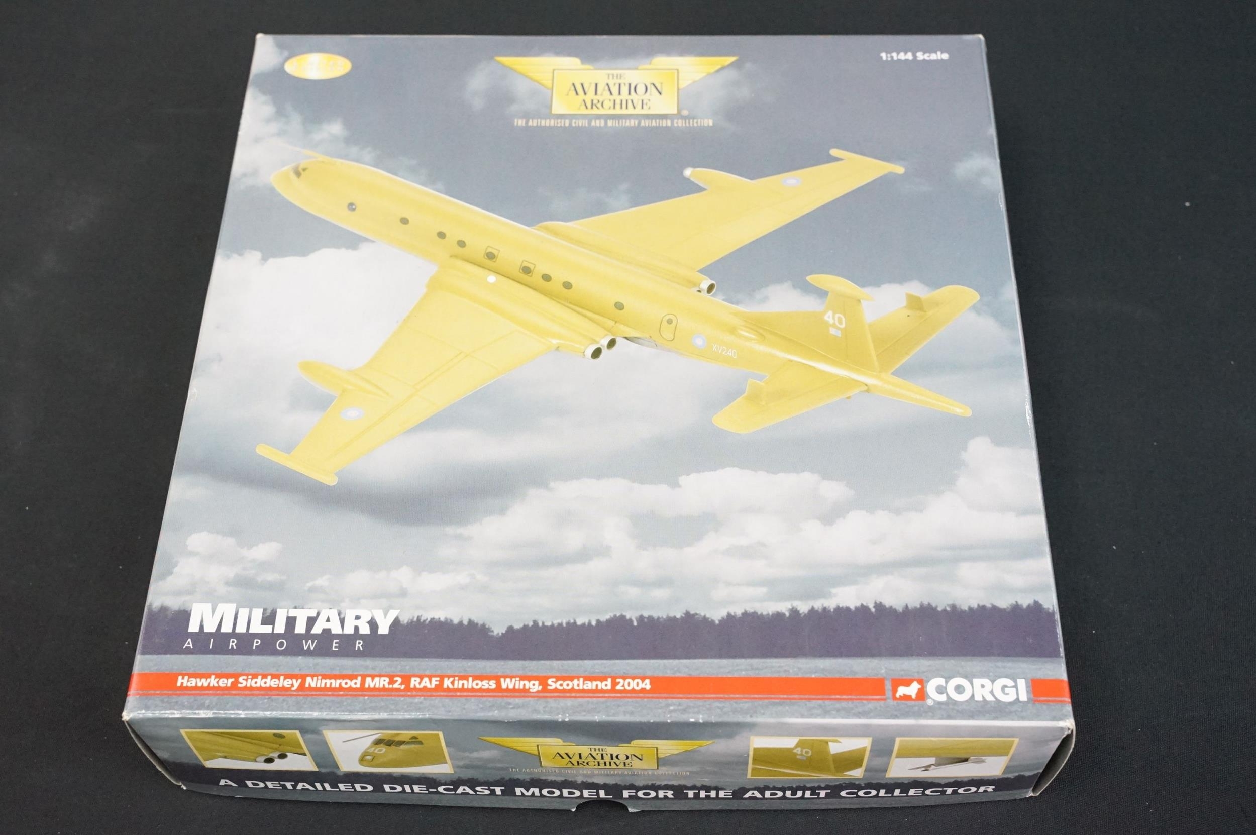 Seven boxed Corgi Aviation Archive Military Air Power diecast models to include AA33503 Boeing B-52D Stratofortress 56-0689 American Air Museum, AA33407 Westland Sea king Mk50 59th Anniversary, AA33601 Panavia Tornado GR 1, AA34102 Hawker Siddeley Bucaneer S Mk 2B, AA32915 Boeing E-3D Sentry AEW1, AA35601 Hawker Siddeley Nimrod MR2 and AA36002 British Aerospace Hawk T1A no 4 Flying School, diecast appears to be complete and ex, boxes vg