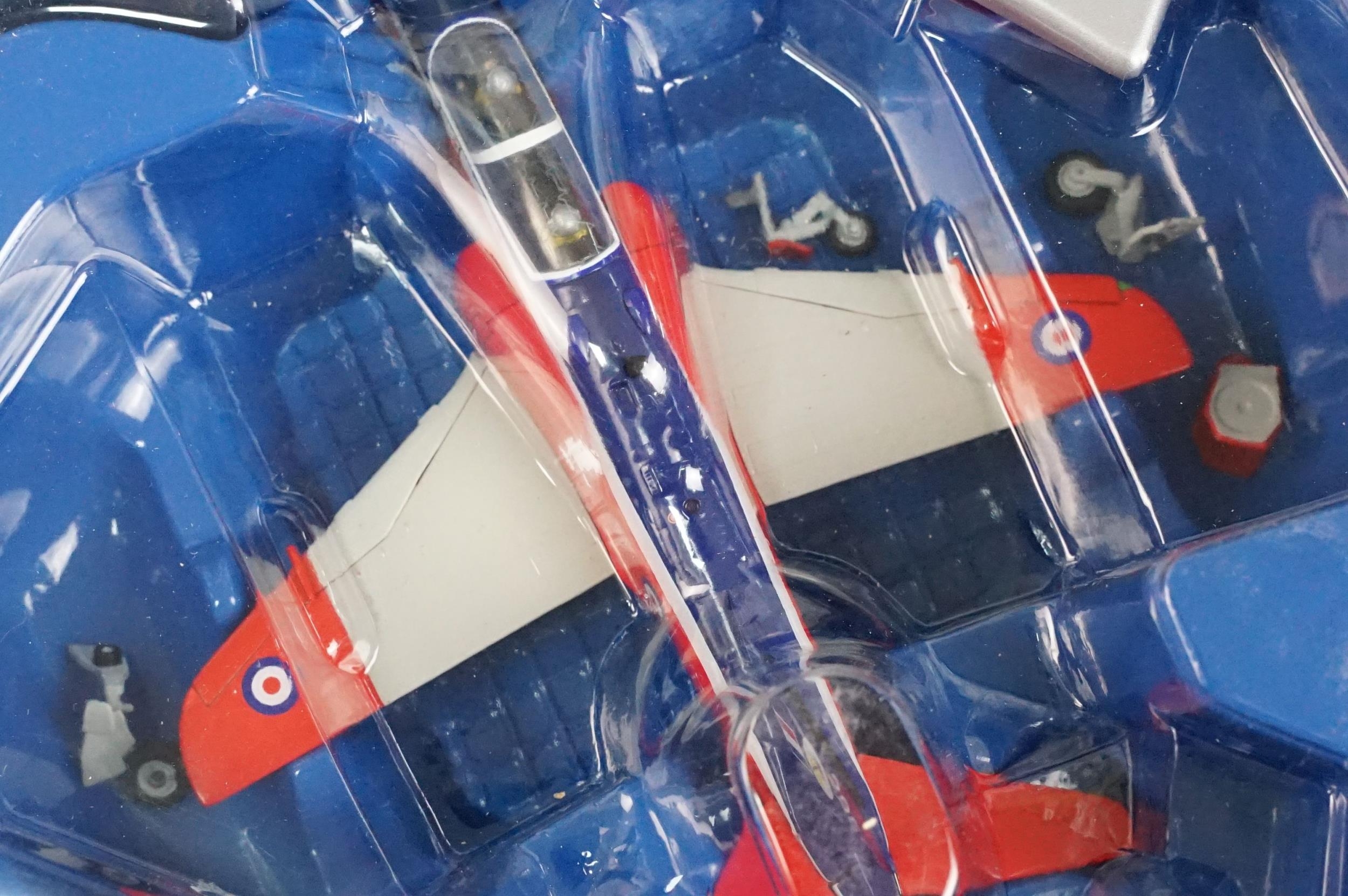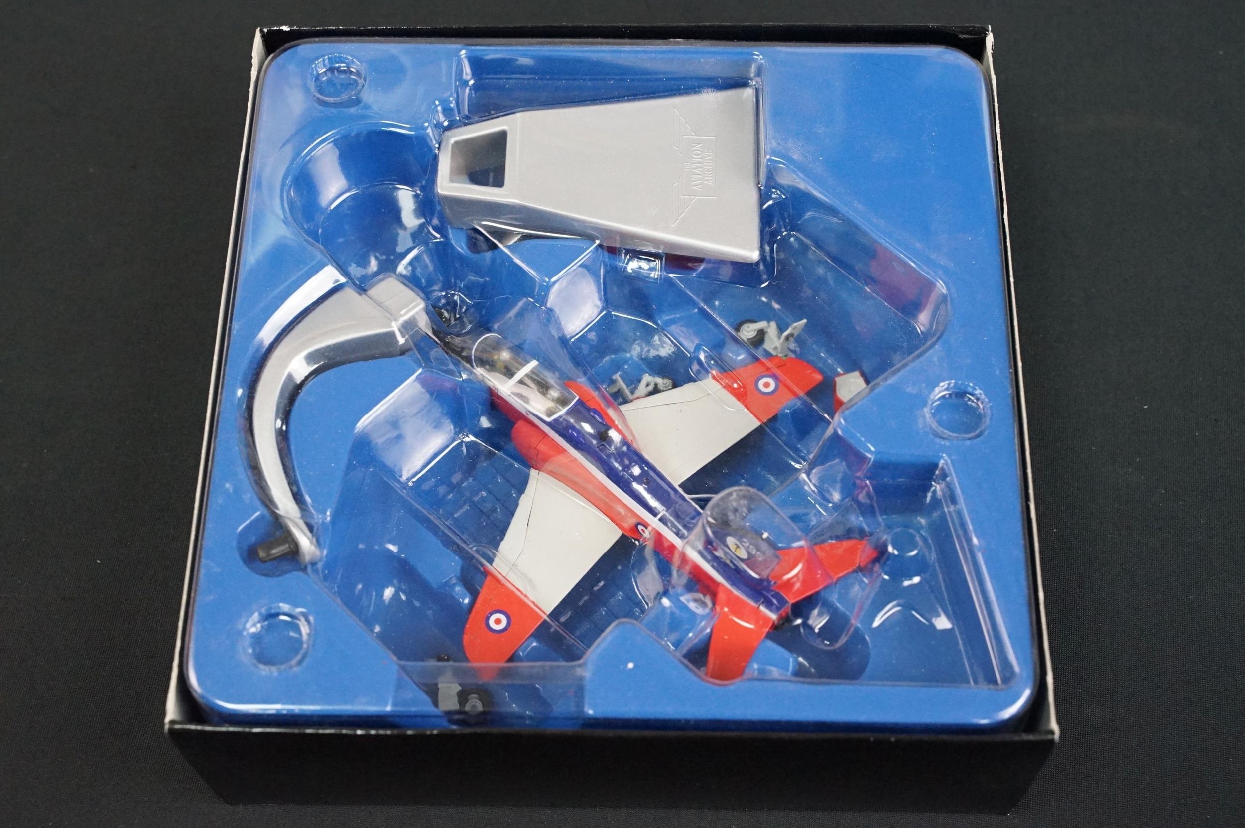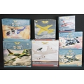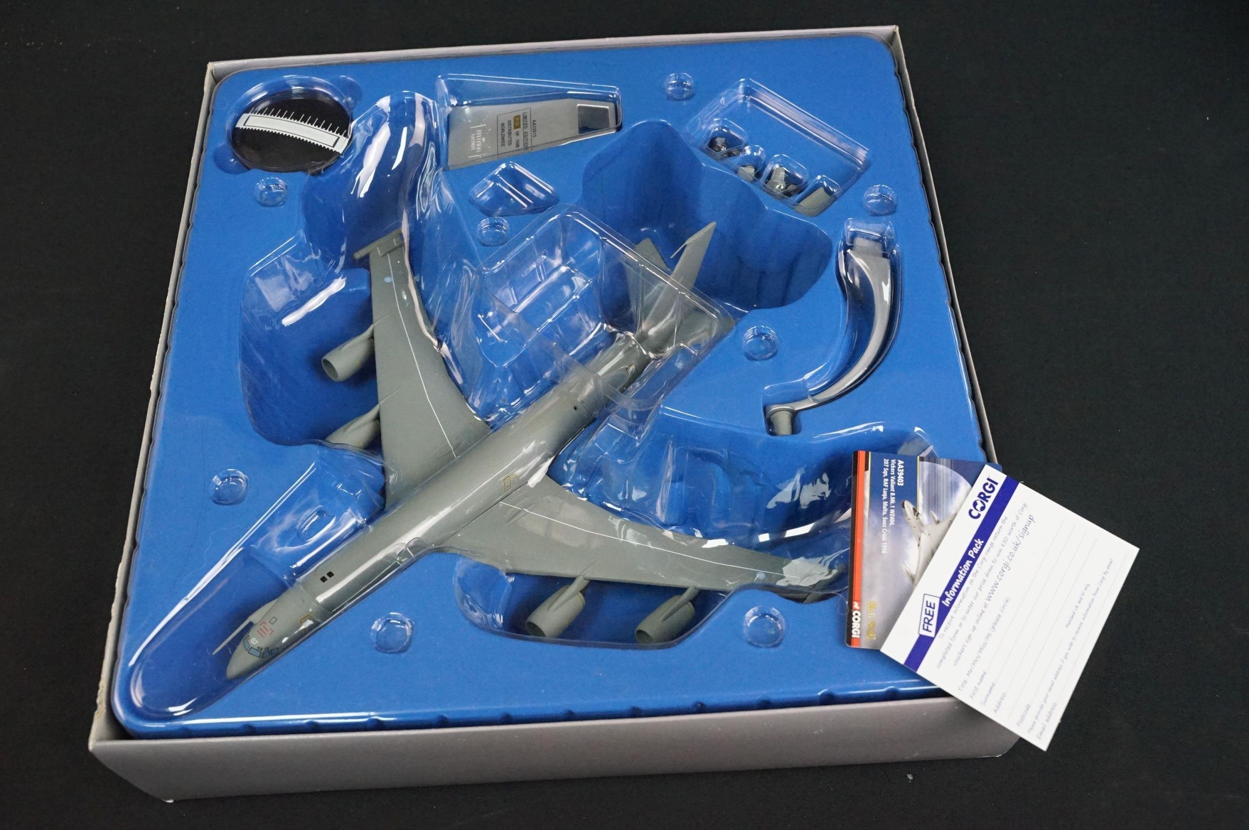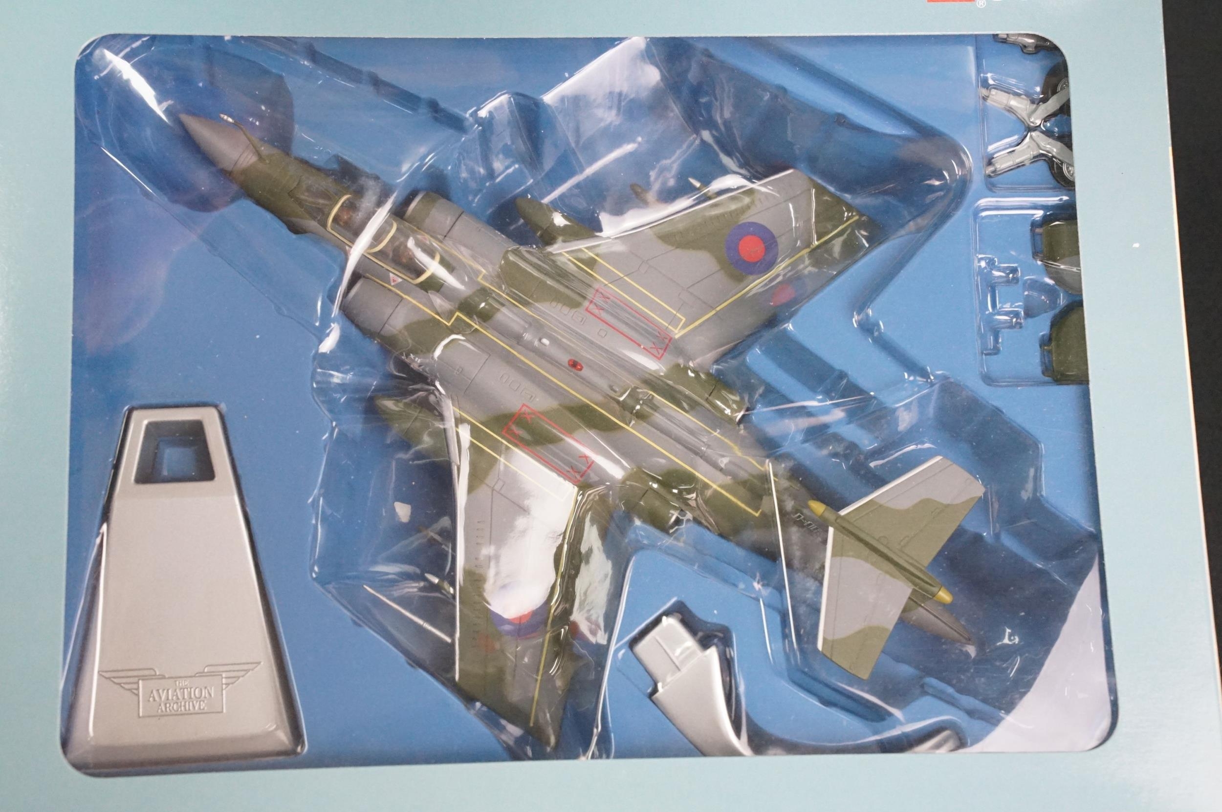 Seven boxed Corgi Aviation Archive Military Air Power diecast models to include AA33503 Boeing B-52D Stratofortress 56-0689 American Air Museum, AA33407 Westland Sea king Mk50 59th Anniversary, AA33601 Panavia Tornado GR 1, AA34102 Hawker Siddeley Bucaneer S Mk 2B, AA32915 Boeing E-3D Sentry AEW1, AA35601 Hawker Siddeley Nimrod MR2 and AA36002 British Aerospace Hawk T1A no 4 Flying School, diecast appears to be complete and ex, boxes vg