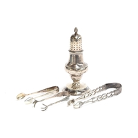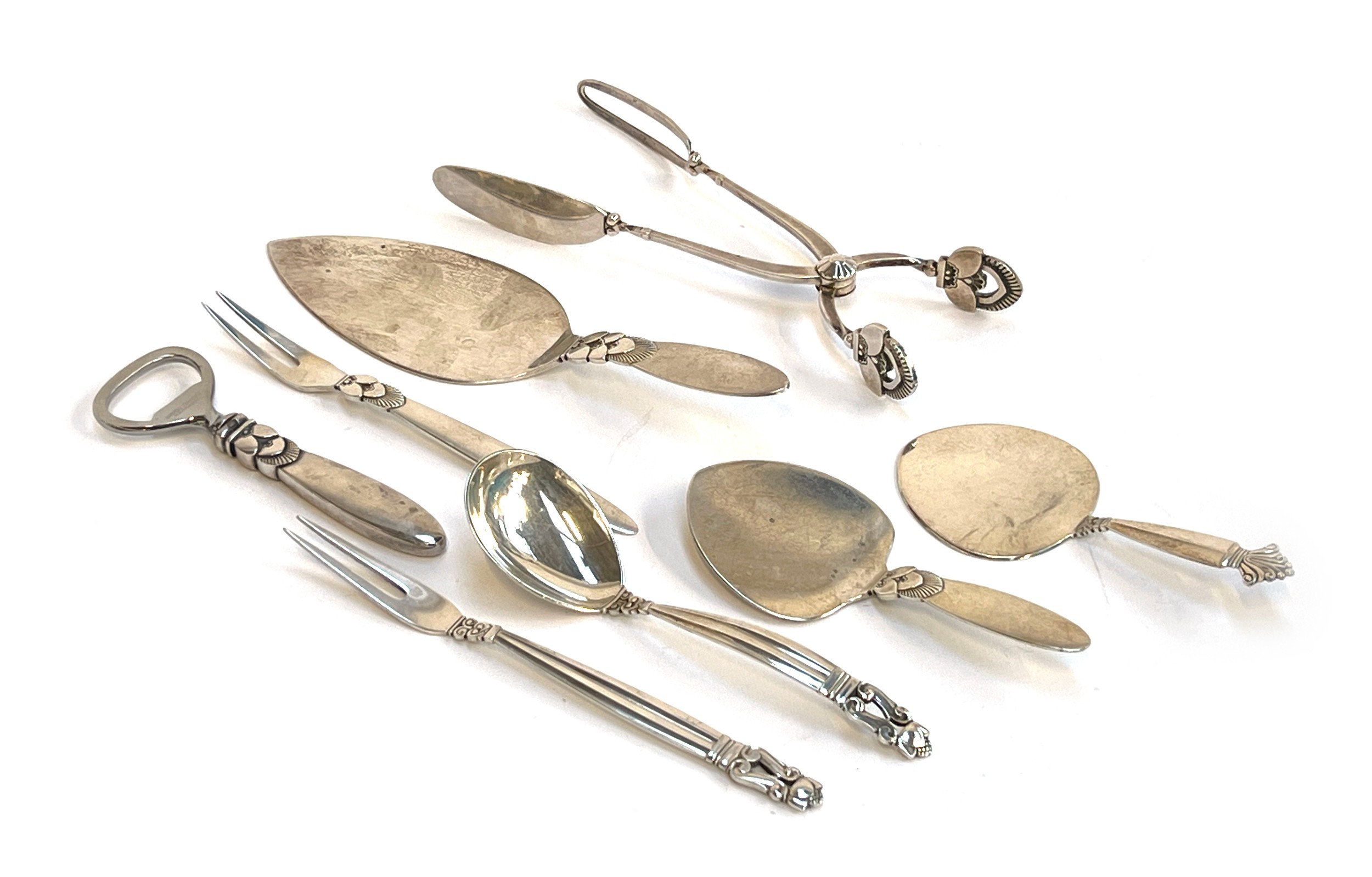 A collection Georg Jensen sterling silver, comprising a cake slice, sugar tongs, two pronged fork, two smaller slices, and a bottle opener, in cactus pattern; together with a spoon and fork pair, stamped 'Sterling Denmark' and 'Georg Jensen', total weight 11.5ozt