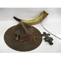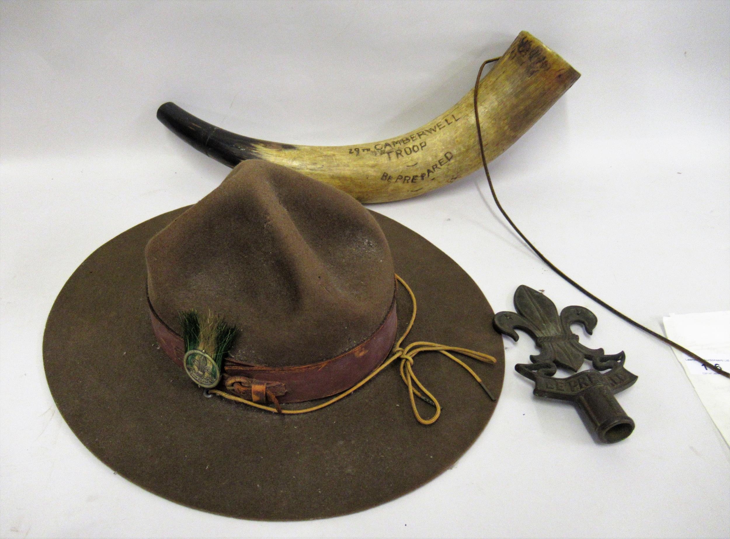 Scouting interest: Scout shop hat with leather band and badge, a cow horn inscribed ' 29th Camberwell Troop, Be Prepared ' and a Fleur de Lys staff top, inscribed ' Be Prepared '
