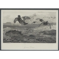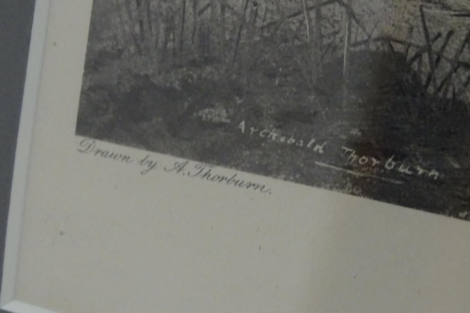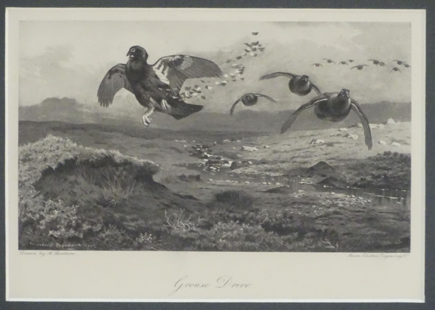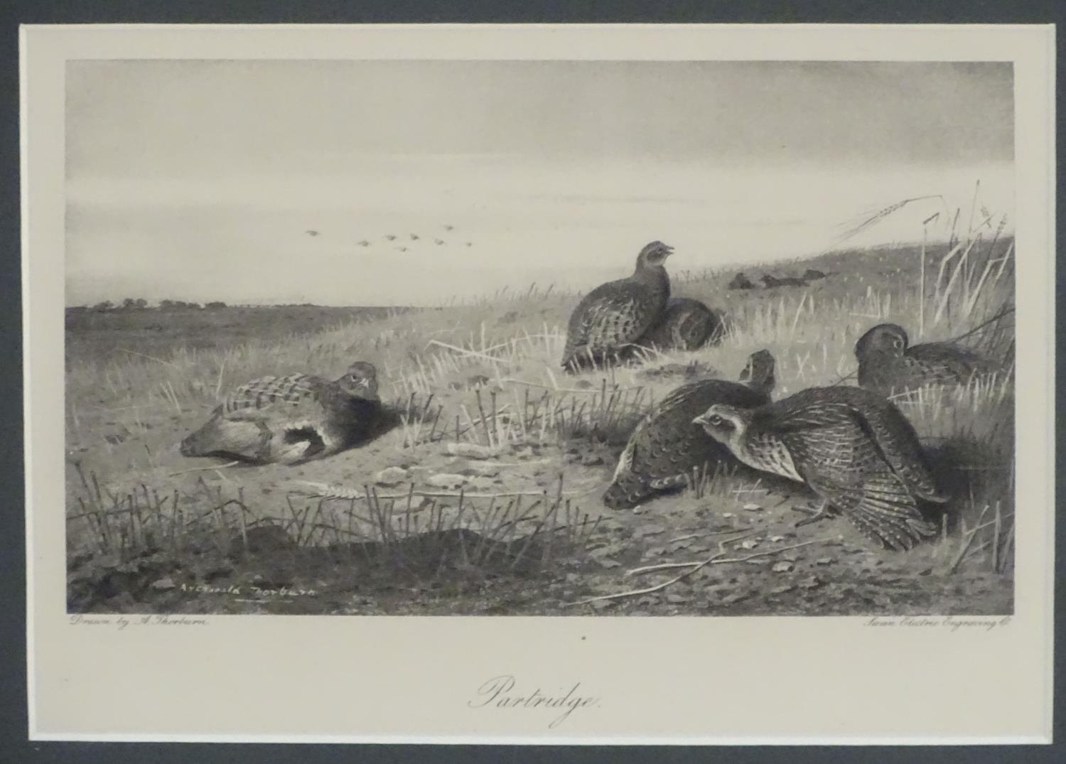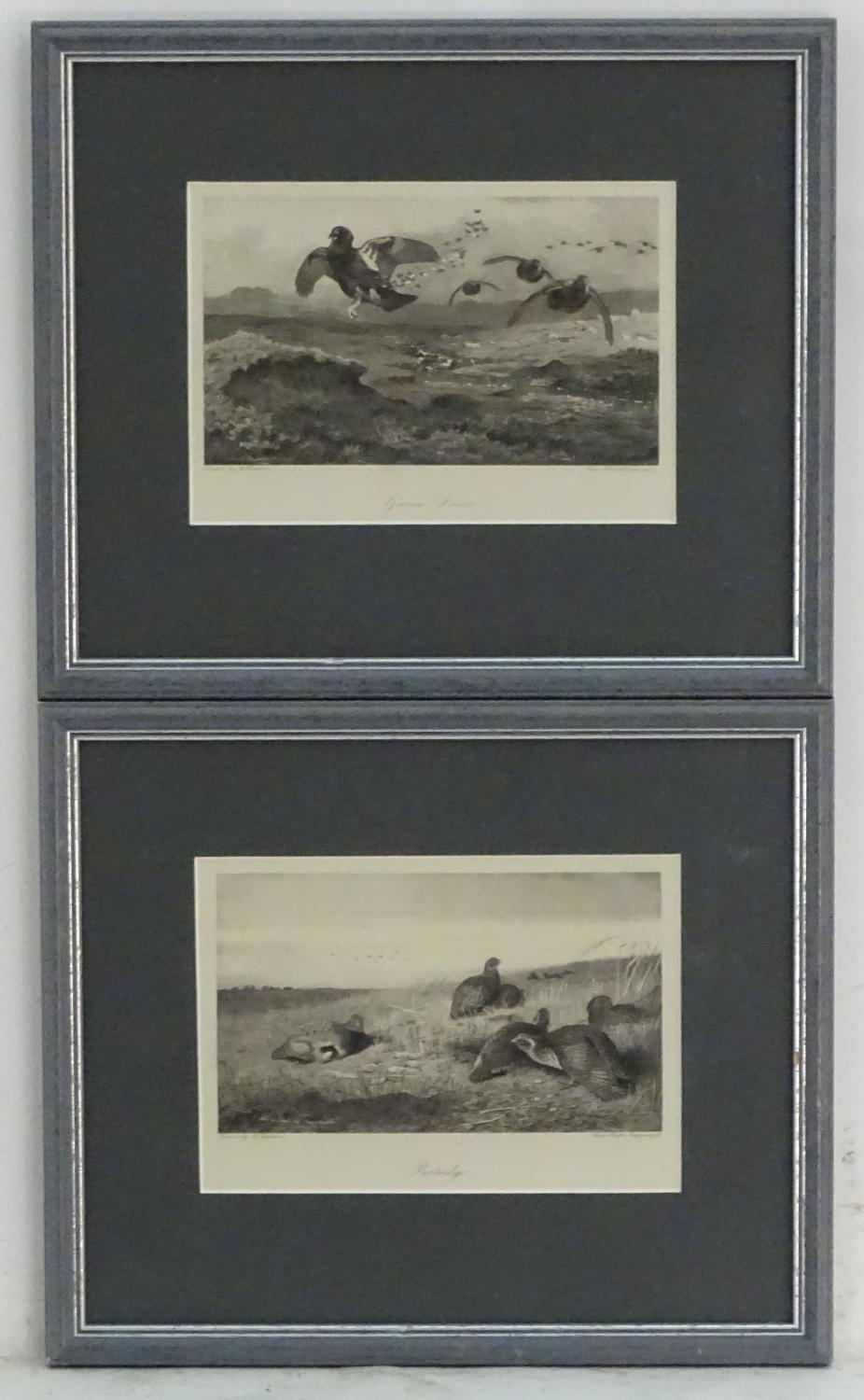After Archibald Thornburn (1860-1935), Scottish School, Engravings, A pair of ornithological prints depicting birds in landscapes. Both titled under Grouse Drive and Partridge respectively. Approx. 4" x 7" (2)