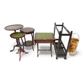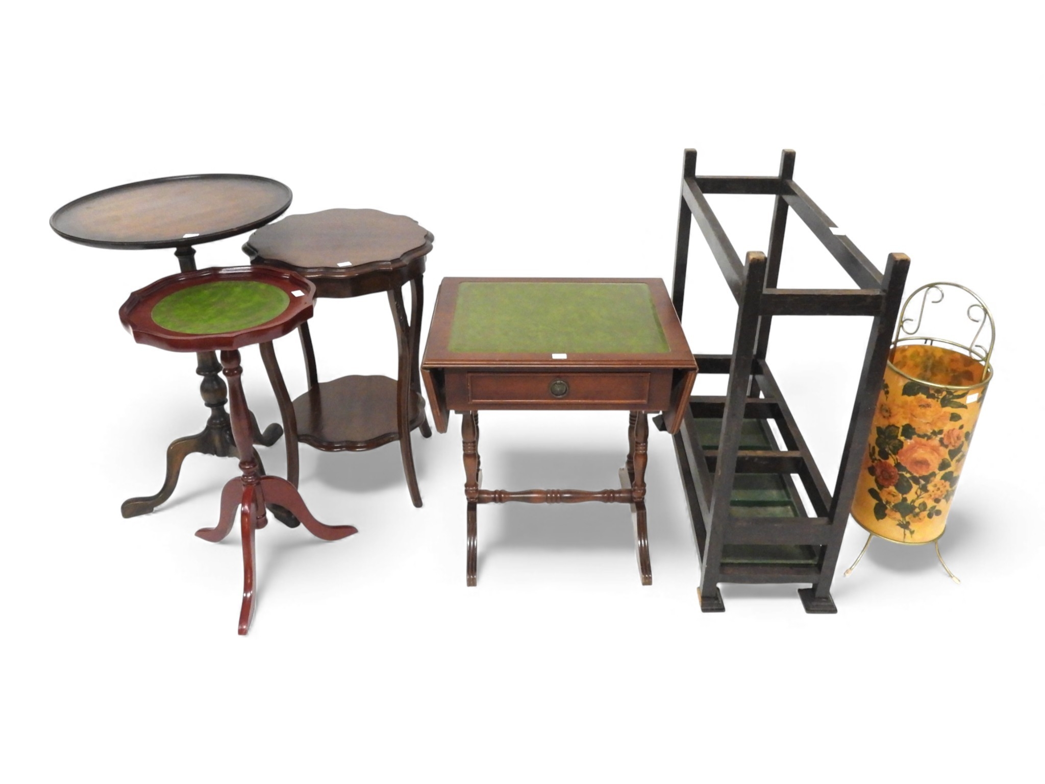 A mixed lot comprising a two tier occasional table, two assorted tripod based occasional tables, small drop leaf occasional table and two assorted umbrella stands (6)