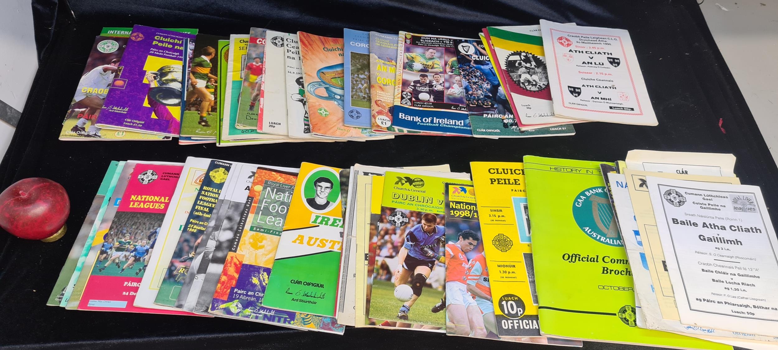 A large array of vintage As Gaeilge GAA football souvenir programmes.