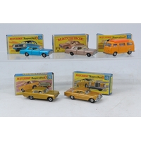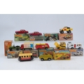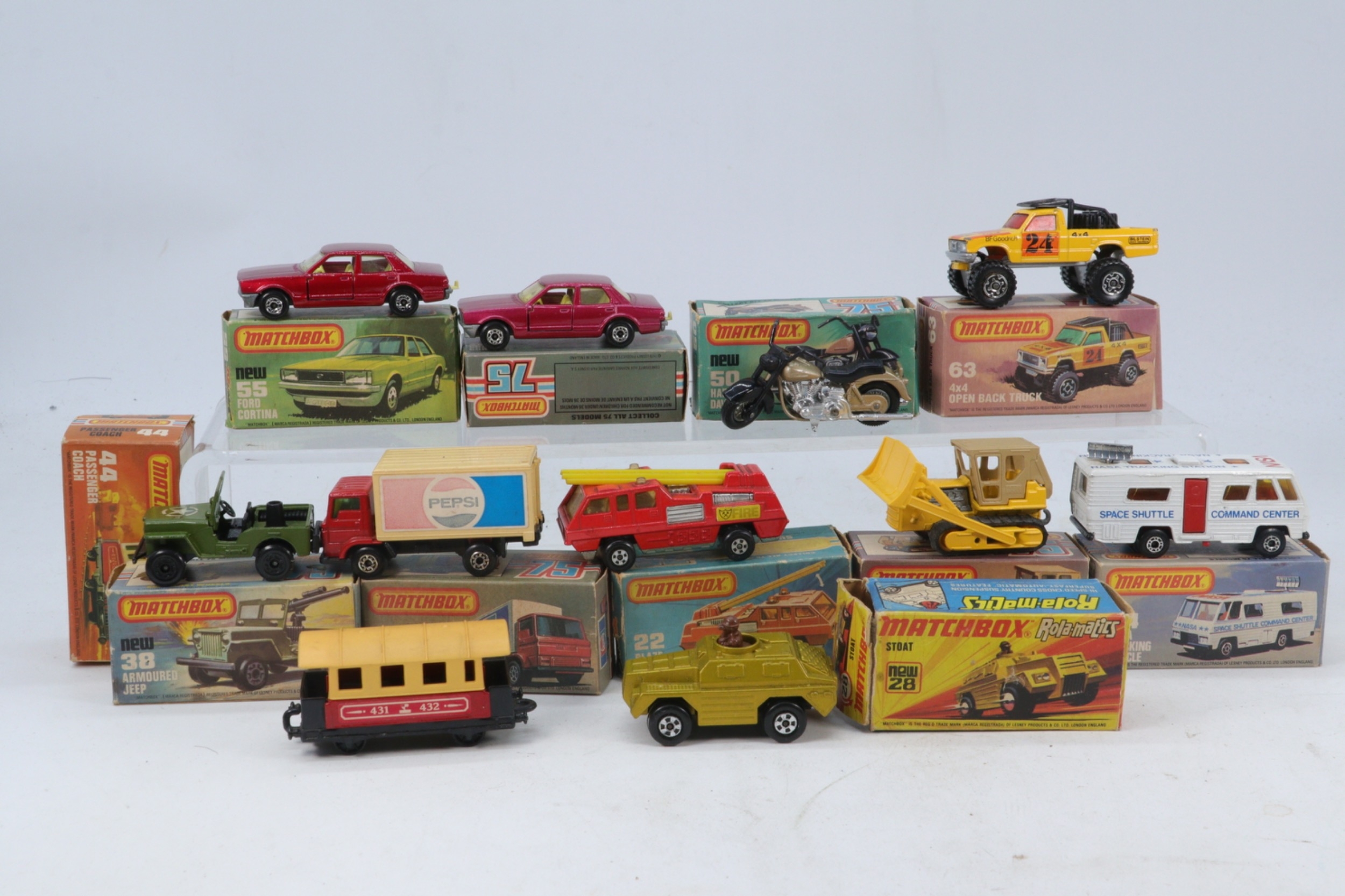 A selection of matchbox 75 and others 55 Ford Cortina, 62 Chevrolet Corvette, 50 Harley Davidson, 63 4X4 Open back truck, 72 Dodge Delivery Truck, 64 Caterpillar D-9 Tractor, 22 Blaze Buster, 38 Armoured Jeep, 44 Passenger Coach, 54 Nasa Tracking Vehicle and 28 Rola-matics Stoat