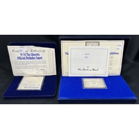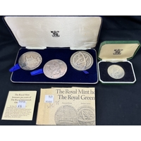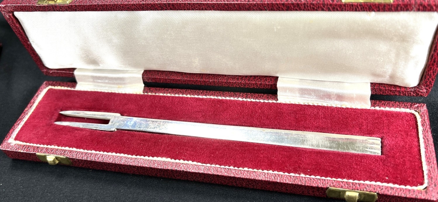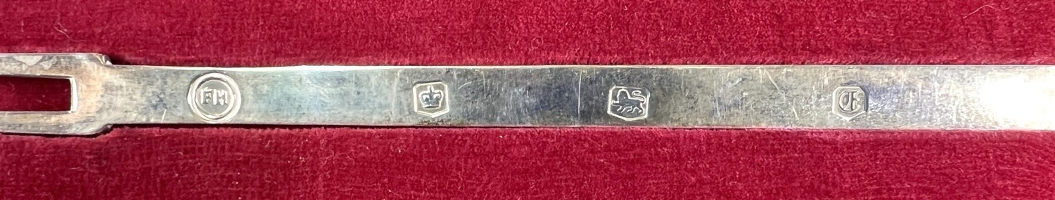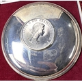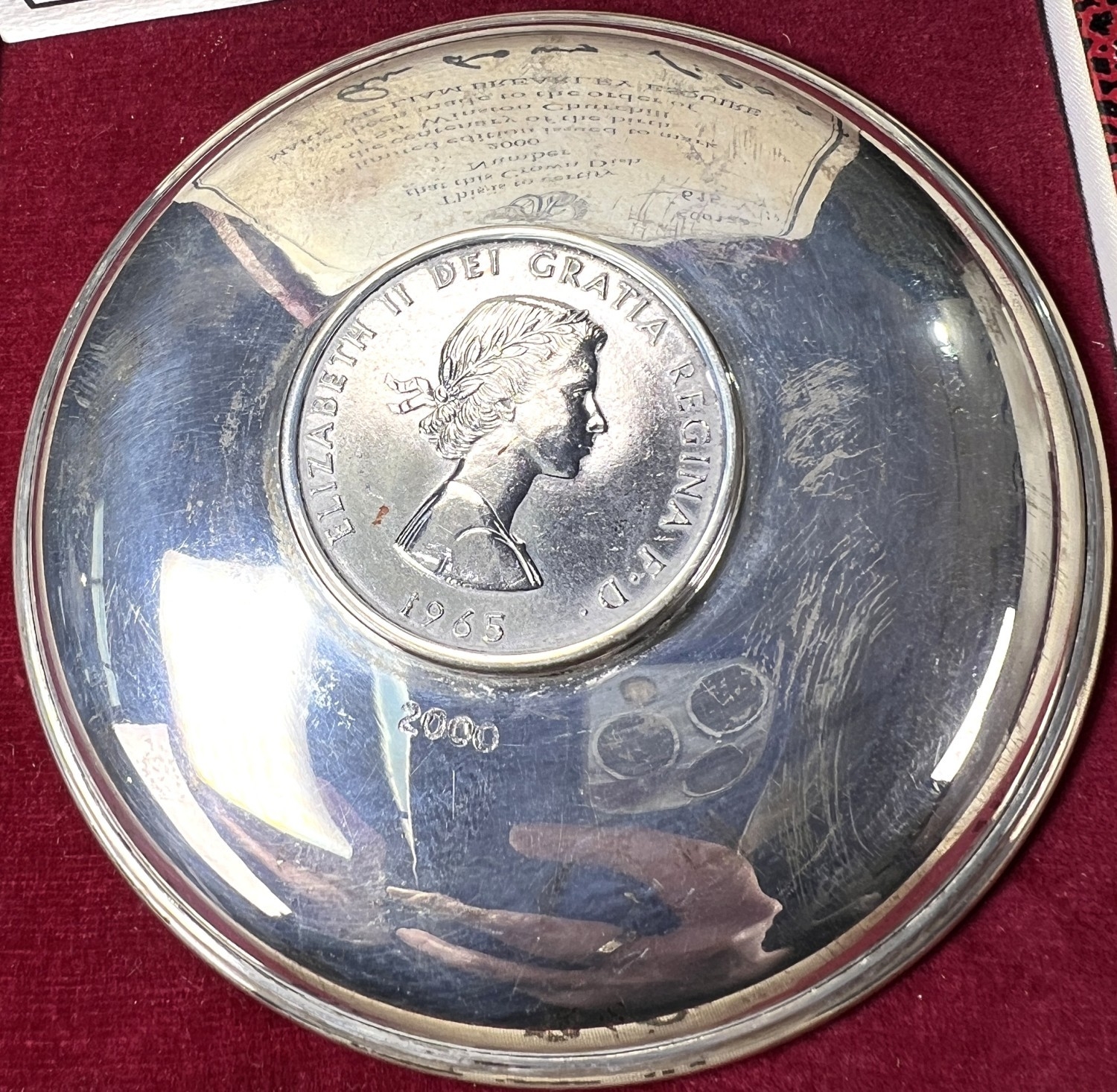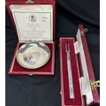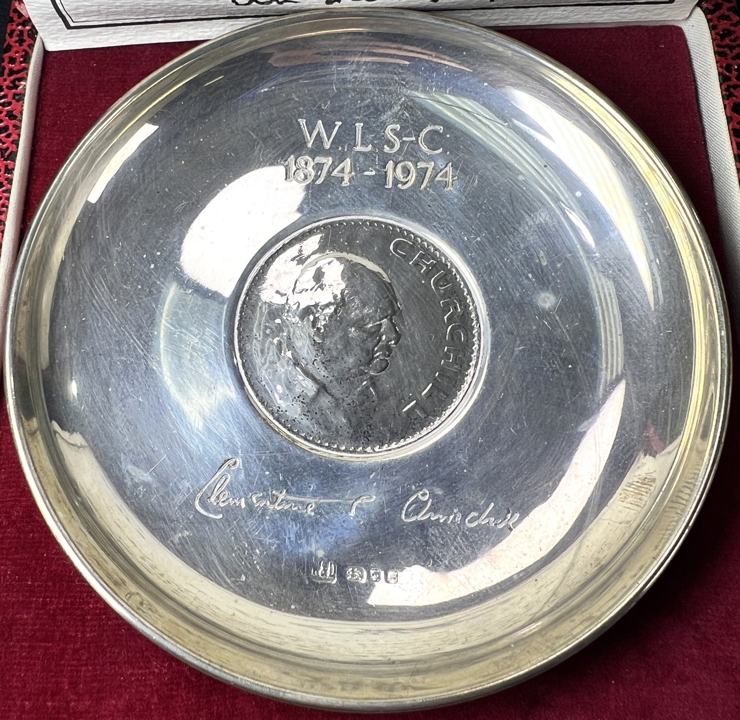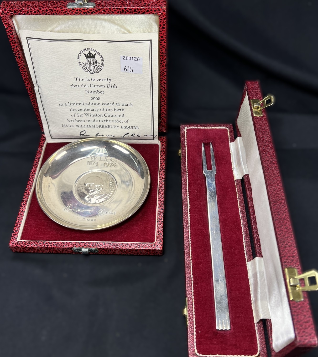 A boxed hallmarked silver Churchill dish, Limited Edition, a boxed commemorative Silver Jubilee pickle fork, Sheffield 1973, gross 4ozt