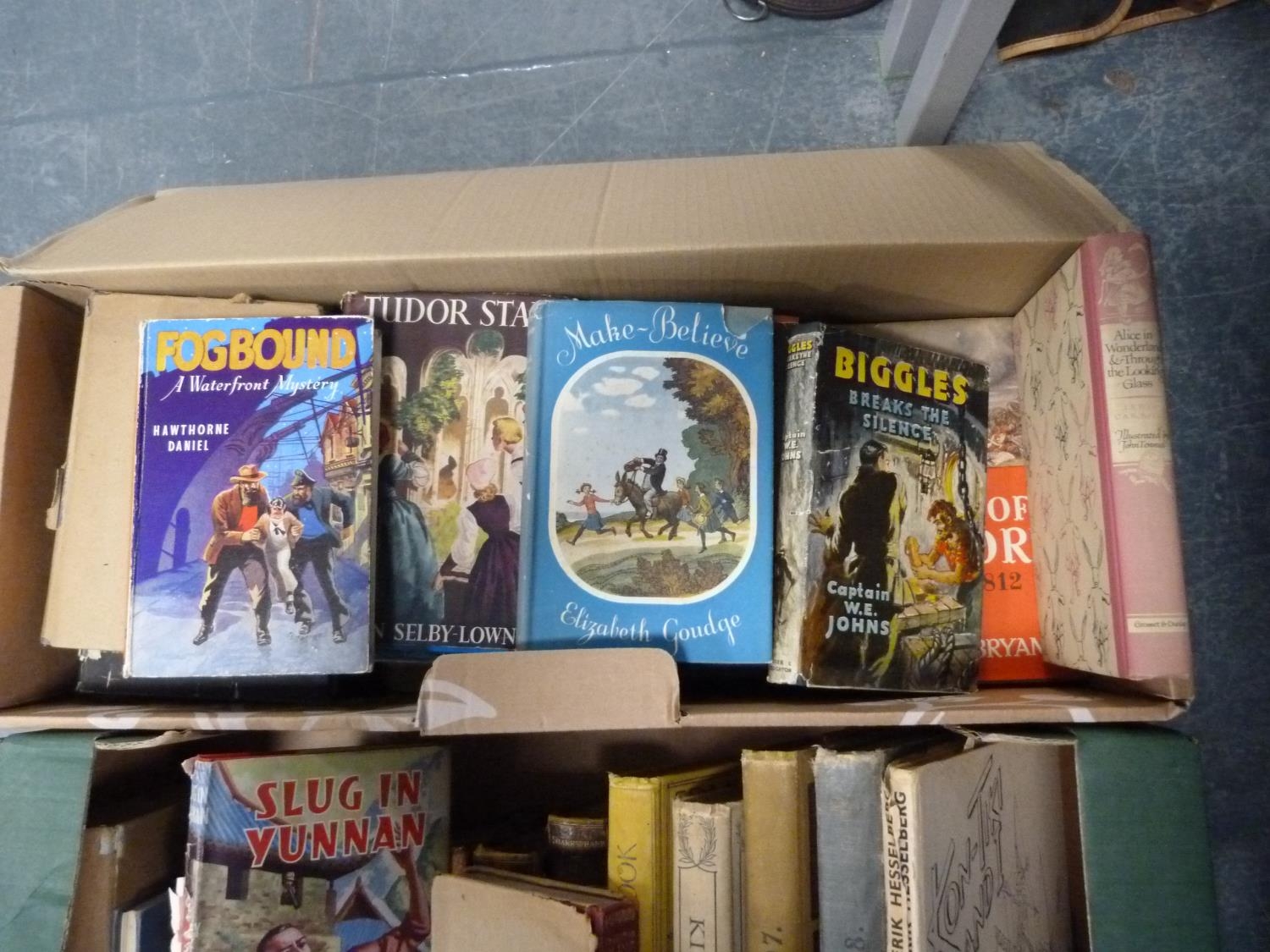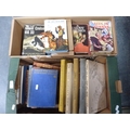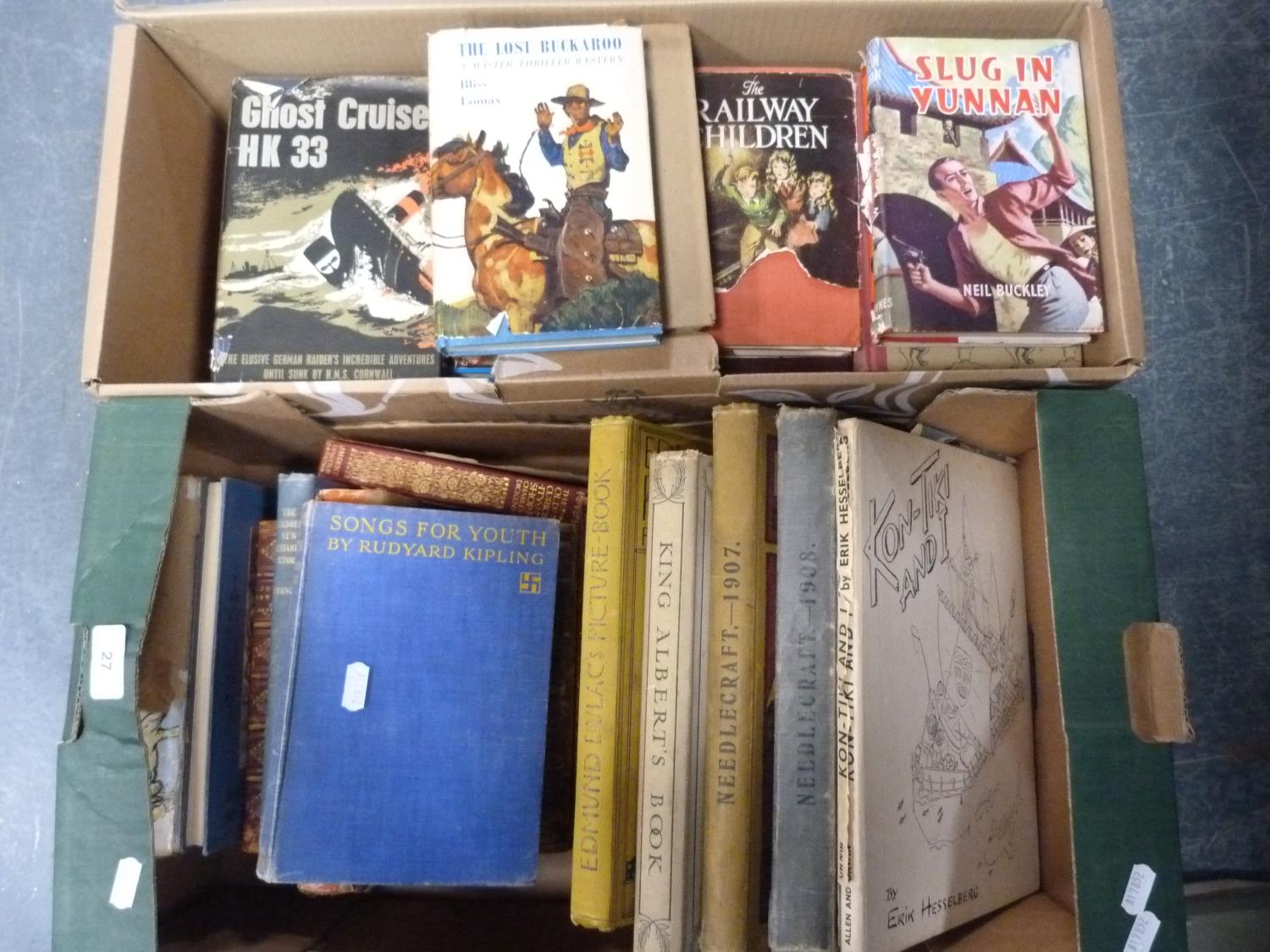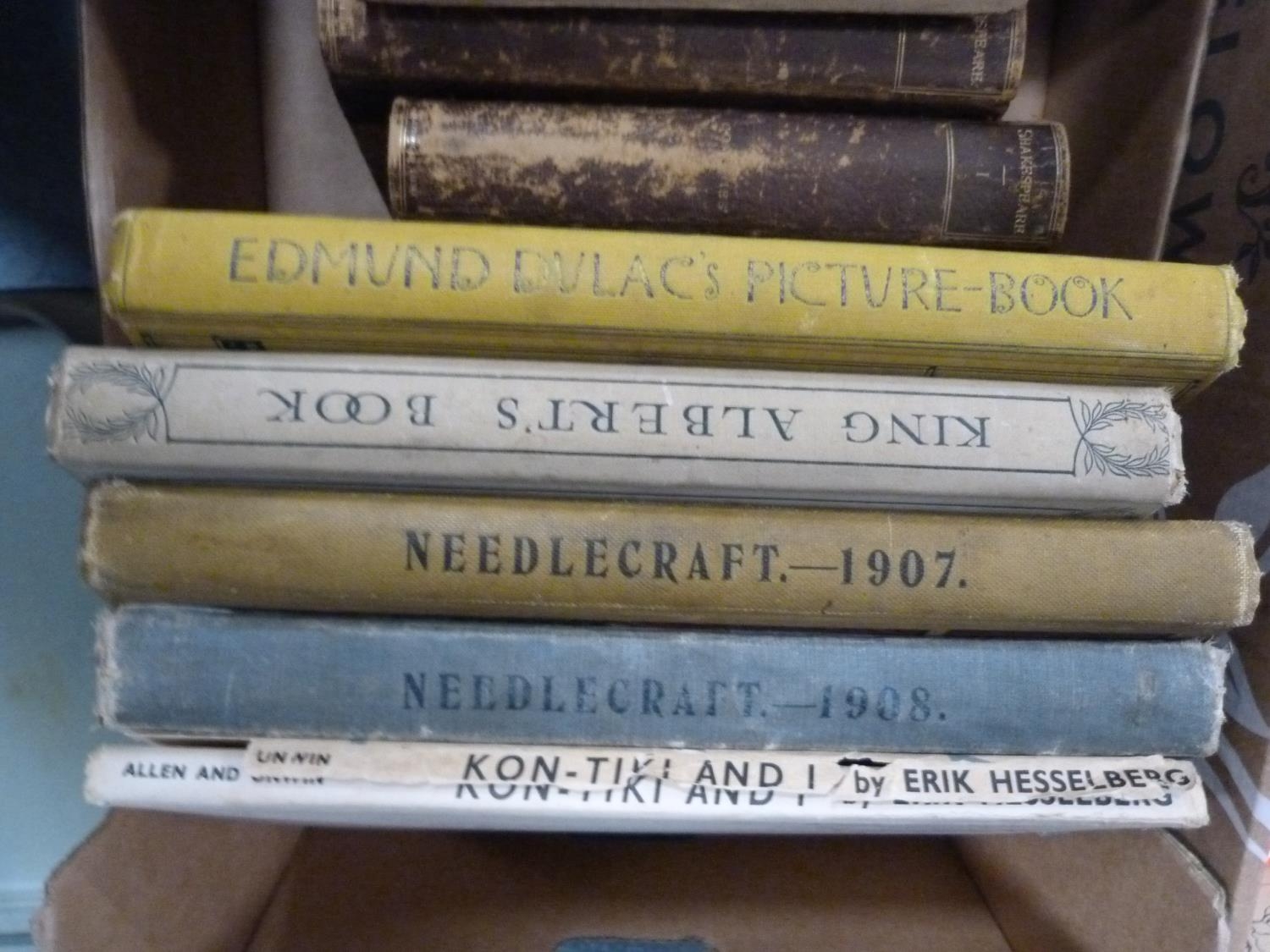 Two boxes of assorted books to include Needlecraft Monthly Magazine, vol. 1, 1907, Needlecraft 1908, leather-bound books, Rudyard Kipling's Songs for Youth, The Railway Children, King Albert's Book, assorted children's and other books.