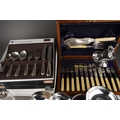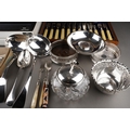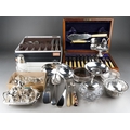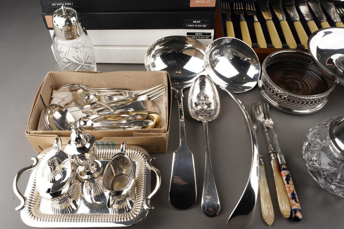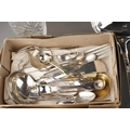 A box of boxed, cased and loose silver plate including boxed and loose cutlery, including two soup ladles, four boxed place settings of Arthur Price bead pattern cutlery, an oak cased set of fish eaters and servers, etc (1 box)