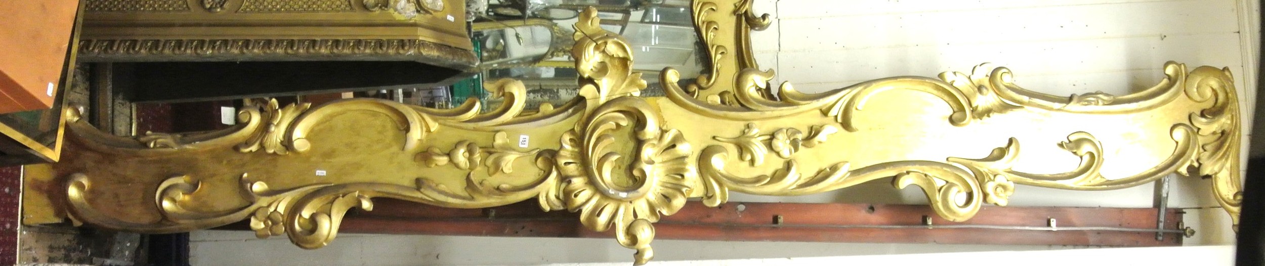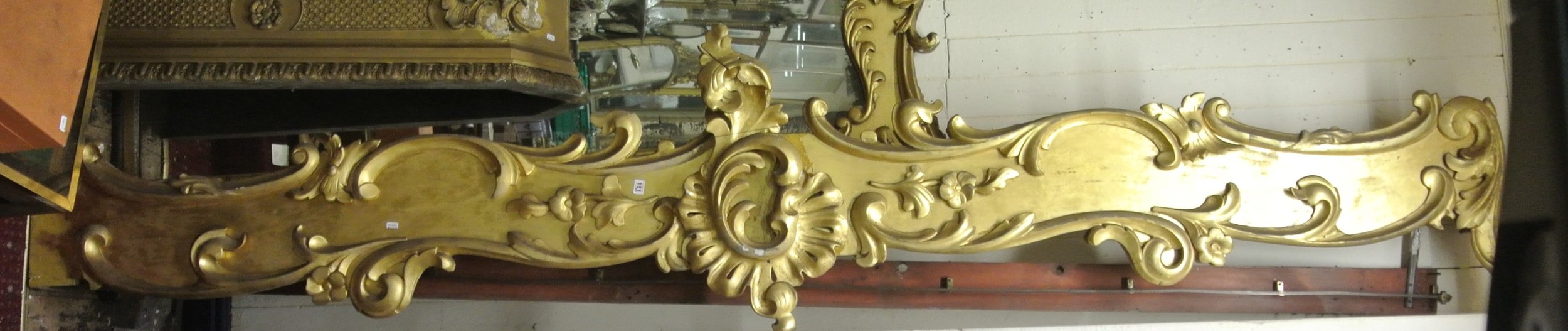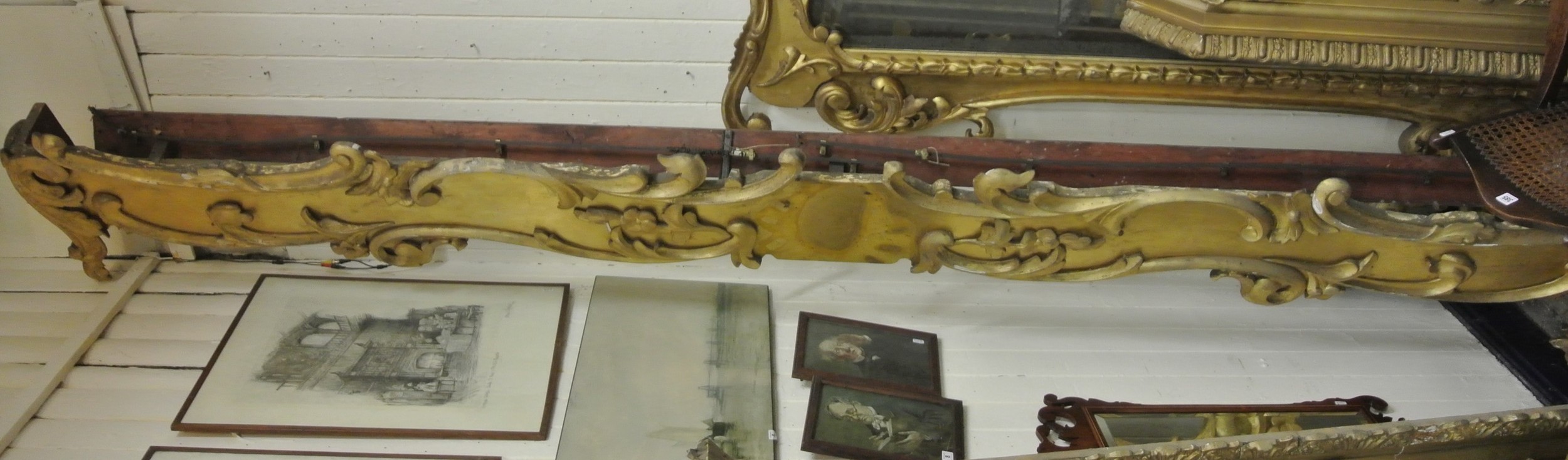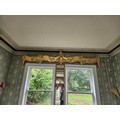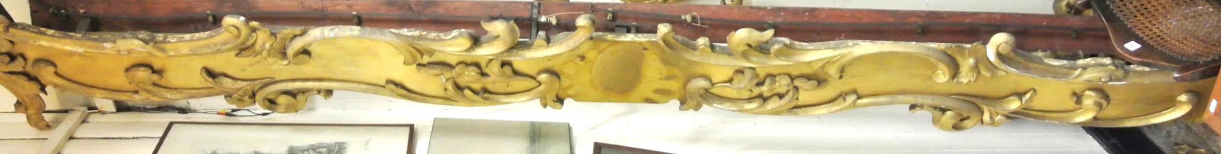Pair of long parcel gilt and timber pelmets with ornate scroll & foliate decoration & central medallions. L 330 X Dv50 cm