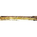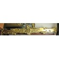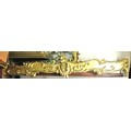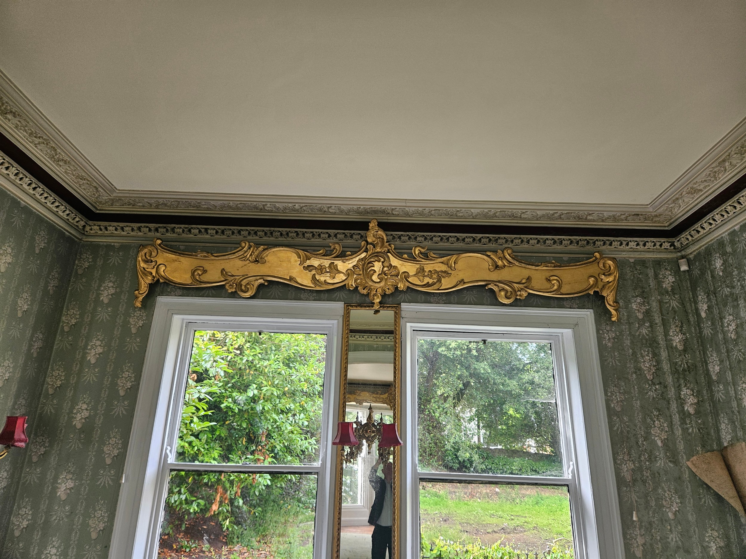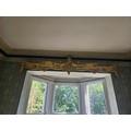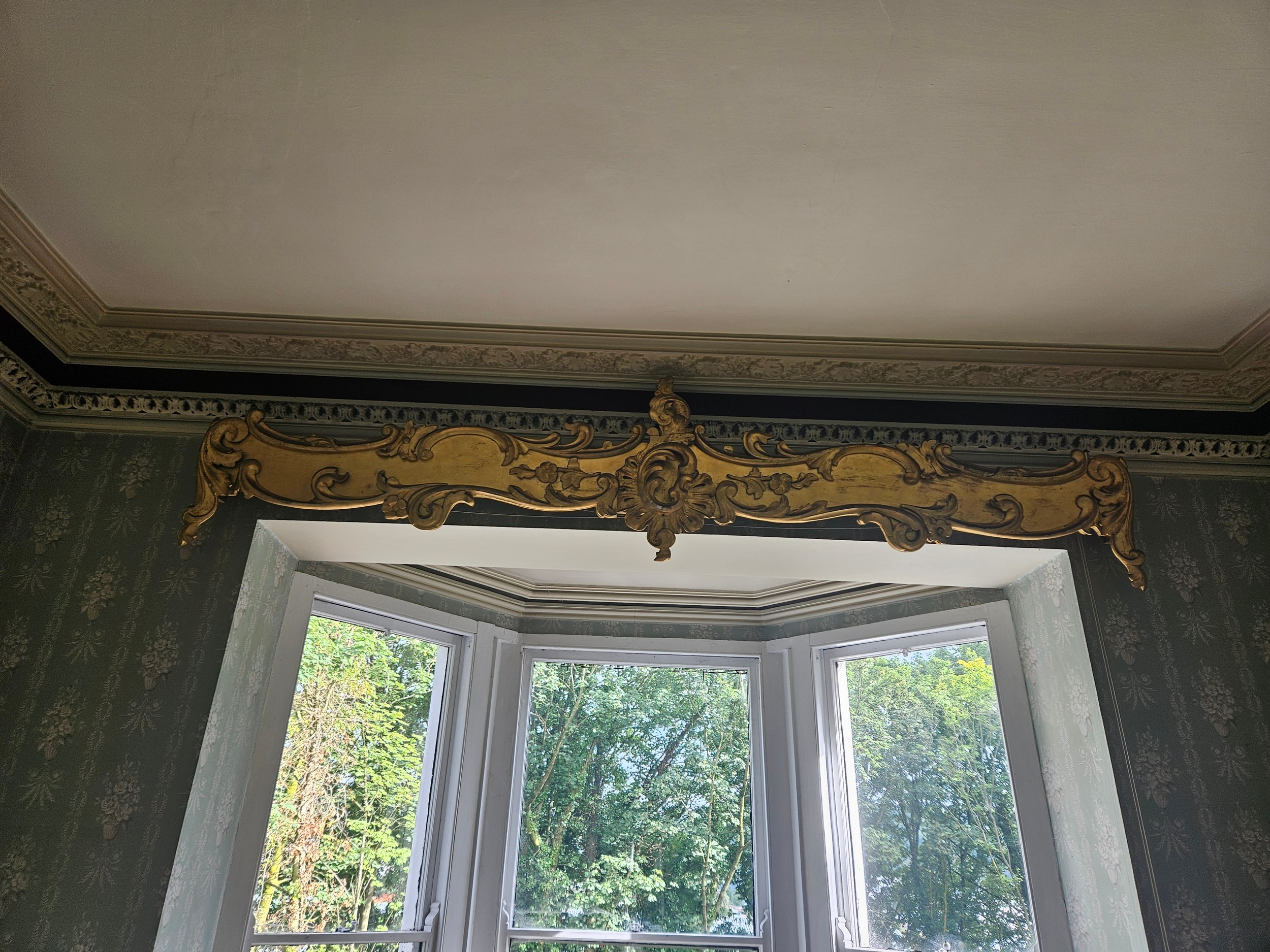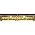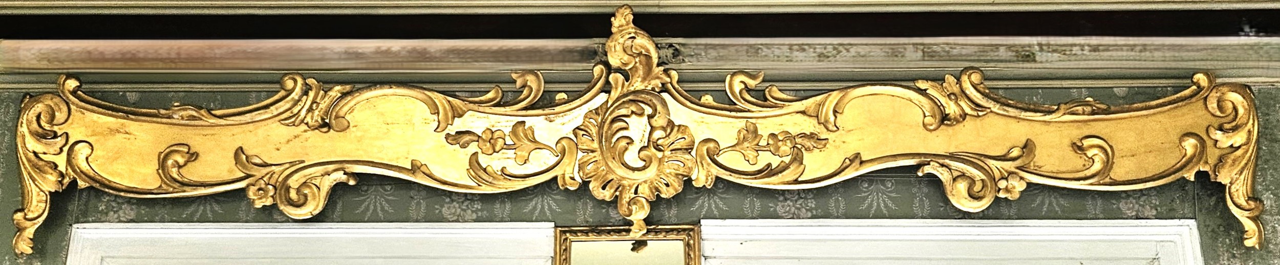 Pair of long parcel gilt and timber pelmets with ornate scroll & foliate decoration & central medallions. L 330 X Dv50 cm