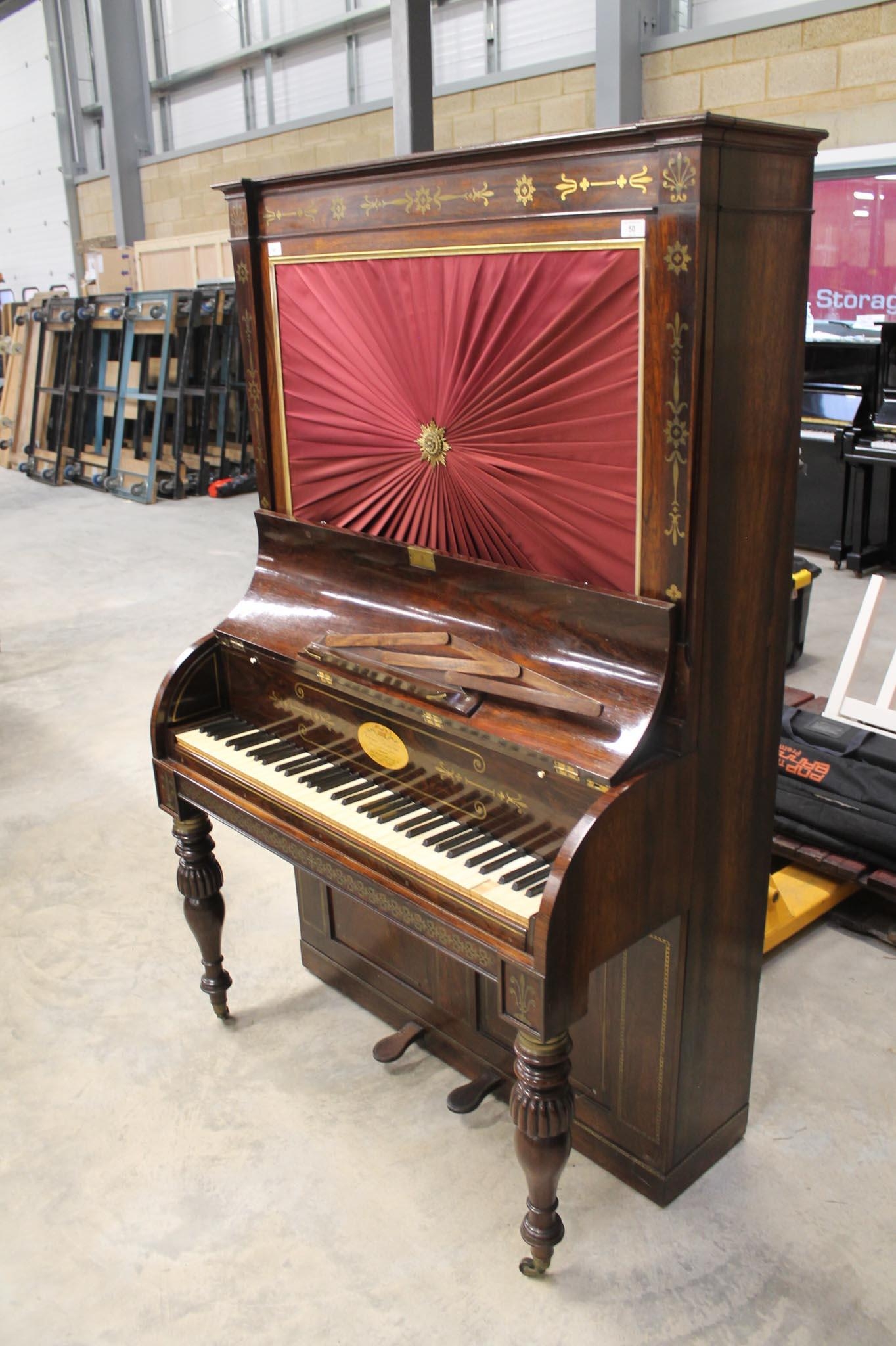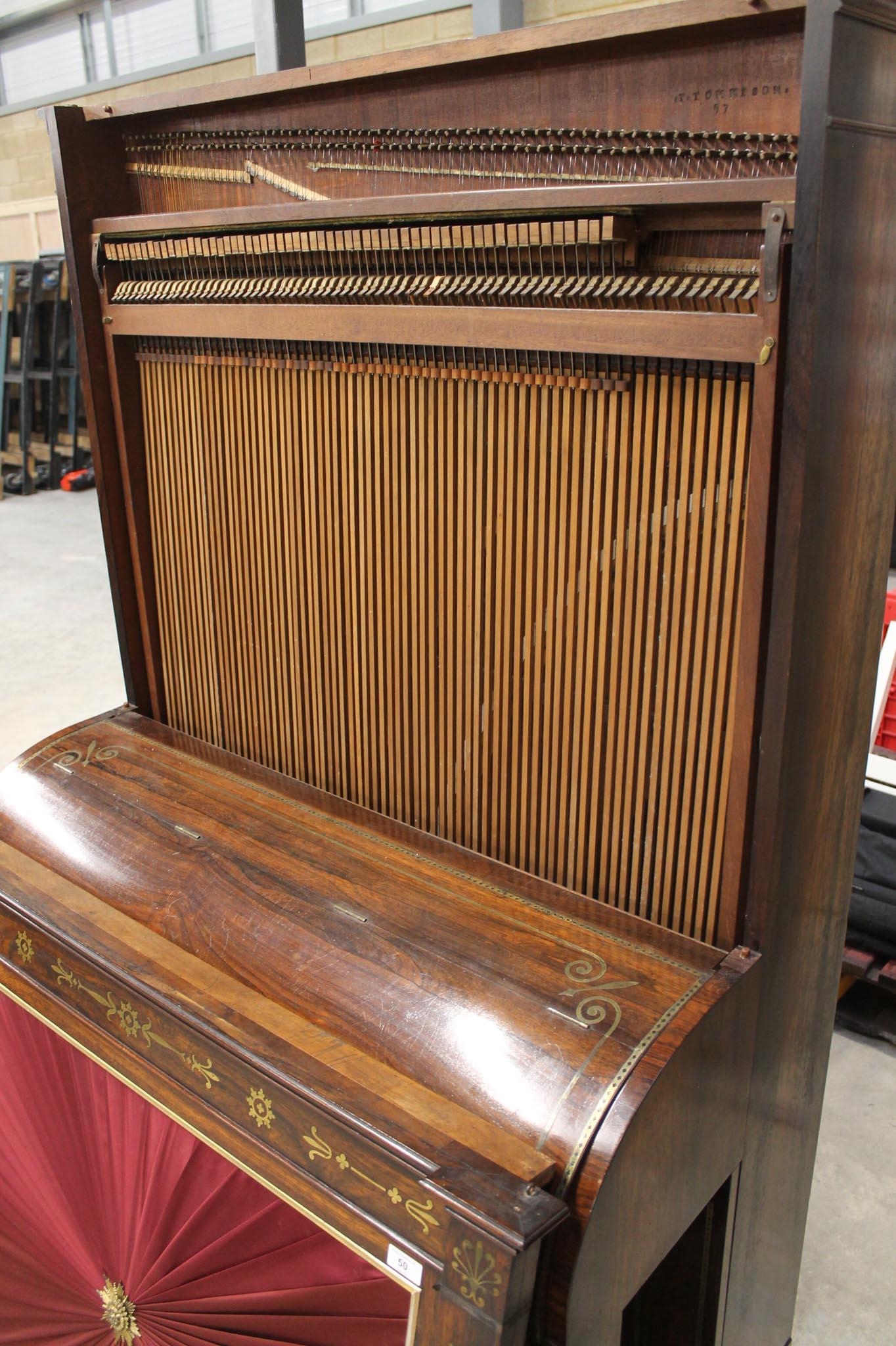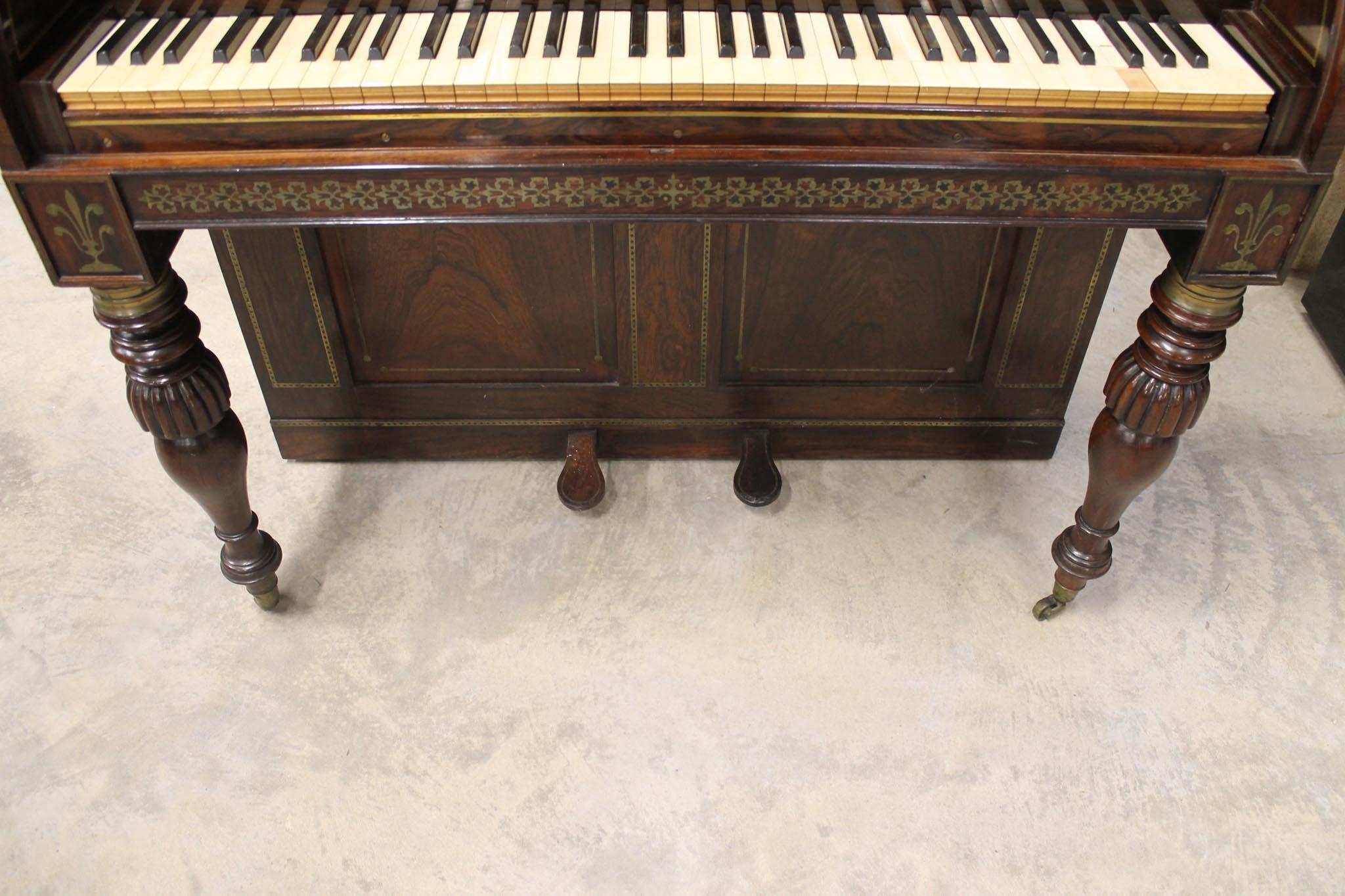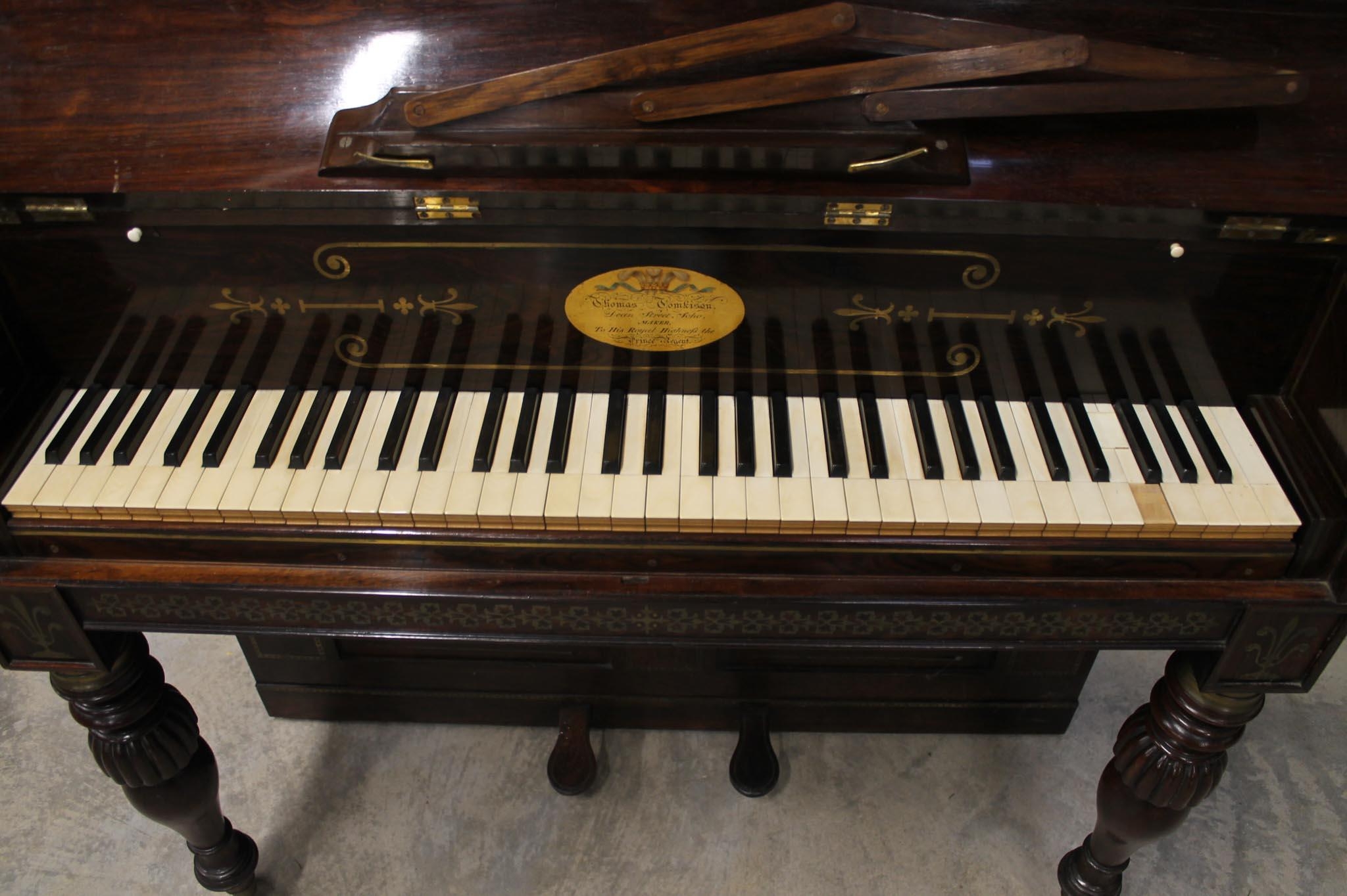 A cabinet piano in a rosewood case with turned and fluted baluster supports, the front panel having a pleated silk front with a central rosette; having a 5.5 octave compass FF-c4. The fascia reading 'Thomas Tomkison, Dean Street, Soho, MAKER To His Royal Highness the Price Regent'. This instrument has been sympathetically restored and is in good playing condition.