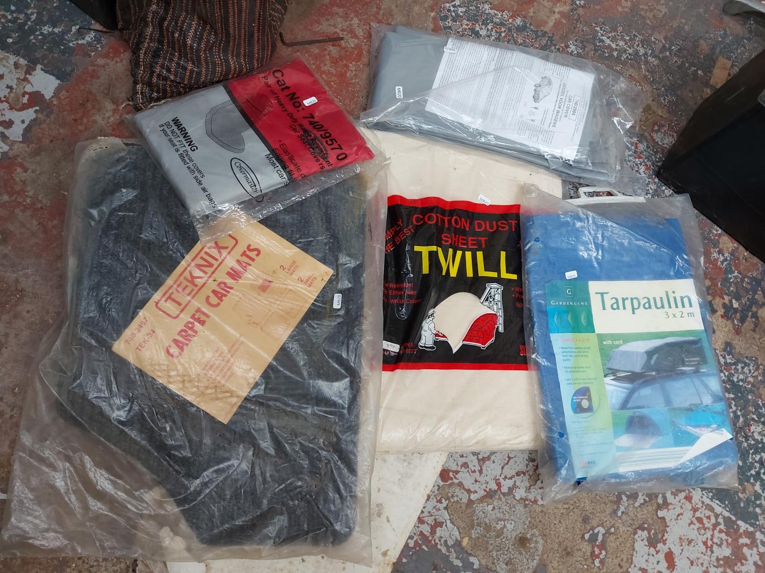 A mixed lot to include car cover, 3 x 2 metre tarpaulin, large cotton dust sheet etc.