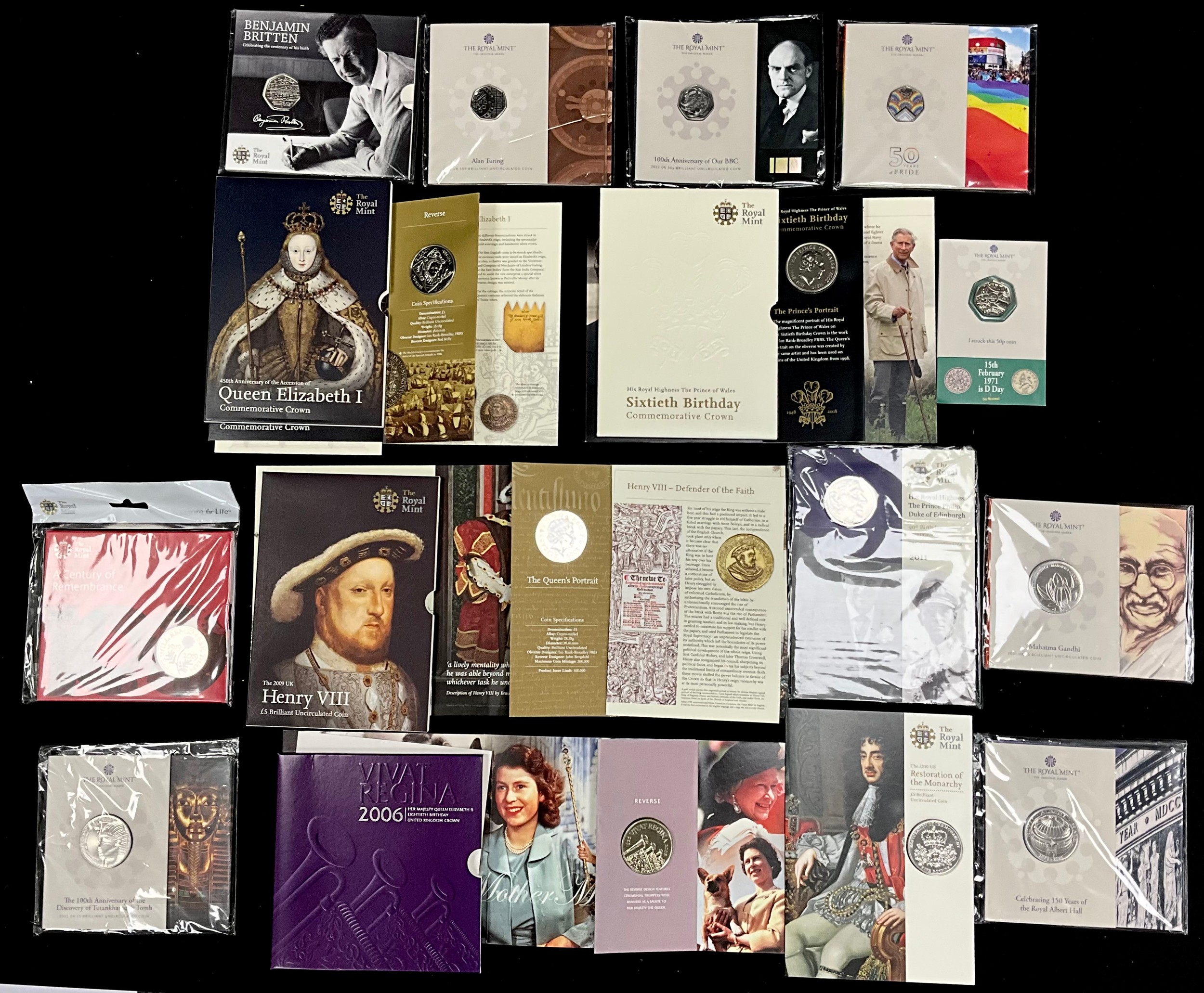Coins & Tokens - Brilliant Uncirculated coins, £5.00, Mahatma Ghandi 2021, 100th Anniversary of the Discovery of Tutankhamun's Tomb, Restoration of The Monarchy, A Century of Remembrance, 50 pence, Pride, 100th Anniversary of Our BBC, , Alan Turing, Benjamin Britten, Crowns Queen Elizabeth I etc (15), Harrods cars