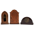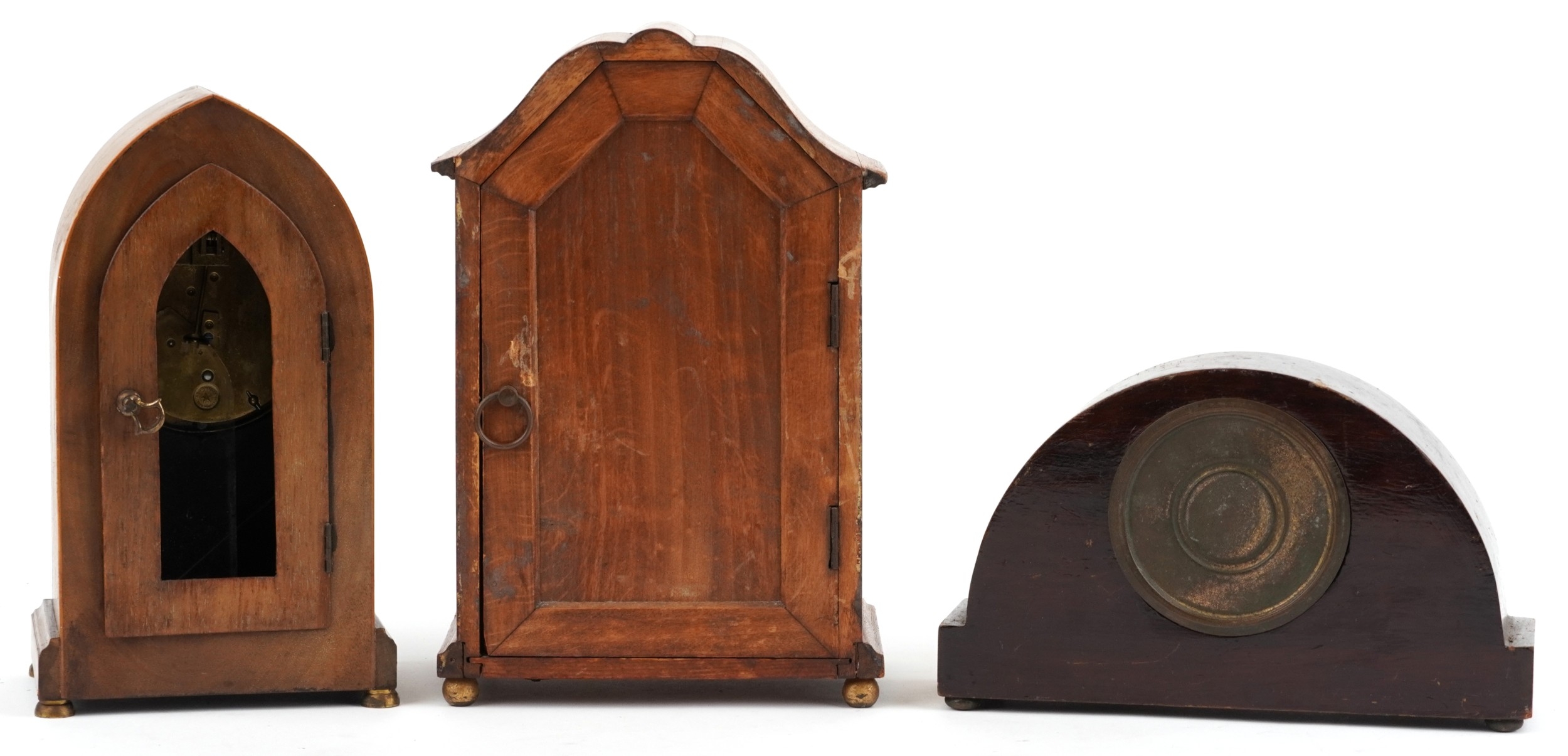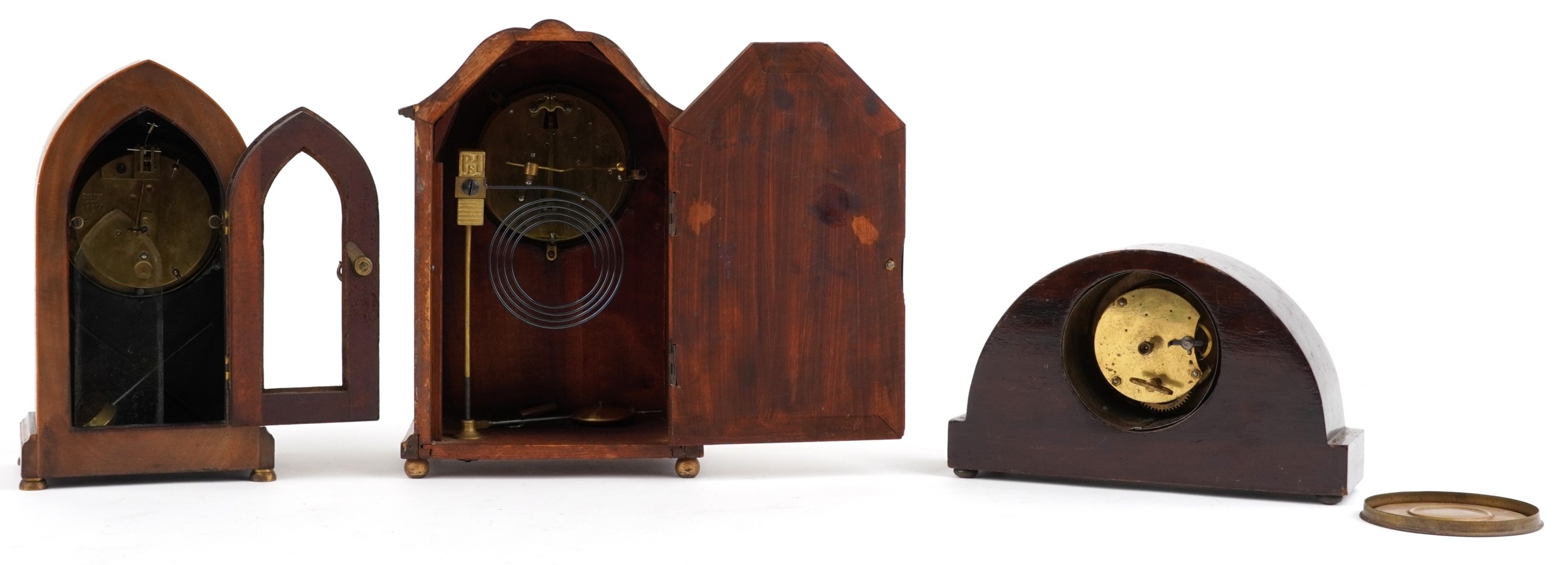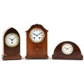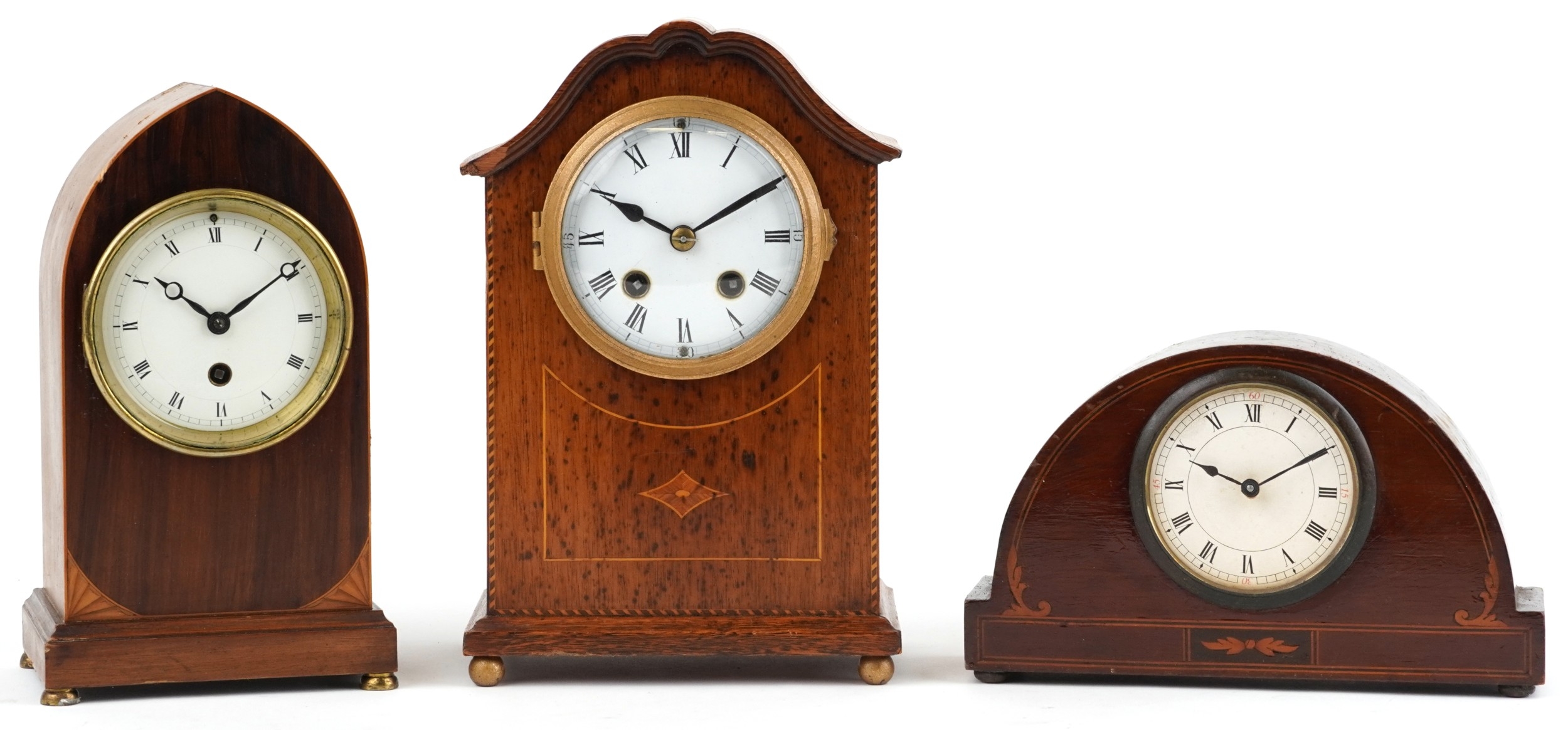 Three Edwardian mahogany mantle clocks, each having a white enamelled dial and black Roman numerals, the largest 28cm high.