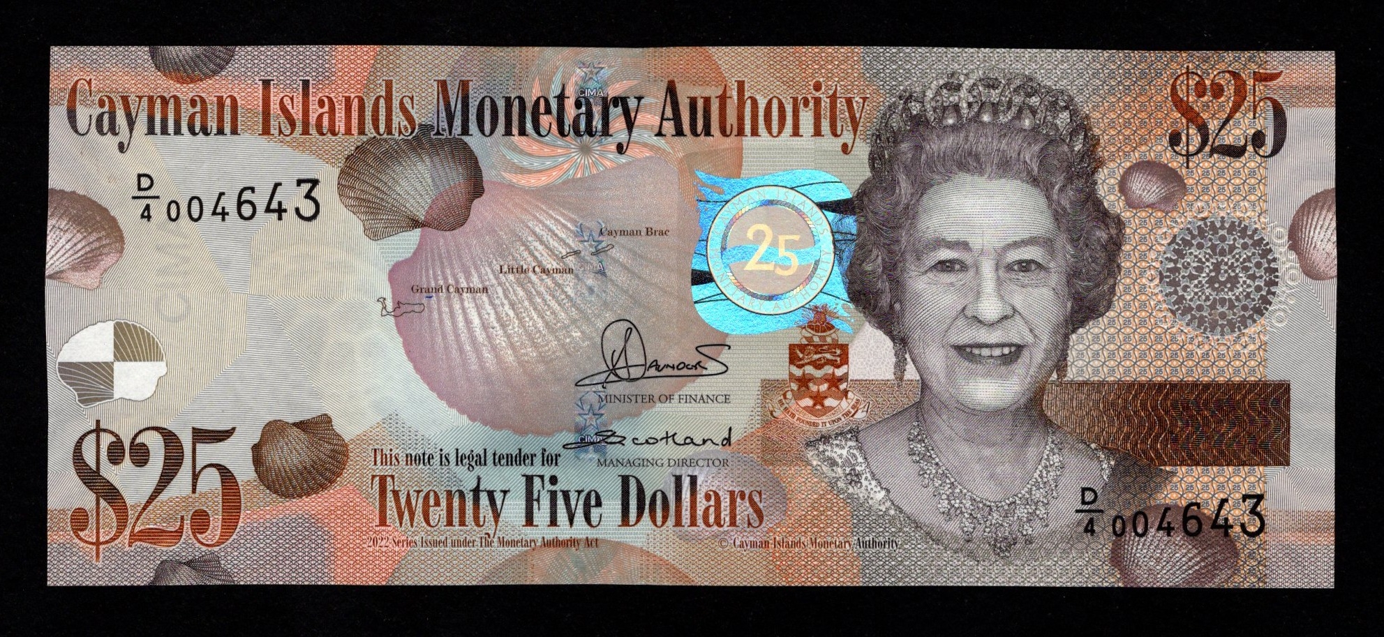 Cayman Islands 25 Dollars dated 2022, Commemorative 25th Anniversary of the Cayman Islands Monetary Authority, serial D/4004643 (BNB B225a, PickNL) Uncirculated