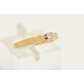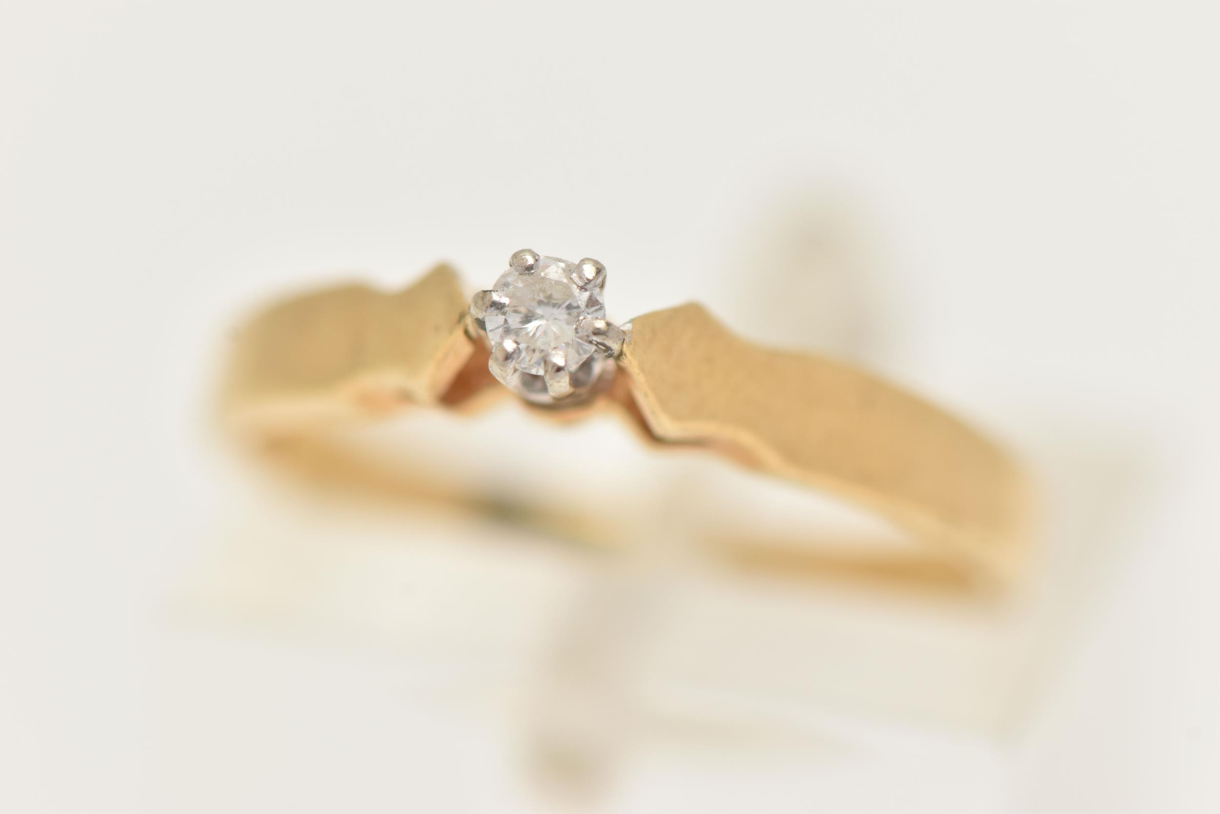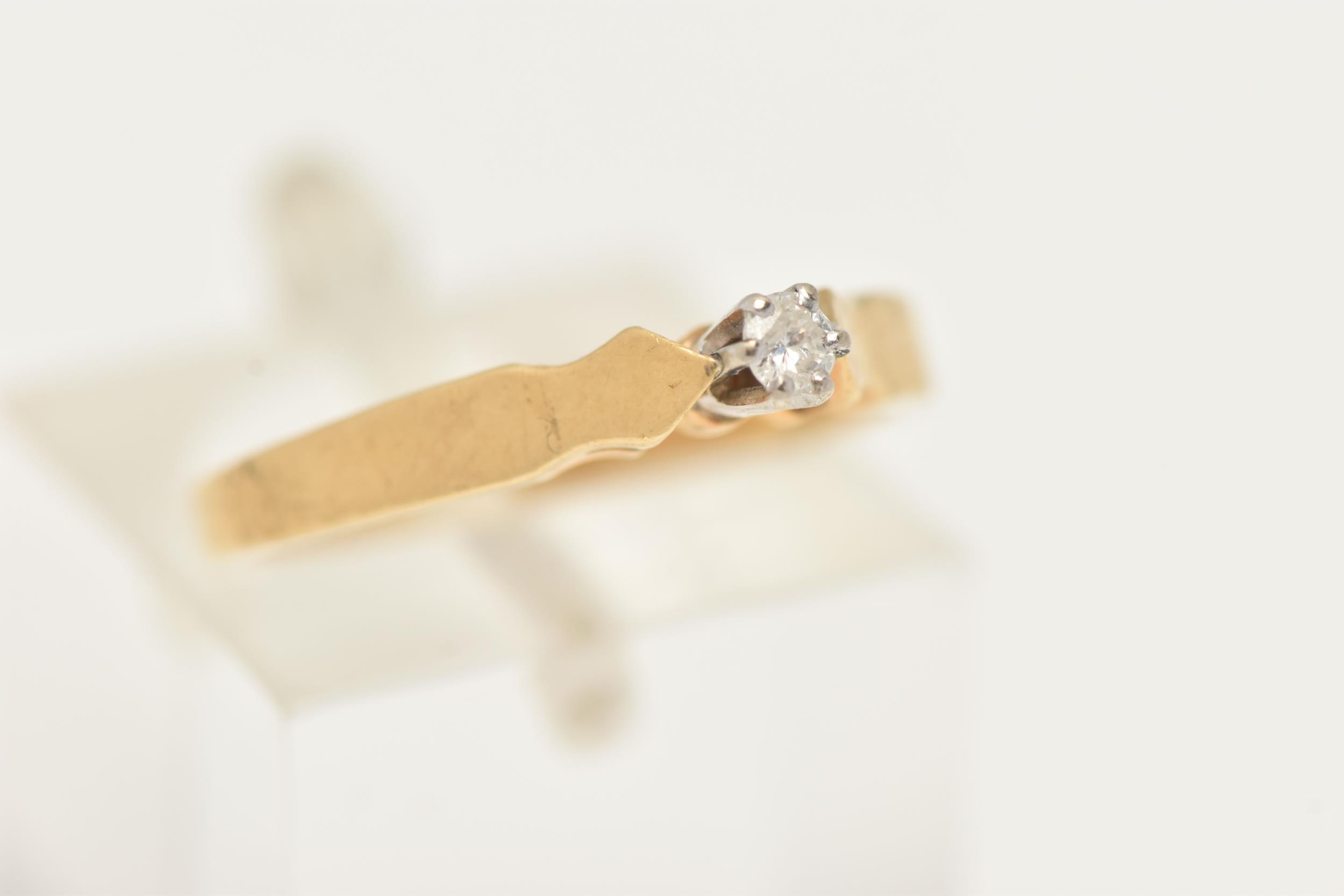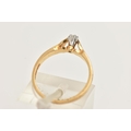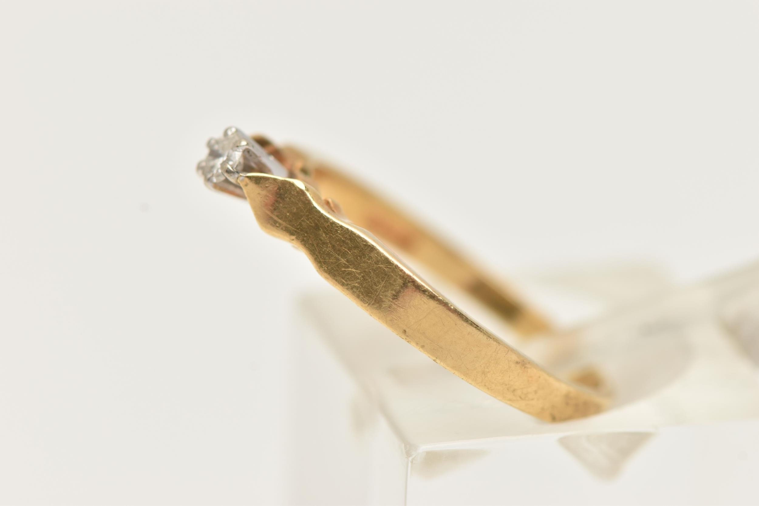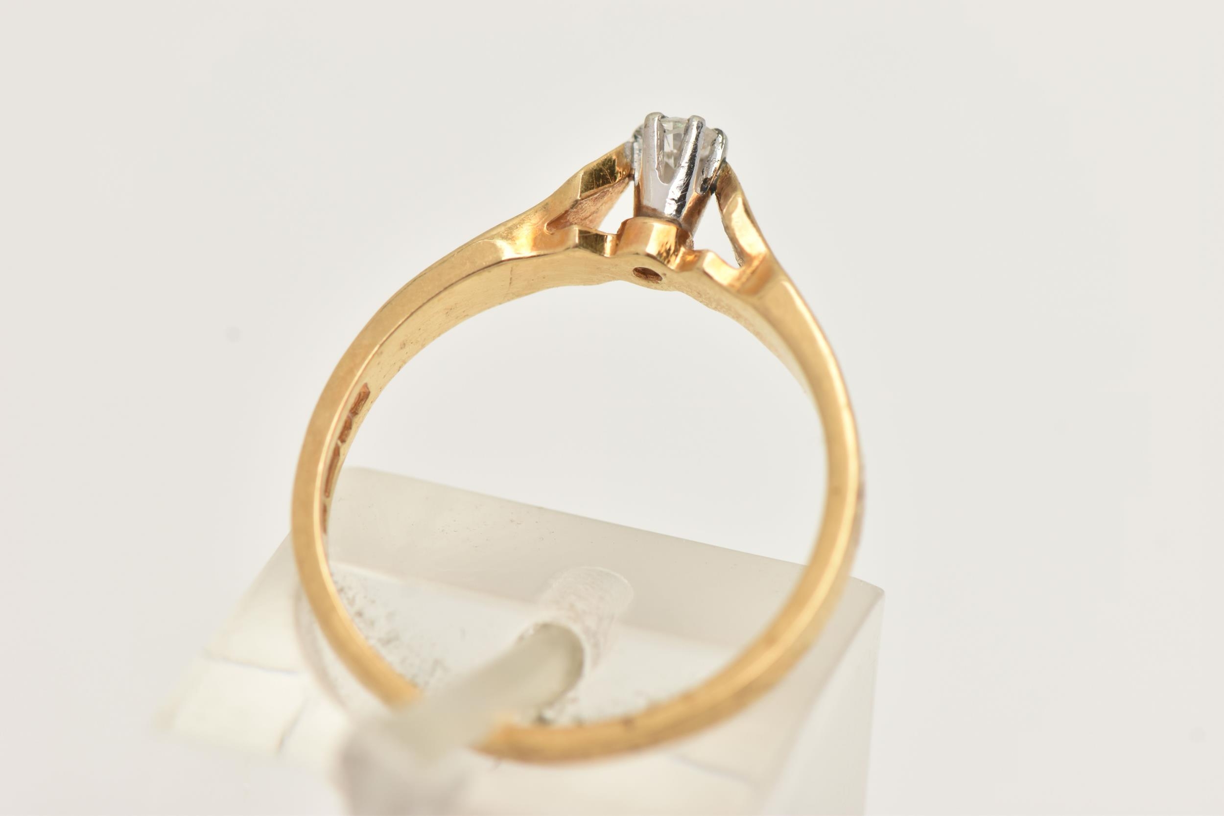 AN 18CT GOLD DIAMOND SINGLE STONE RING, set with a small round brilliant cut diamond, estimated diamond weight 0.05ct, claw set in a raised white metal mount, to the polished yellow gold band, hallmarked 18ct London, ring size J, approximate gross weight 2.2 grams (condition report: general light wear, would benefit from a gentle clean)