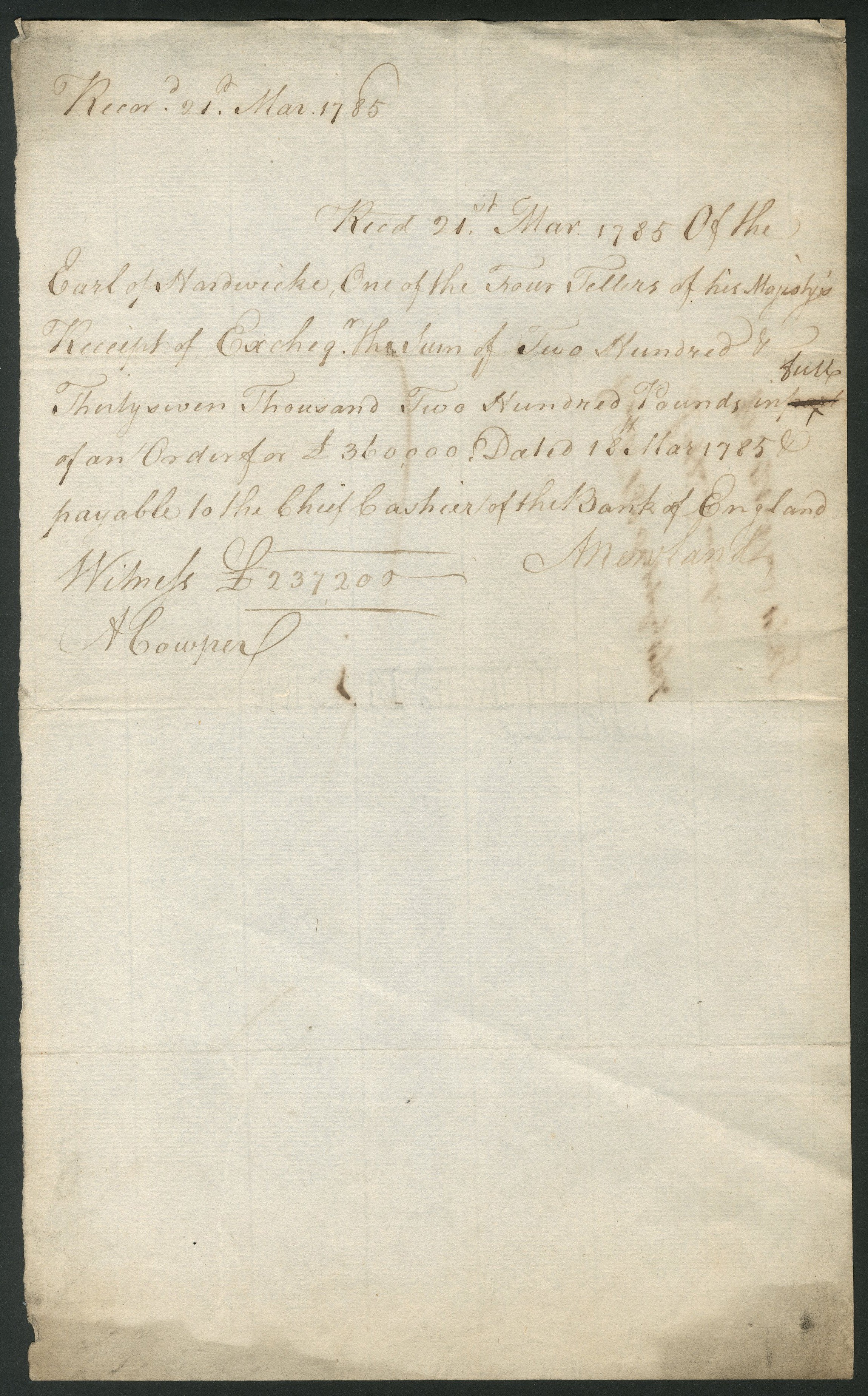 Exchequer receipt, 21st March 1785, for £237,200, signed by Abraham Newland, part of an Order for £360,000 for 'Exchequer bills', entirely handwritten. Not trimmed as is often the case with these documents, VF.
