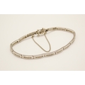 A 9ct white gold and diamond bracelet. The sixteen narrow panels each channel set with six small round cut diamonds, marked 375 and 1 for carat weight, with security chain. L18.5cm, gross weight 12.16g.