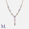 An Amethyst Arts and Crafts Necklace set with oval cut amethysts and spheroid links.