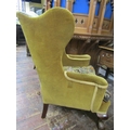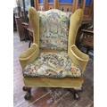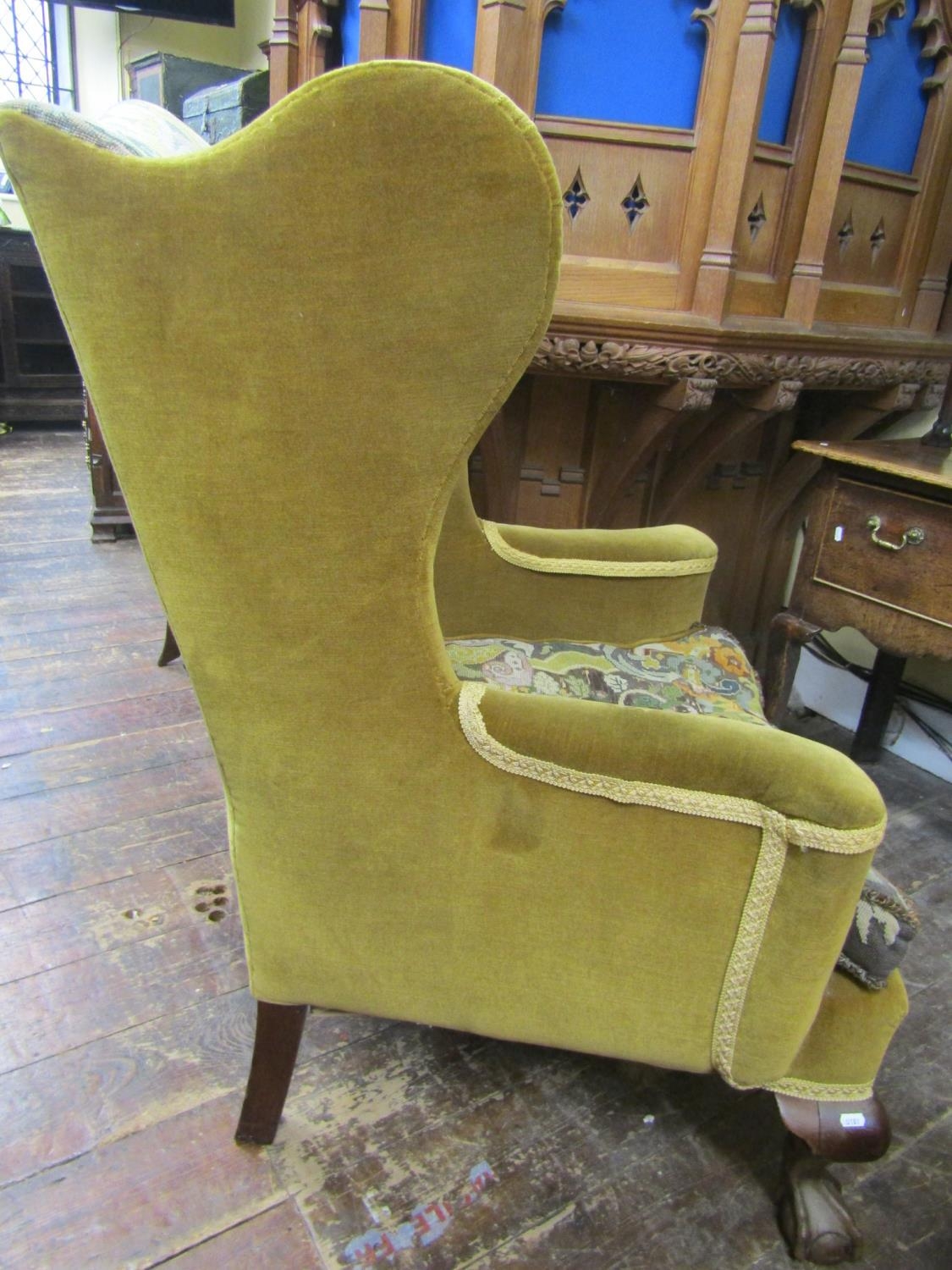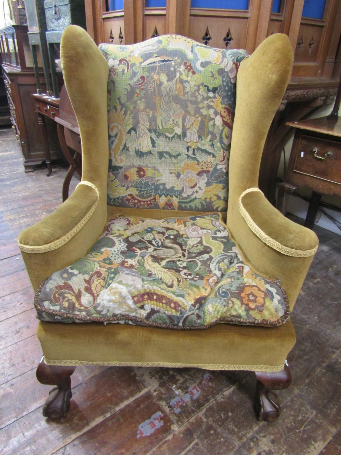 A 19th century upholstered wing chair raised on claw and ball feet with hand worked tapestry seat and back
