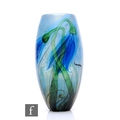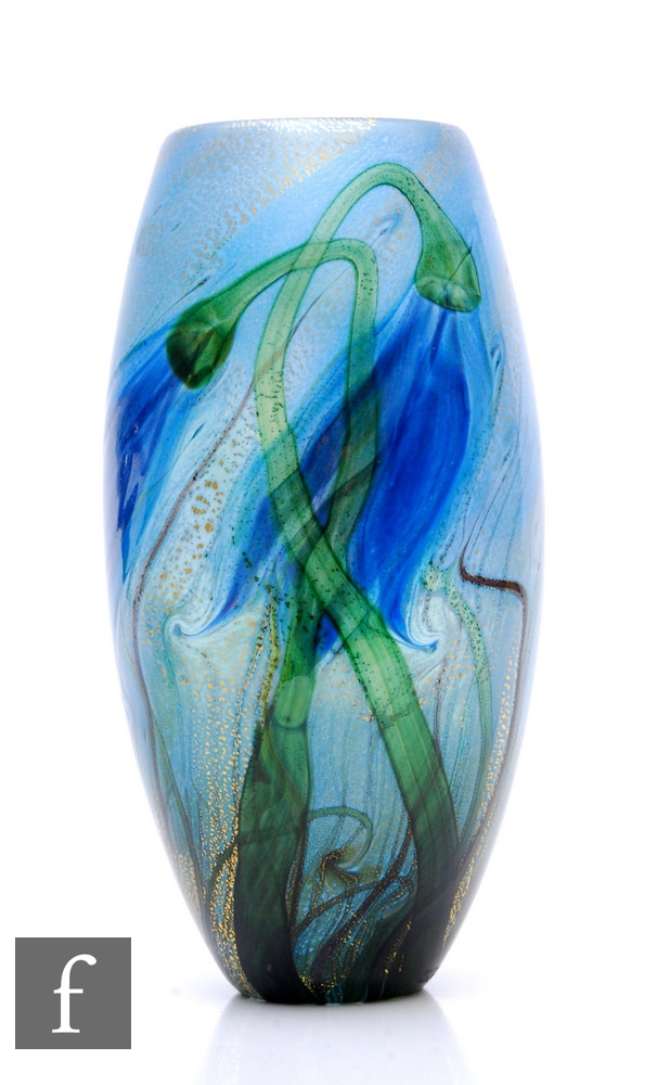Jonathan Harris - Isle of Wight - A contemporary studio cased glass English Bluebell vase, of elongated ovoid form, produced exclusively for members of the IOWSG Collectors Club, blue flowerheads on green whiplash stems over pale blue ground with gold foil inclusions, engraved signature and dated 2004, height 26cm.