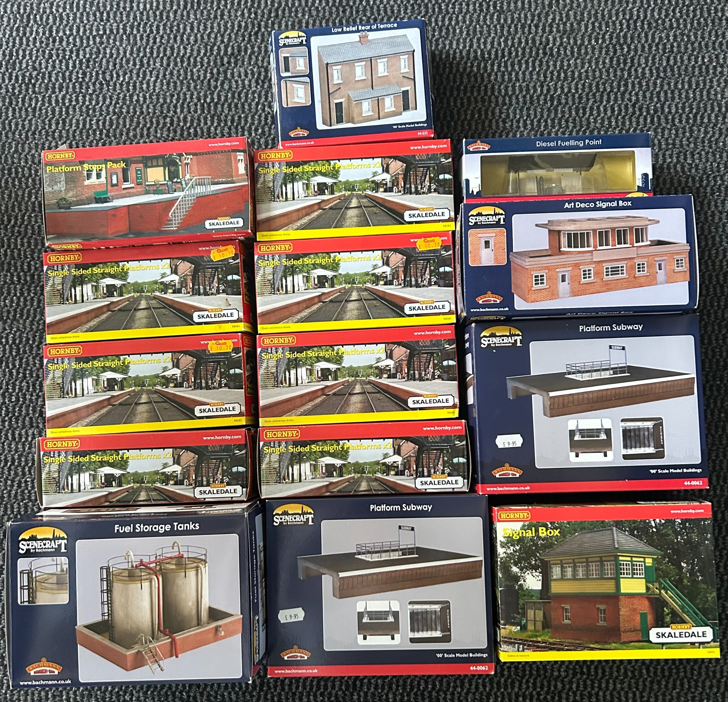 9 Hornby Skaledale and 6 Bachmann Scenecraft Buildings etc. Signal Box, 7x Single Sided Straight Platforms x2. Plus a Platform Steps Pack. Plus Scenecraft Fuel Storage Tanks, Art Deco Signal Box, Diesel Fuel Point, 2x Platform Subway and a Low Relief Rear of Terrace (houses). All boxed, minor wear. Contents VGC-Mint.