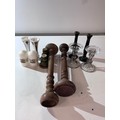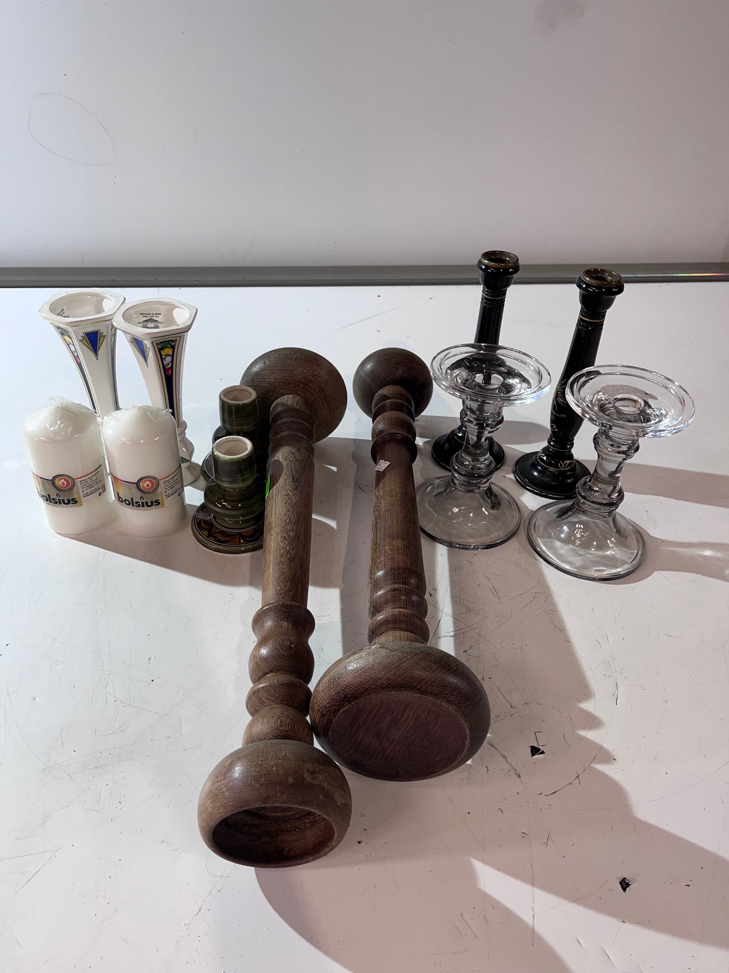 Wicker bread basket containing 5 pairs of assorted candlesticks & candles inc Aynsley & Jersey pottery