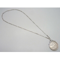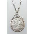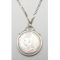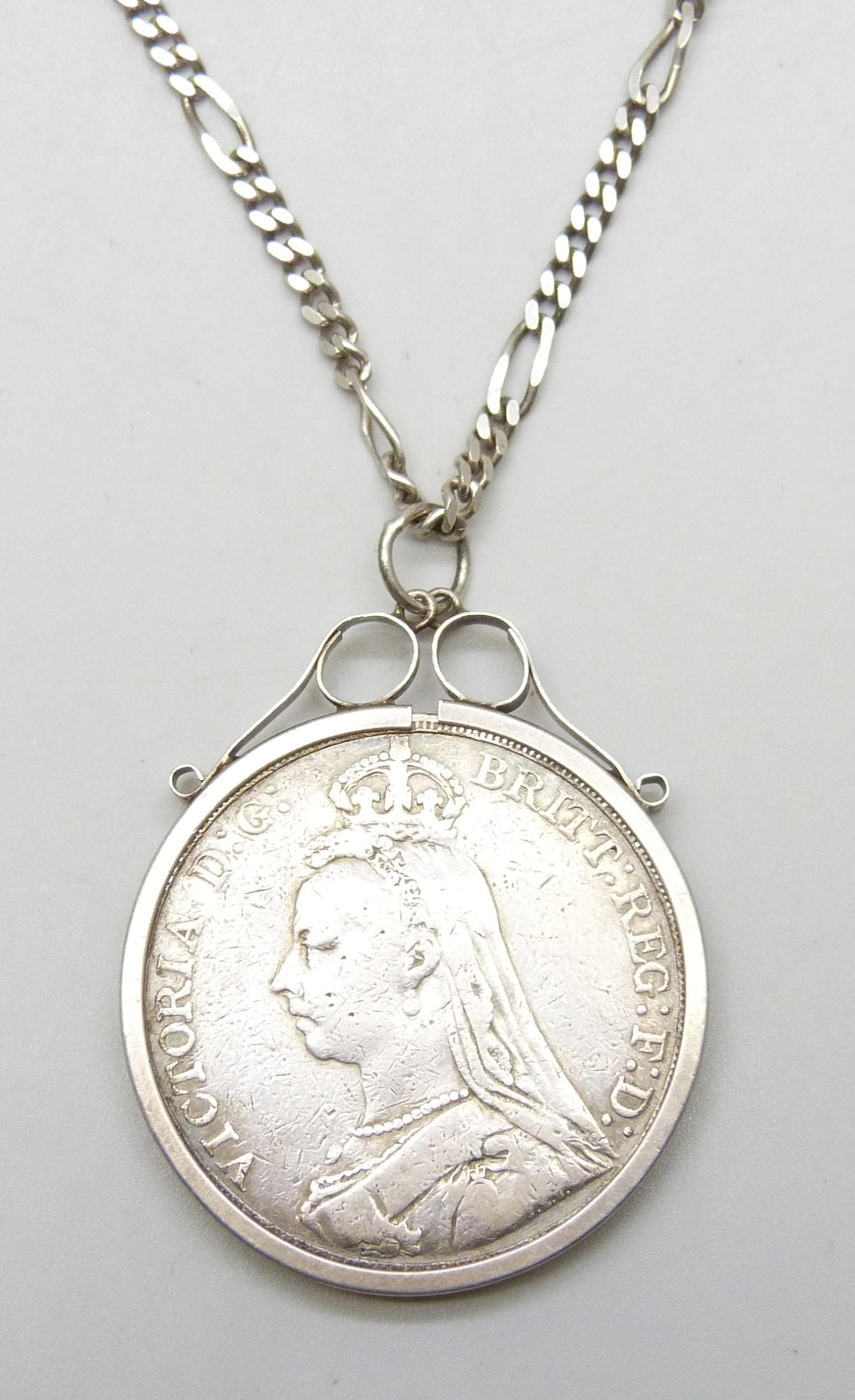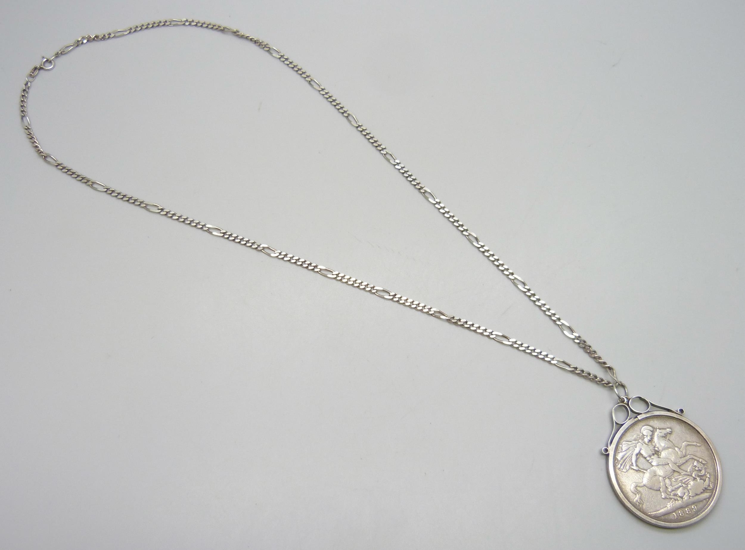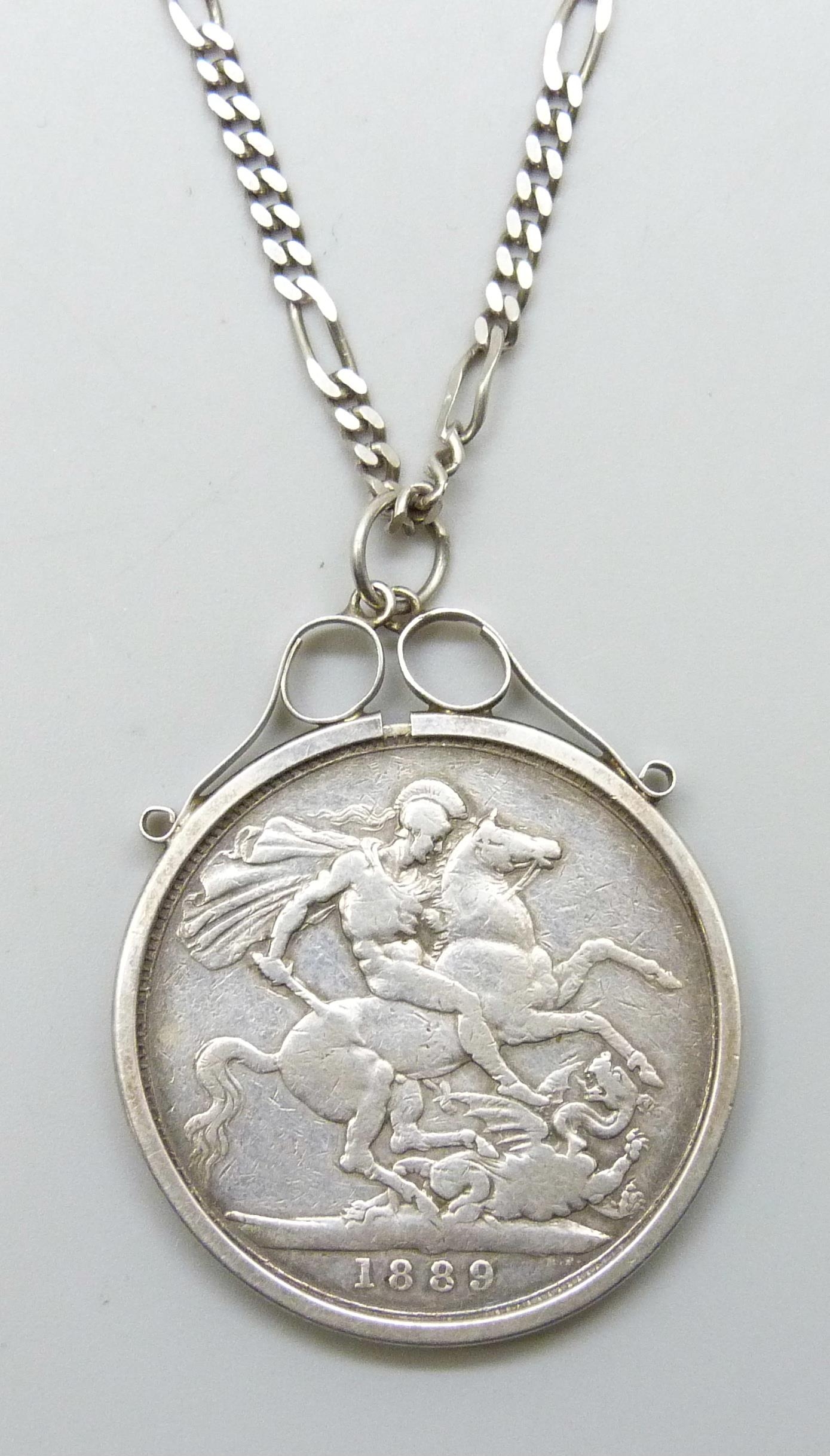An 1889 Victorian crown in a white metal mount, on a silver figaro chain, 43g total weight