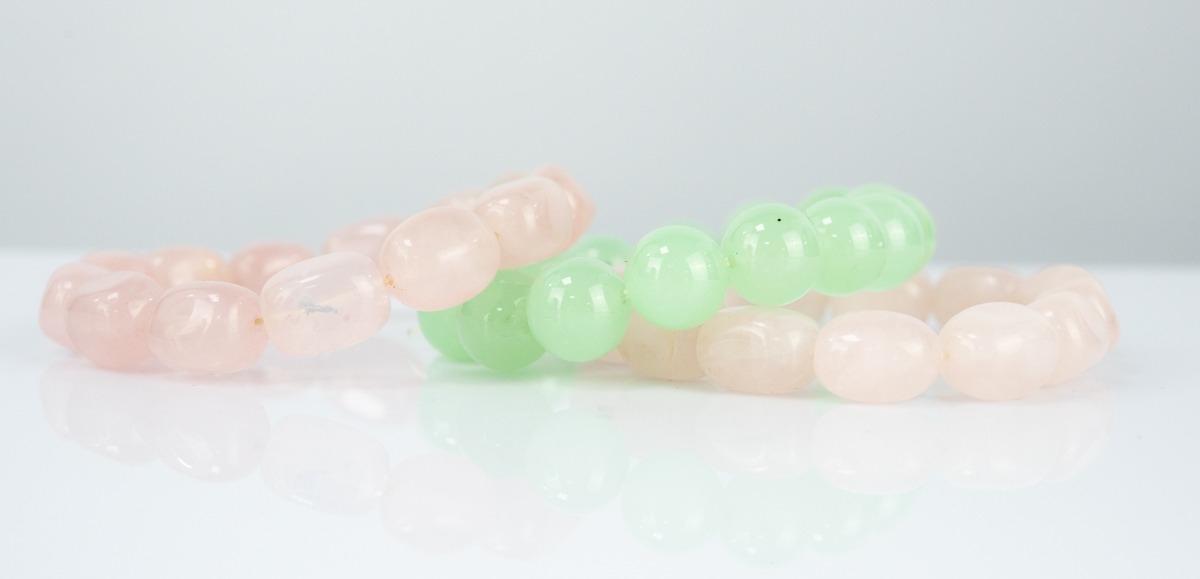 EXPANDING BRACELET OF PALE GREEN JADE BEADS and 2 other expanding BRACELETS OF ROSE QUARTZ BEADS (3)