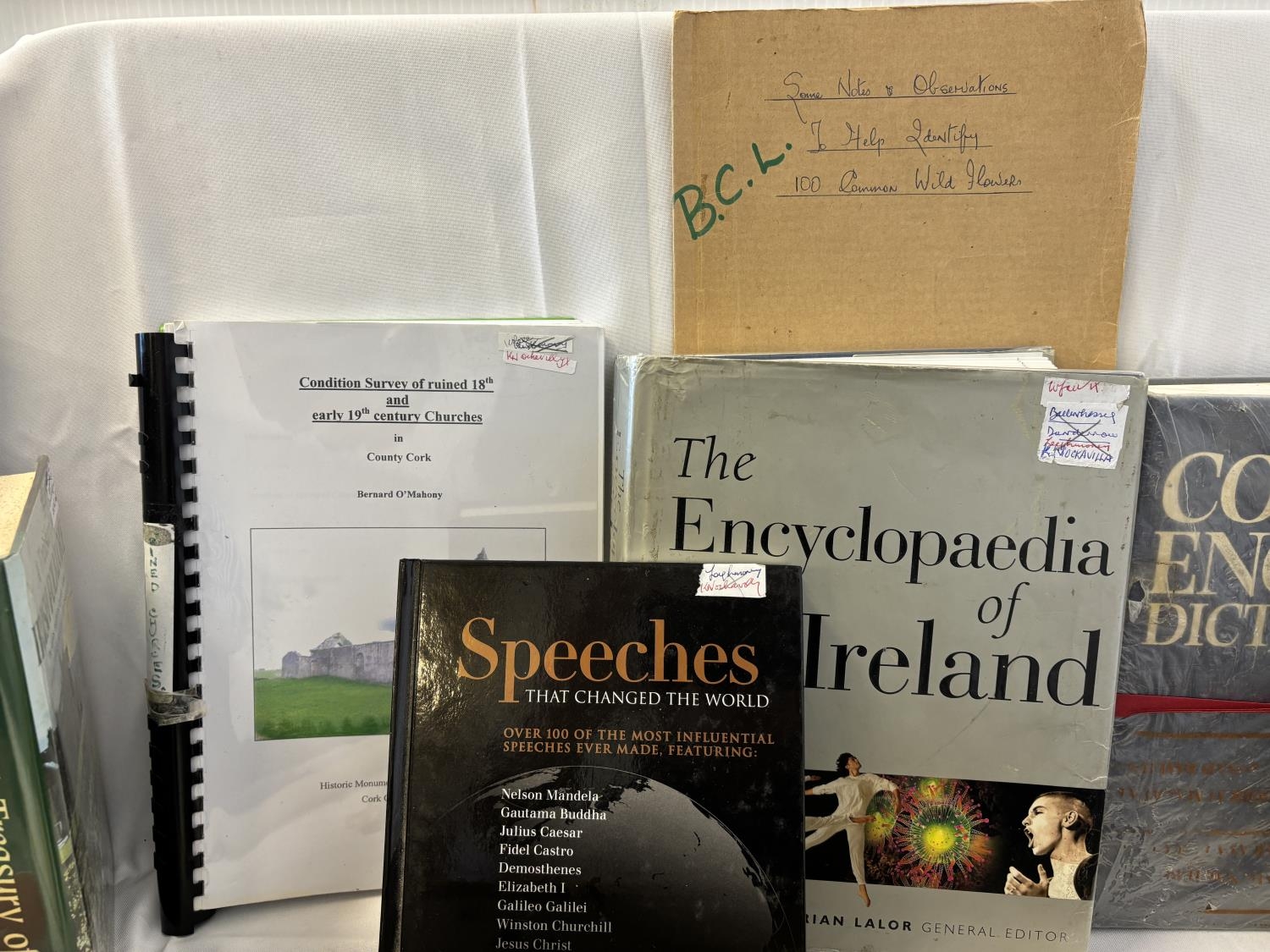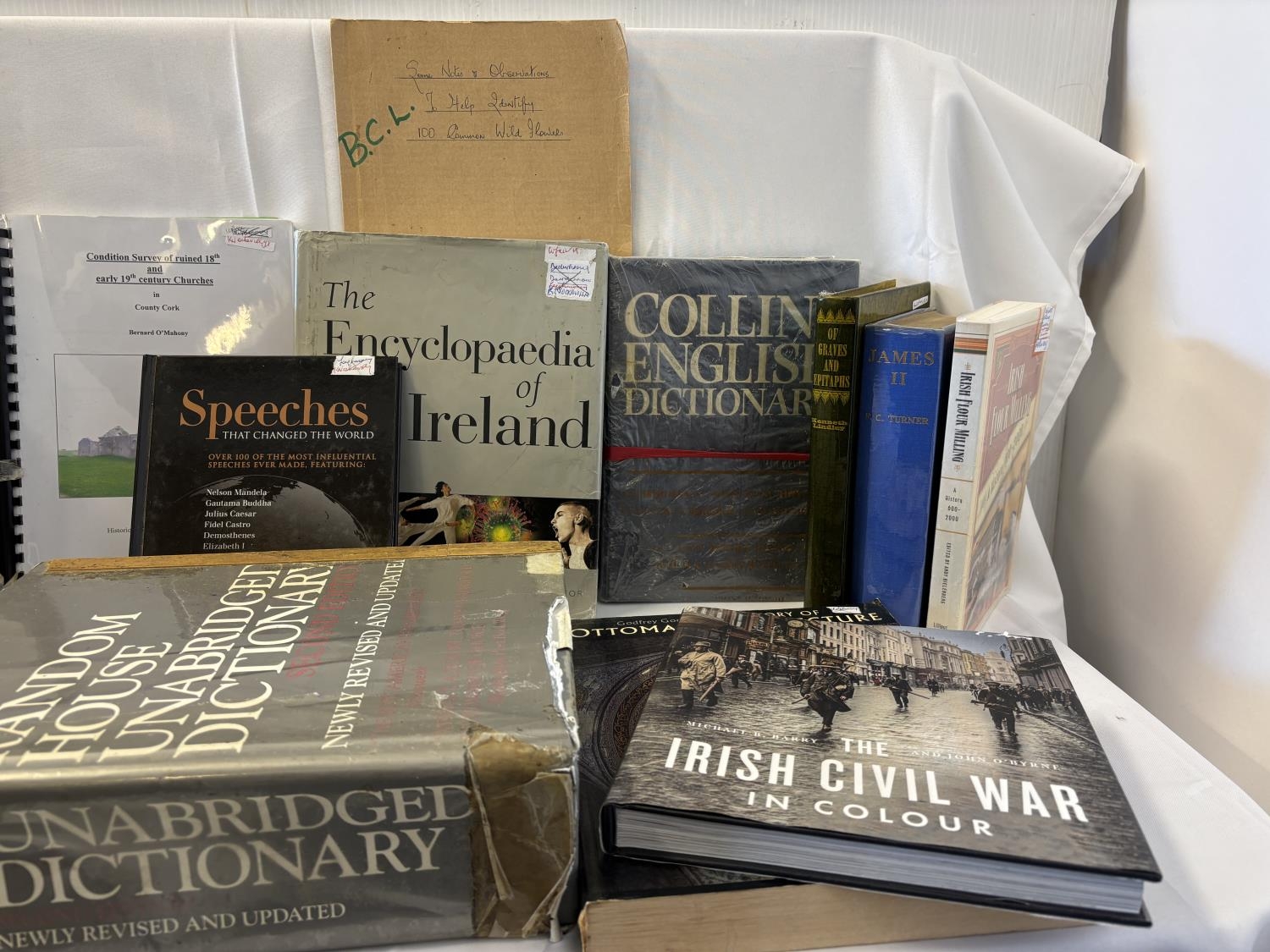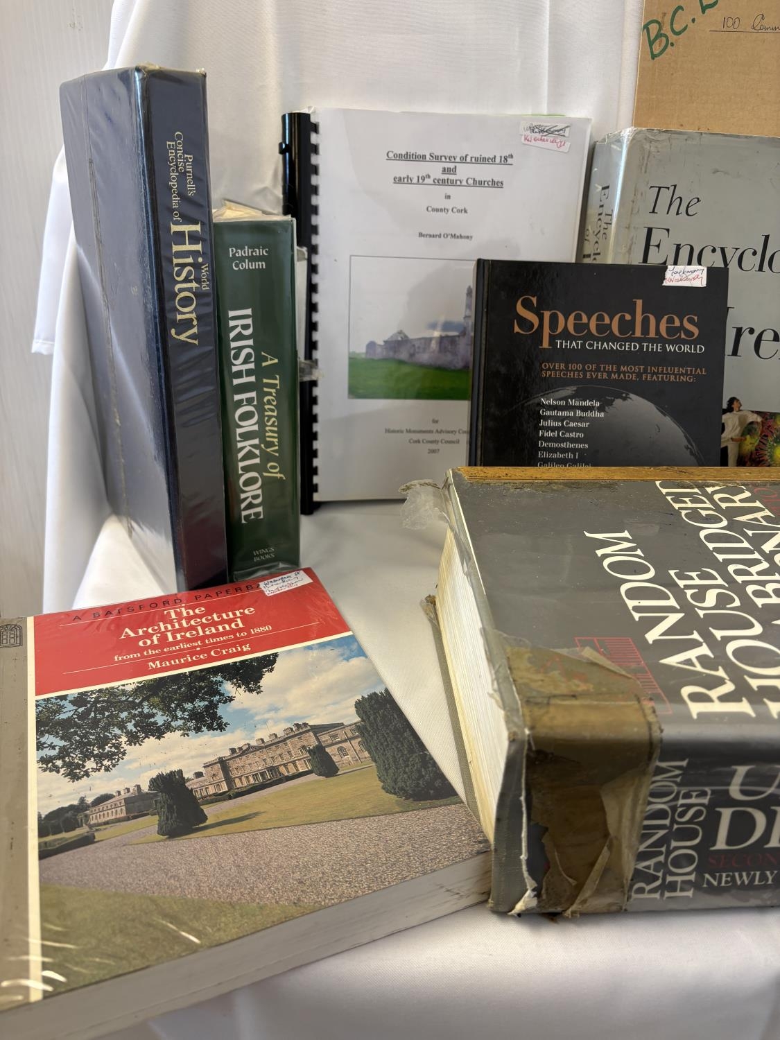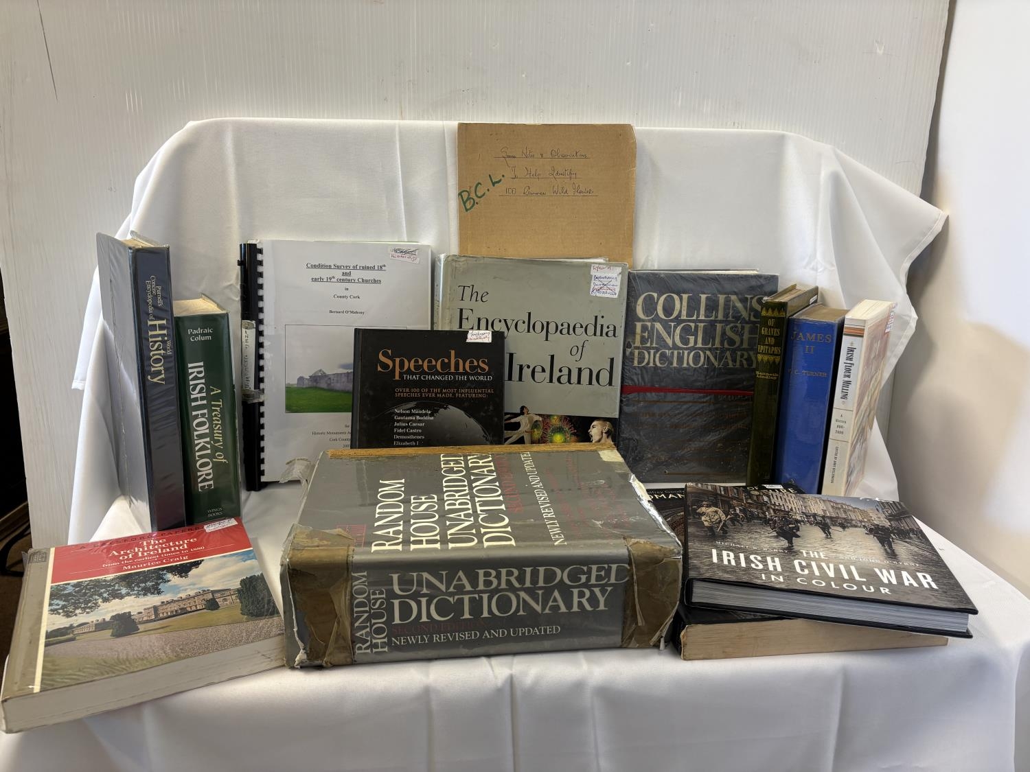 Quantity of books and dictionary's - Irish and other interest including Condition Survey of ruined 18th & 19th century Churches in County Cork by Bernard O'Mahony.