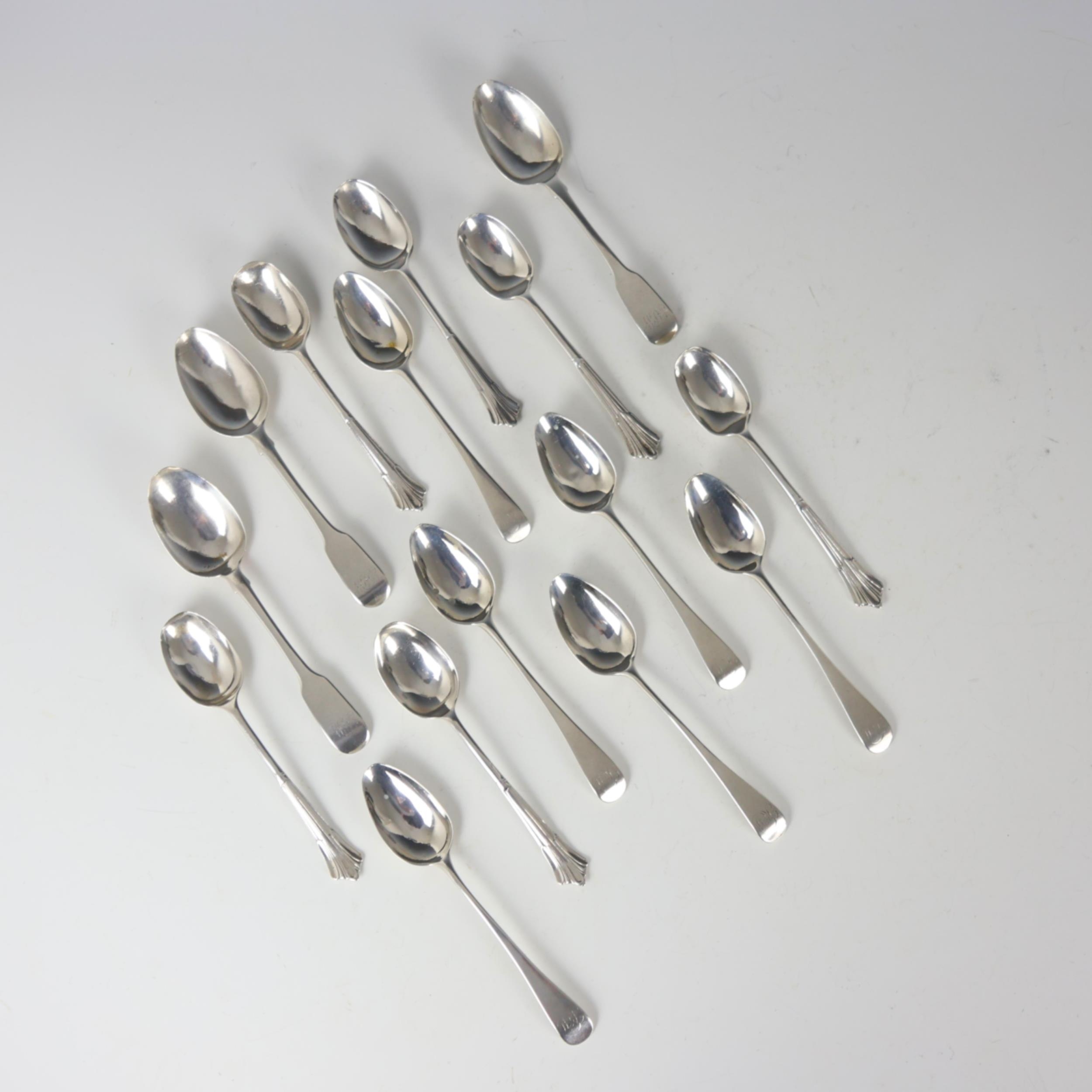 A set of six George III silver Old English pattern teaspoons, Solomon Hougham, London 1796, of typical form with initial to terminal, 13.5cm long, with three George III silver teaspoons, T Cox Savory, London 1828, and further silver teaspoons, gross weight 8ozt (15)