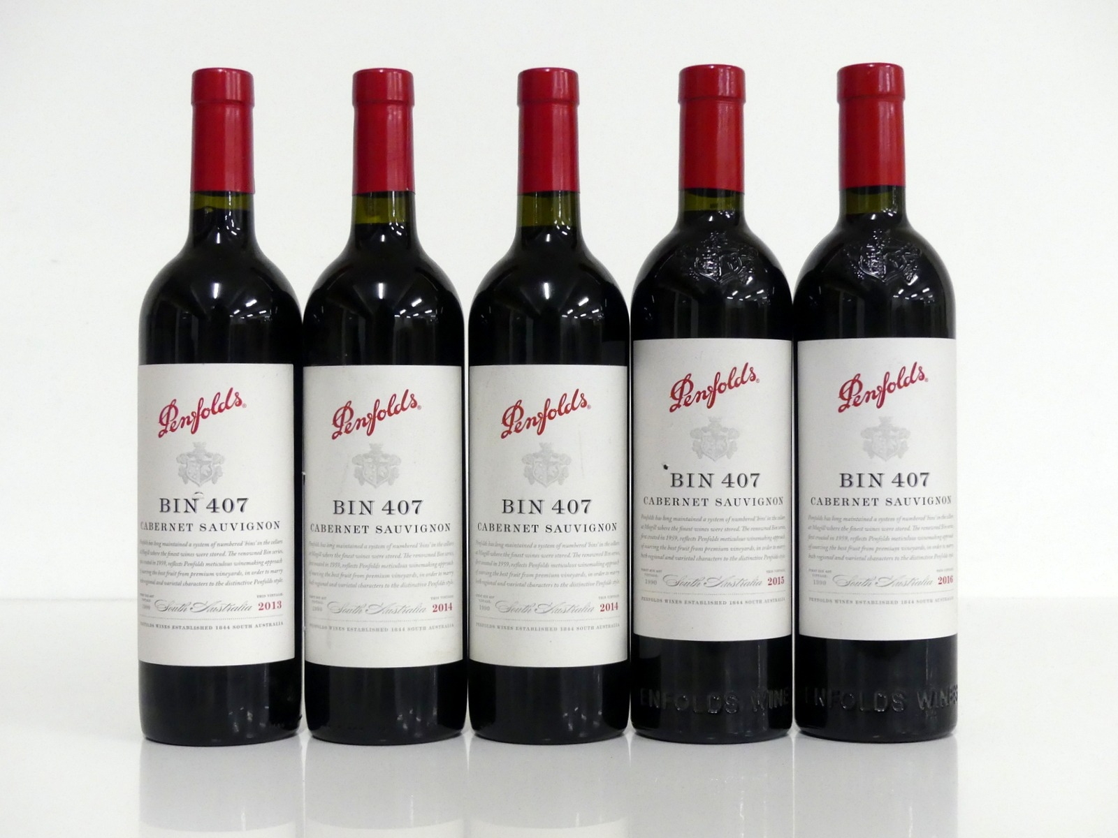 1 bt Penfolds Bin 407 Cabernet Sauvignon 2013 South Australia vsl ntl 2 bts Penfolds Bin 407 Cabernet Sauvignon 2014 South Australia 1 bt Penfolds Bin 407 Cabernet Sauvignon 2015 South Australia vsl ntl 1 bt Penfolds Bin 407 Cabernet Sauvignon 2016 South Australia Above 5 bottles