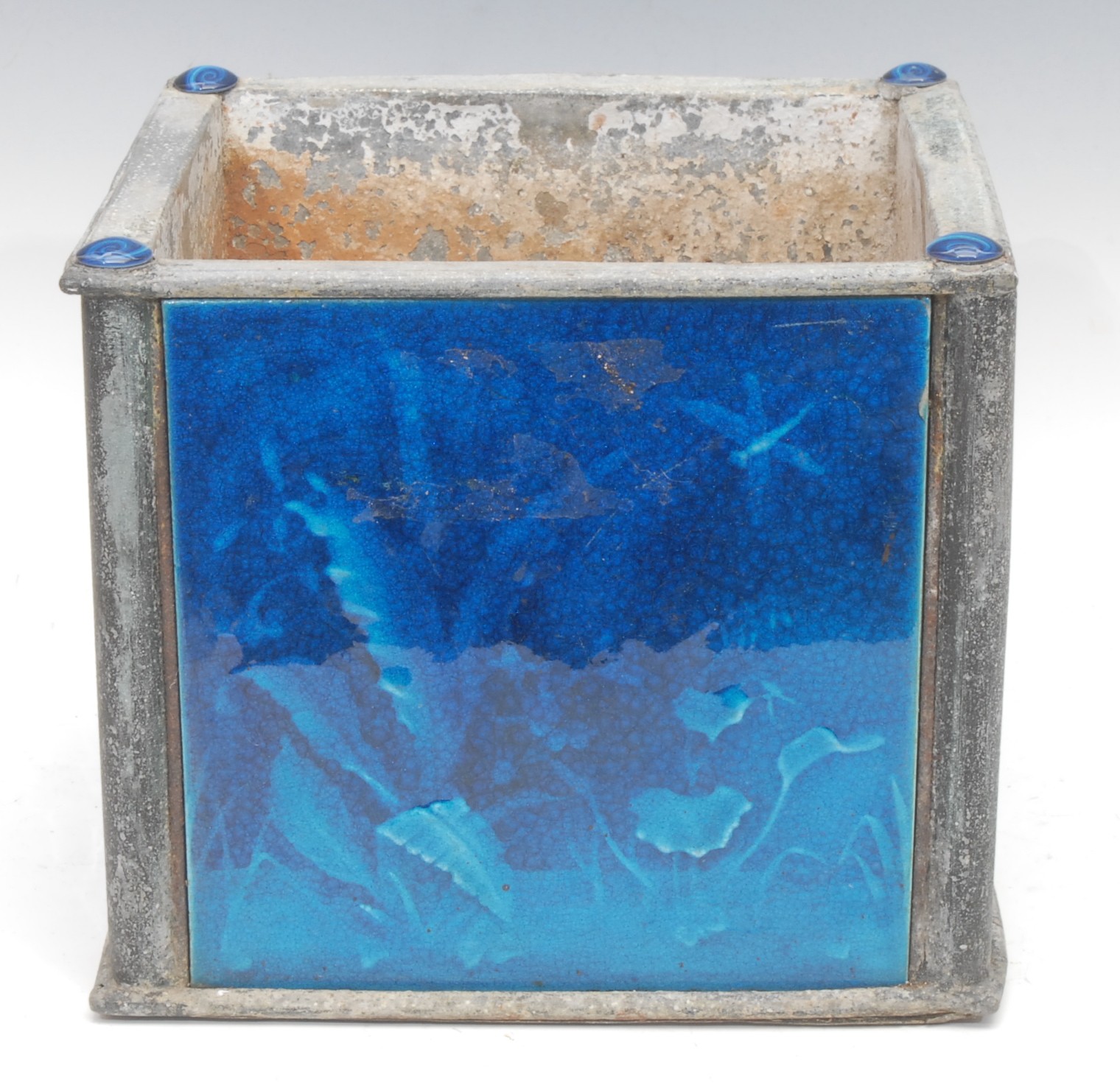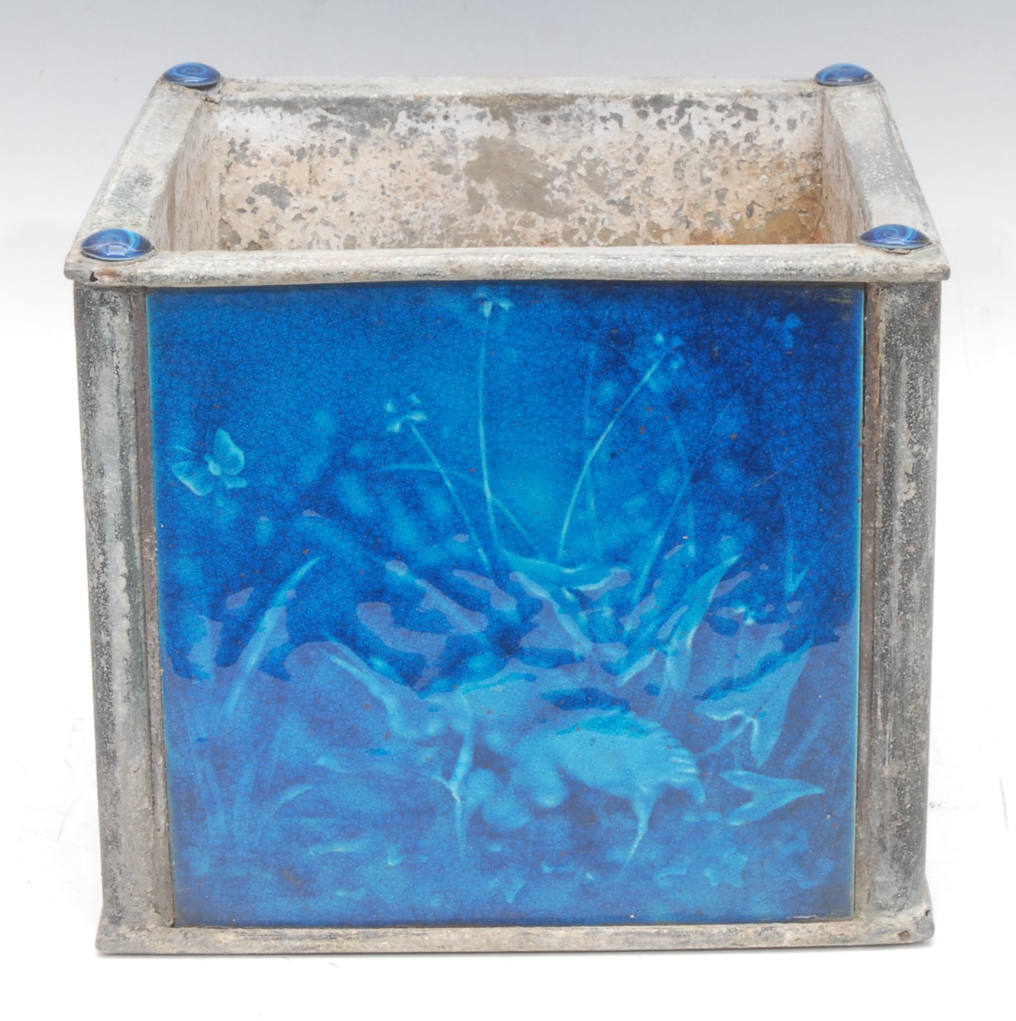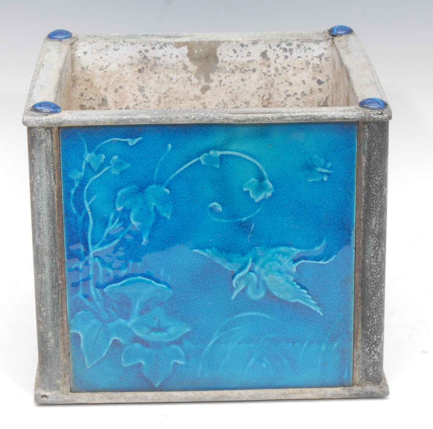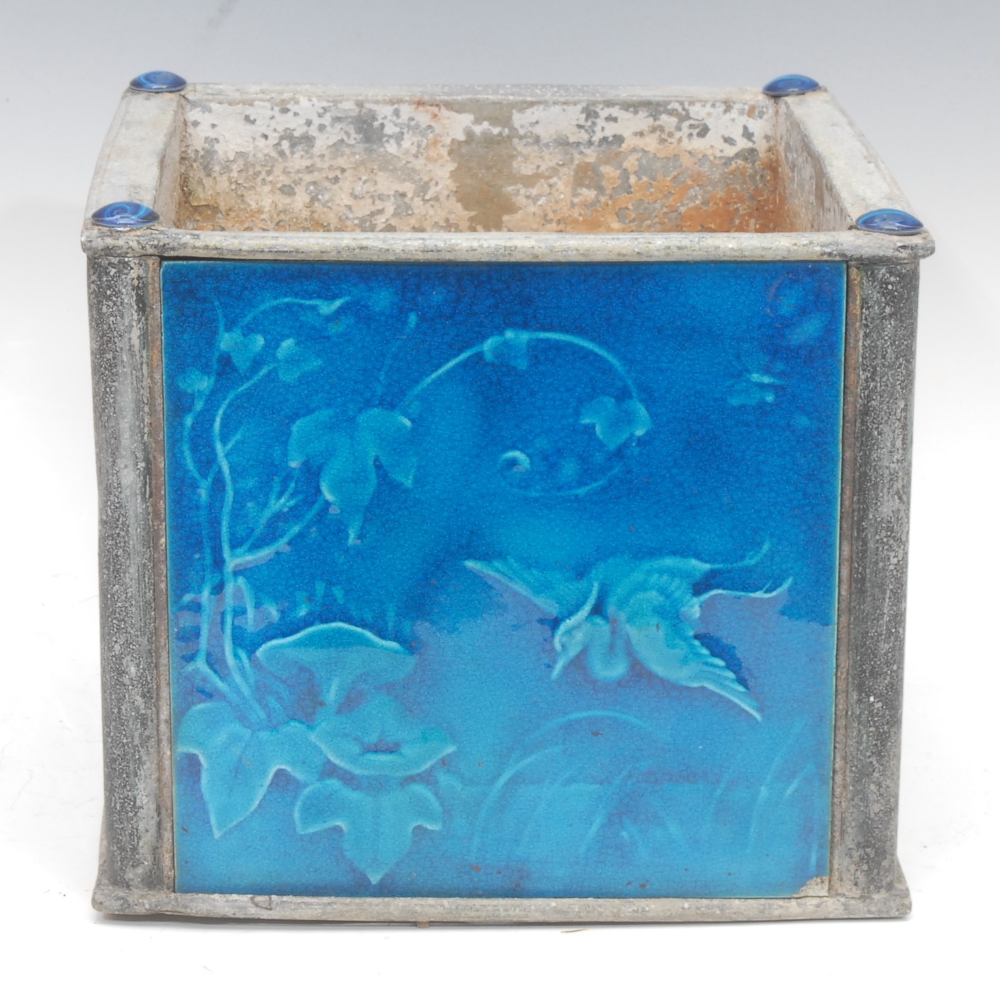 A Majolica and metal planter, the side each inset with a different turquoise tiles with Cranes, Storks, Butterflies, Dragonflies etc probably Minton Hollis & Co, planter 21cm high, 24cm x 24cm square.