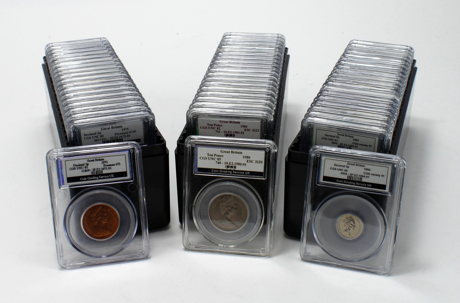 GB Decimal Coins (60) Halfpennies to 10p's, slabbed by CGS UK in three CGS boxes.
