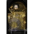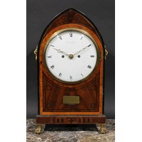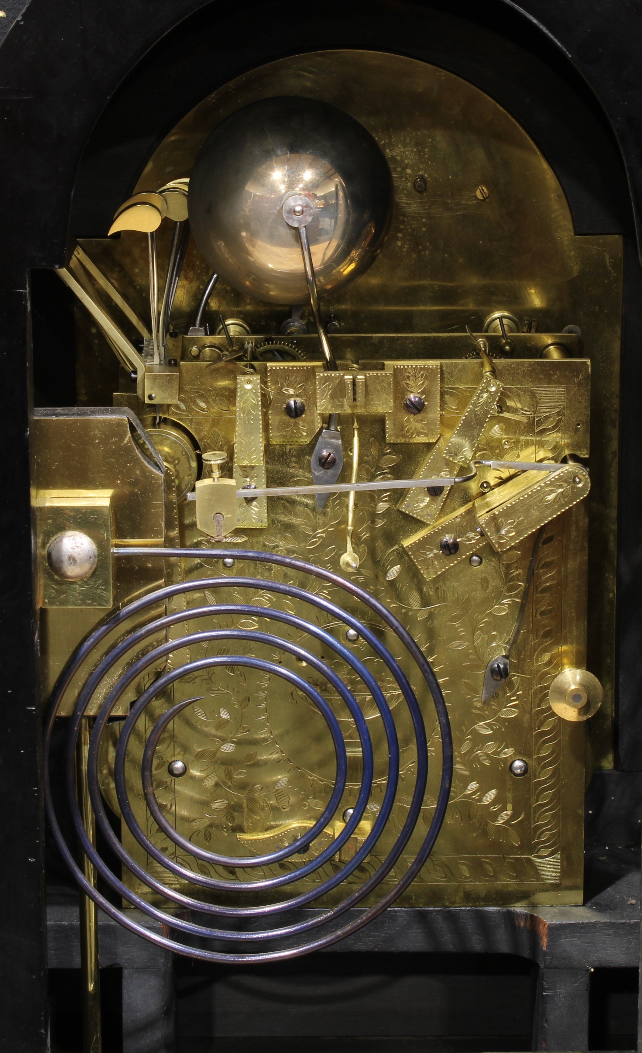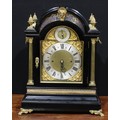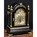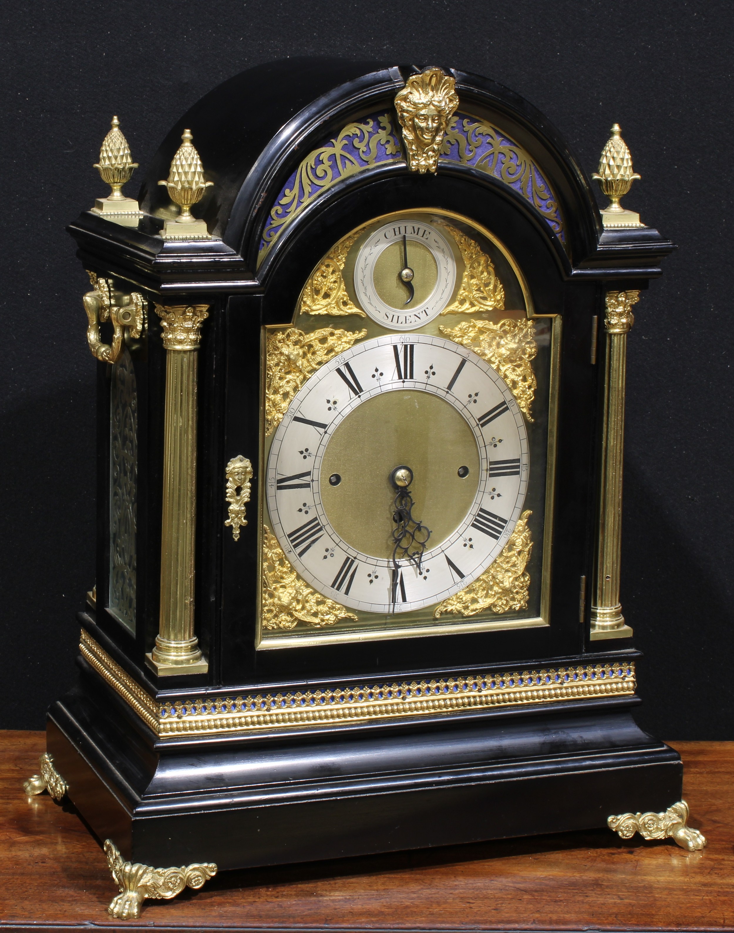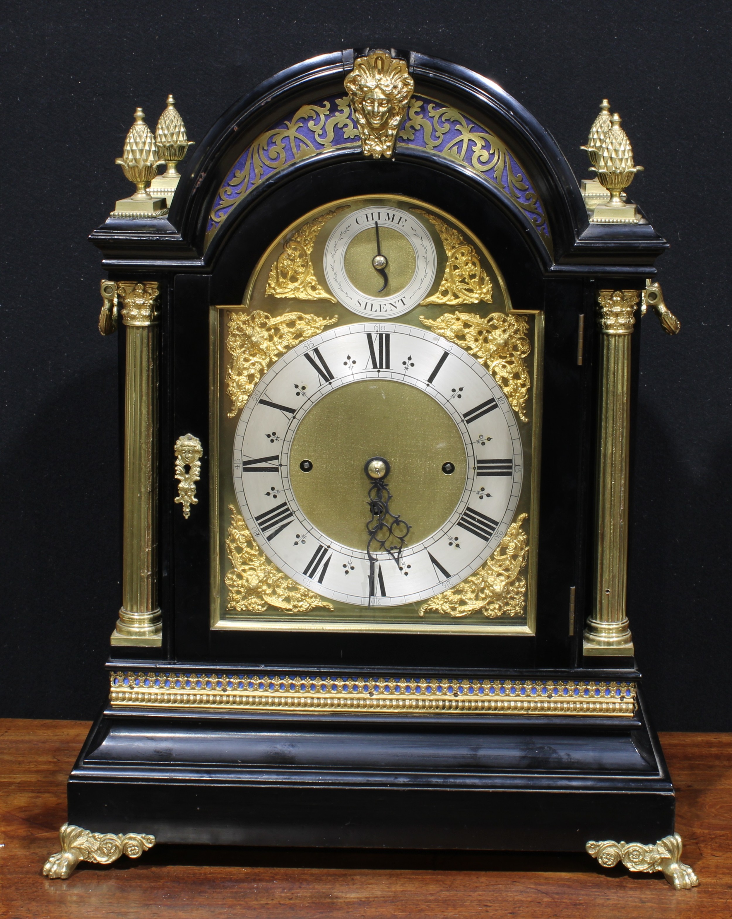 A Victorian gilt metal mounted ebonised bracket clock, in the George II Revival style, 25cm arched brass dial with silvered chapter ring inscribed with Roman numerals, Strike/Silent to arch, eight day fusee movement striking on a gong, engraved backplate, the arched case with pine cone finials, fluted Corinthian quarter-columns, 64cm high, c.1880