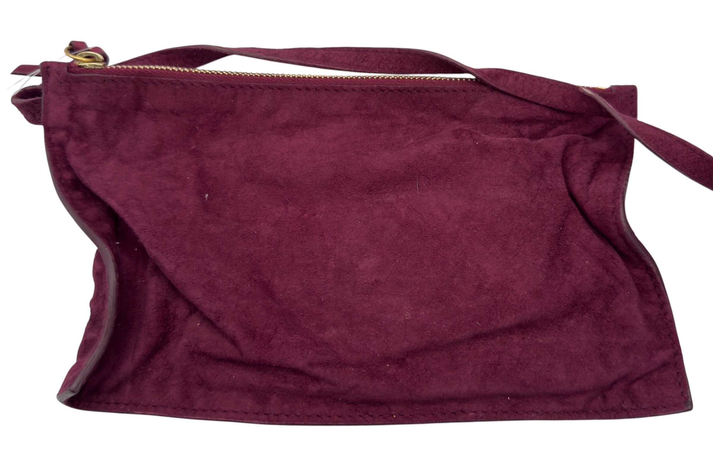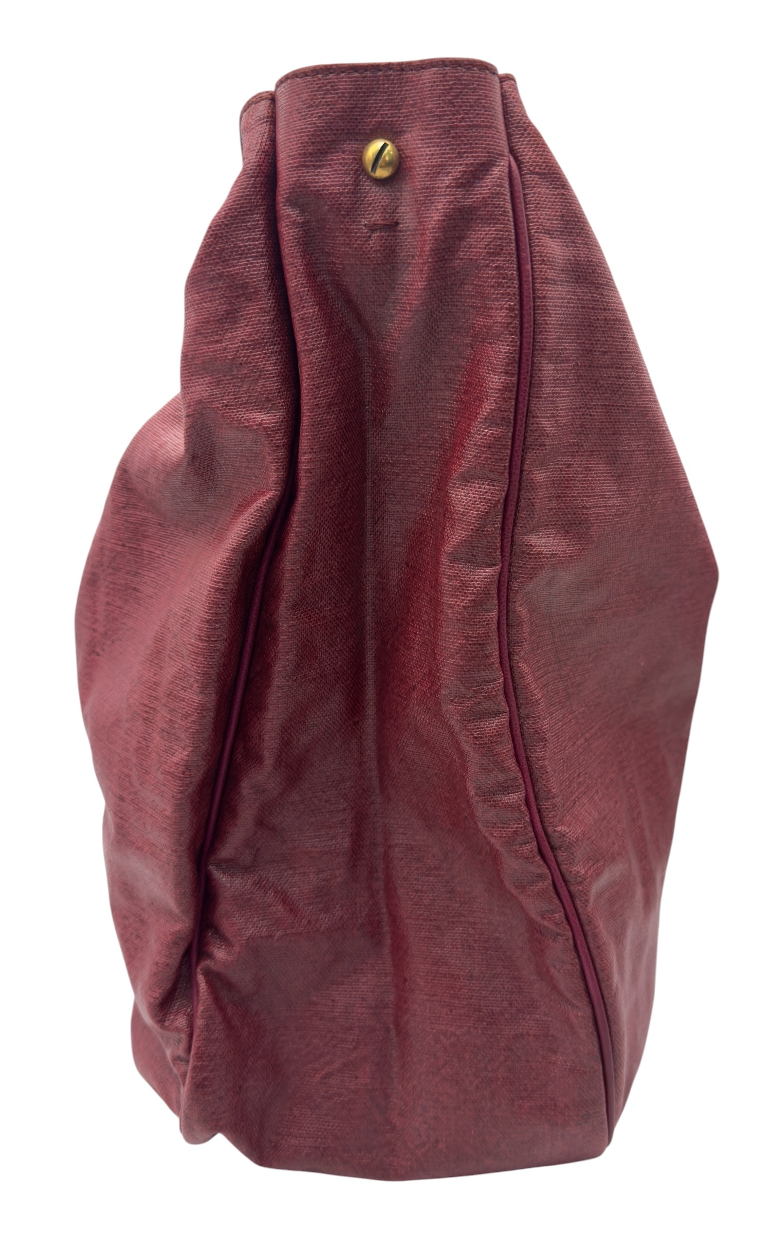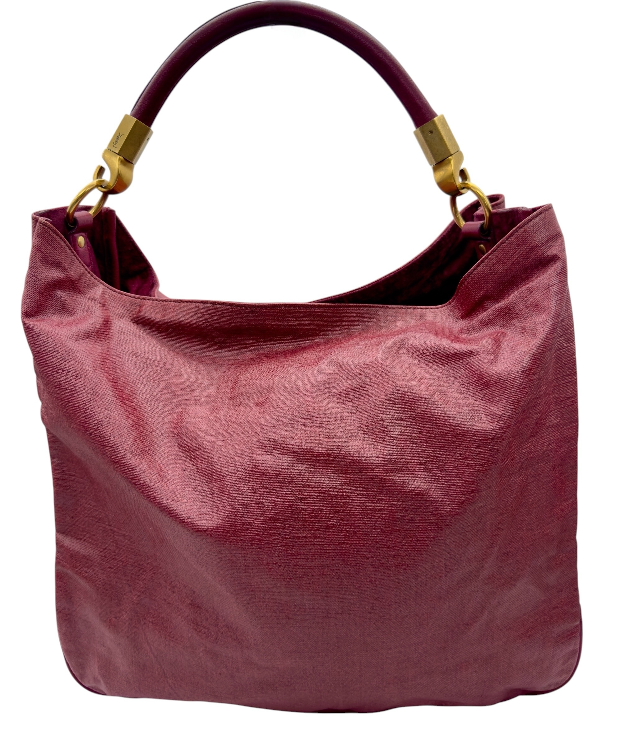 A Yves Saint Laurent Roady Hobo Bag. Burgundy leather exterior with gold-tone hardware and a single leather rolled bag handle. Magnetic closure, opening to a burgundy suede interior with two open inner side pocket. Comes a detachable matching zipped pouch and certificate of authenticity. Approximately 37.5cm in length x 35cm in height. In good condition overall but Please see photos or request a condition report. Ref: 27317