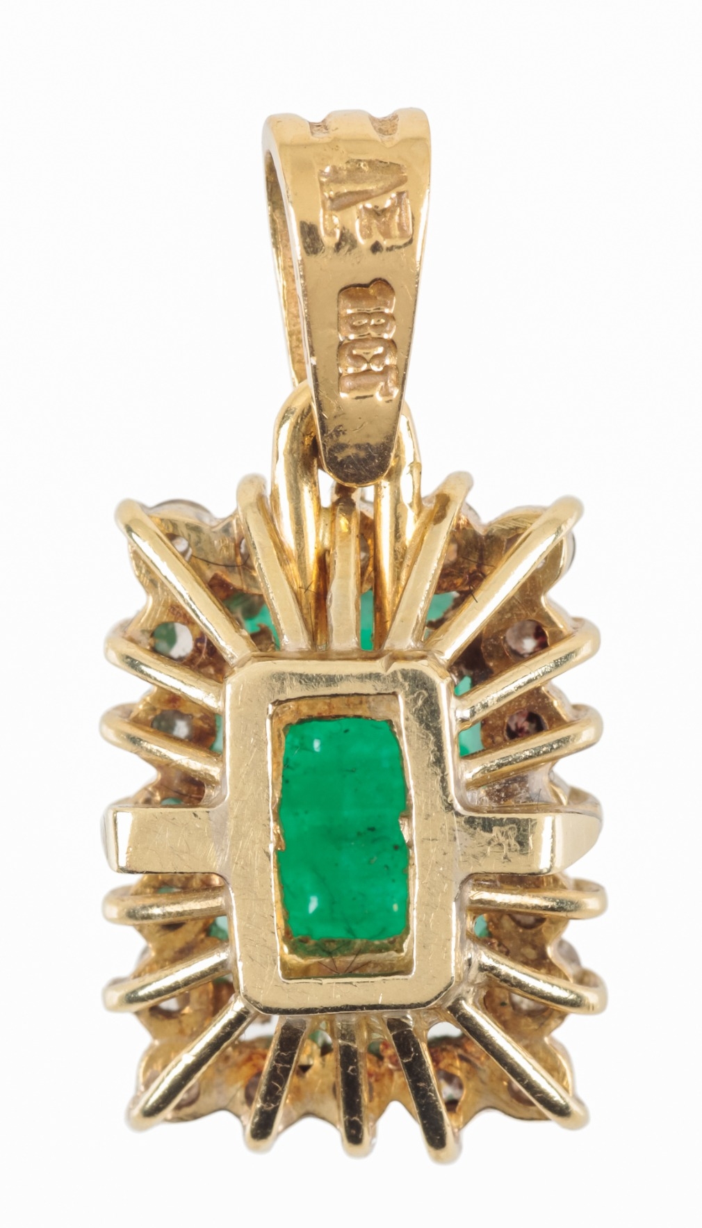 the emerald 8mm x 5mm, within a border of twenty brilliant-cut diamonds, claw-set in yellow gold, the suspension loop stamped"18ct", c. 3.6 grams total weight