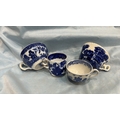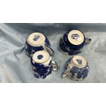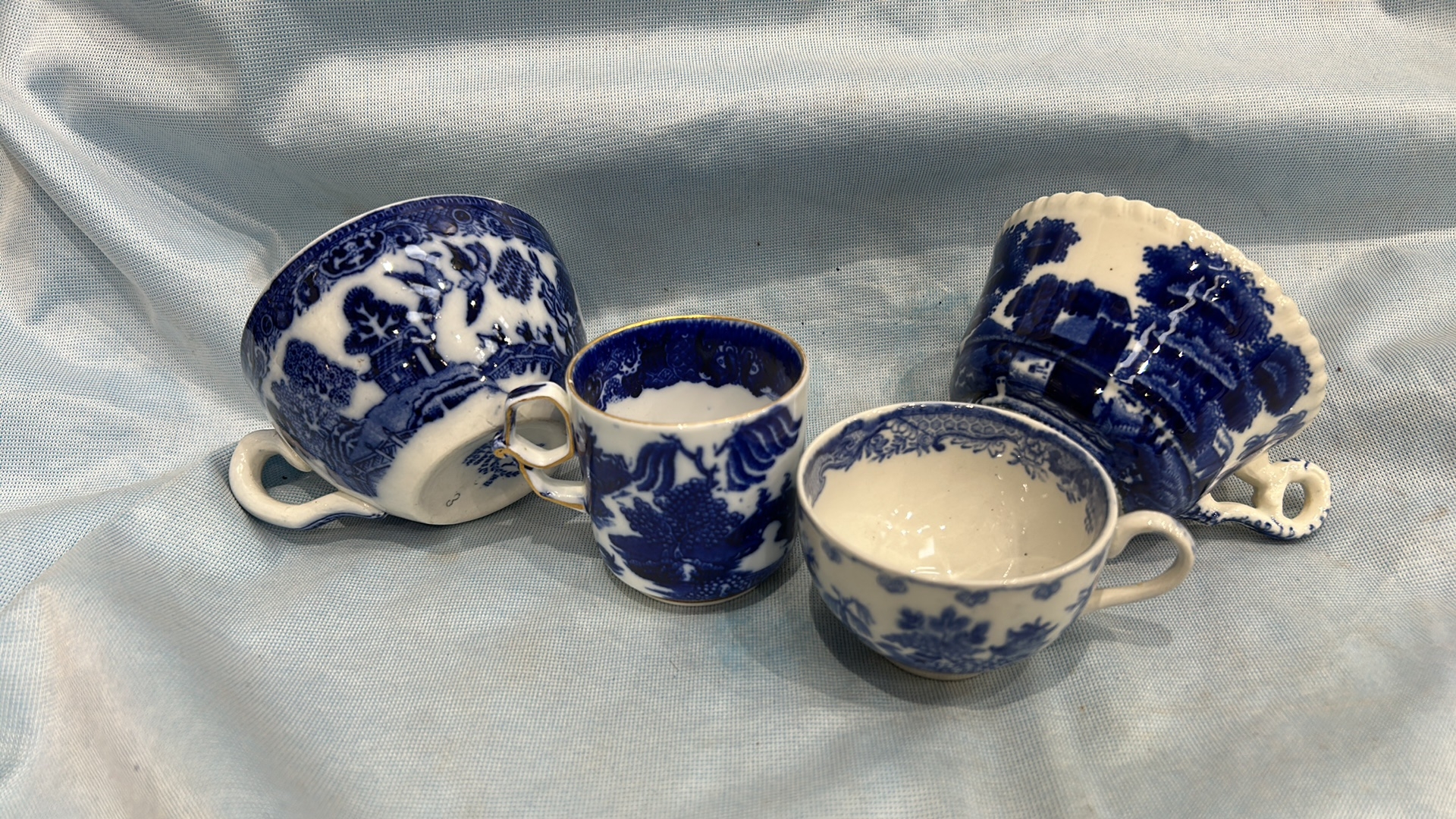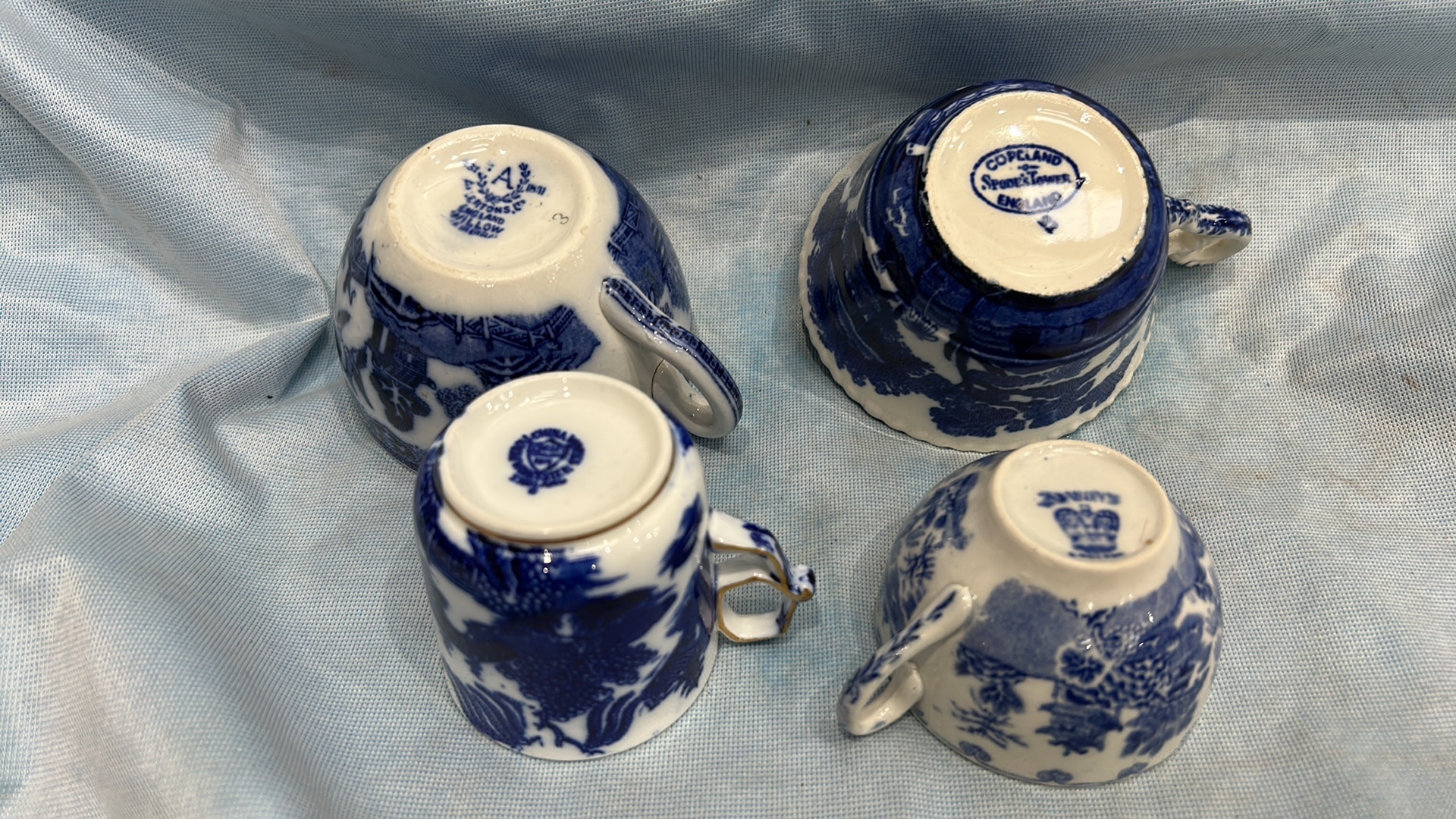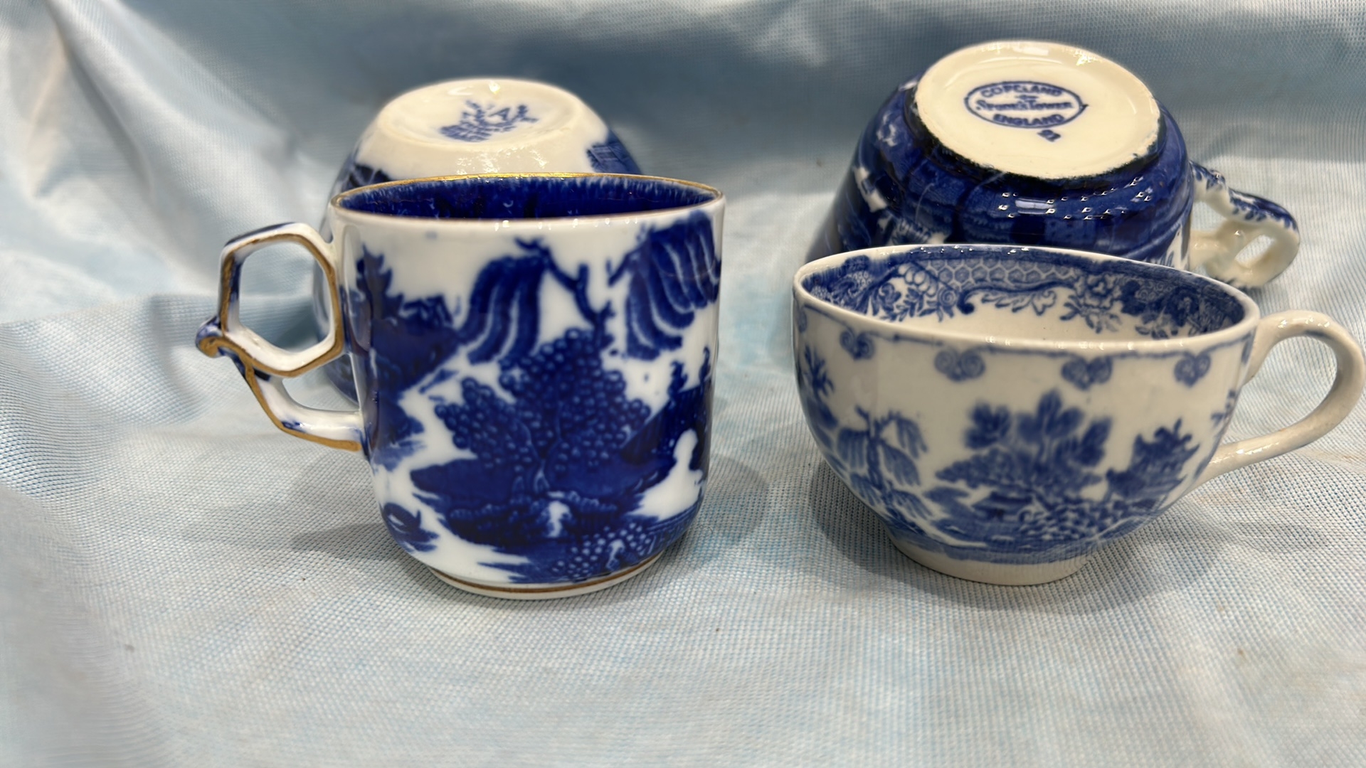 Group of four English blue and white flow-blue porcelain teacups, assorted transfer-printed chinoiserie and floral patterns, one bearing Copeland Spode mark, late 19th–early 20th century.