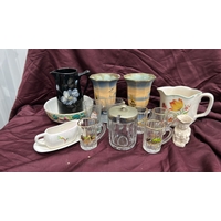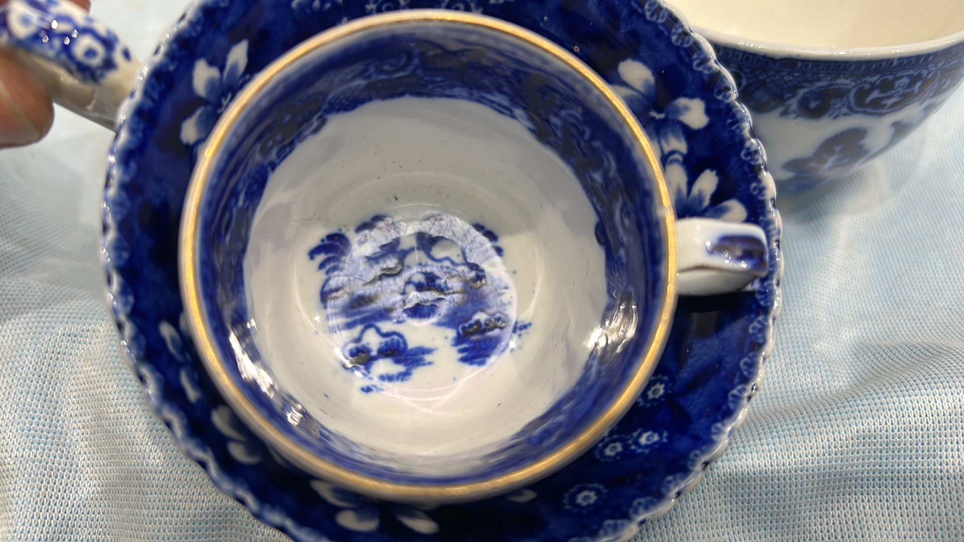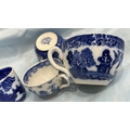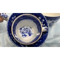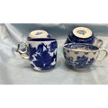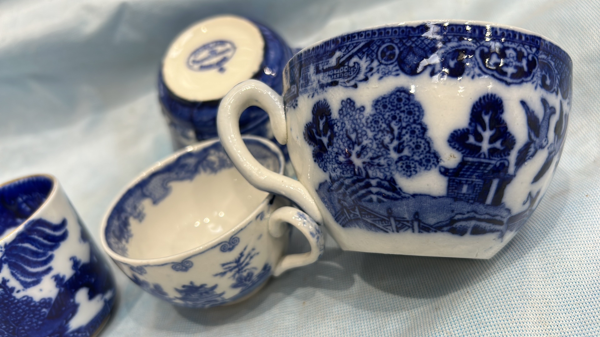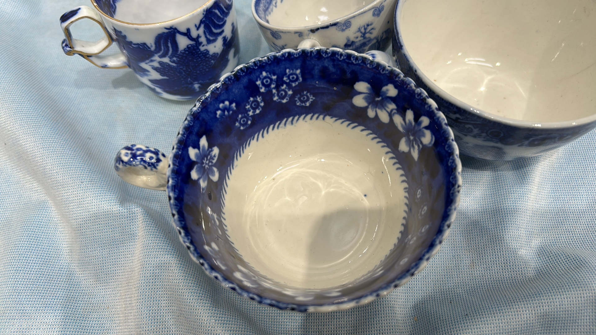Group of four English blue and white flow-blue porcelain teacups, assorted transfer-printed chinoiserie and floral patterns, one bearing Copeland Spode mark, late 19th–early 20th century.