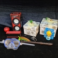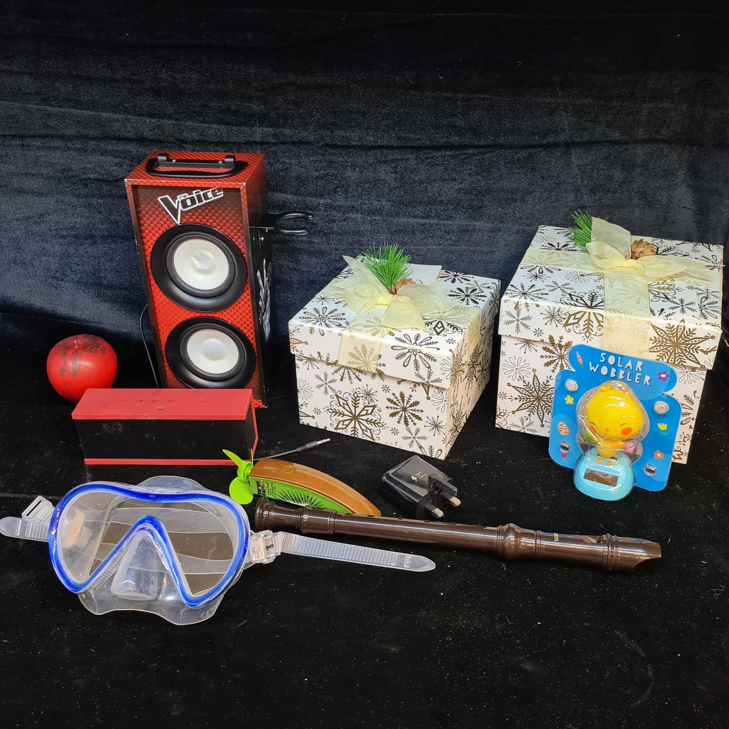 A box containing a mixed lot of items including a recorder, a Photive CYREN Portable Wireless Bluetooth Speaker, a solar powered desk toy, 2 decorative gift boxes and more.