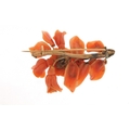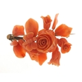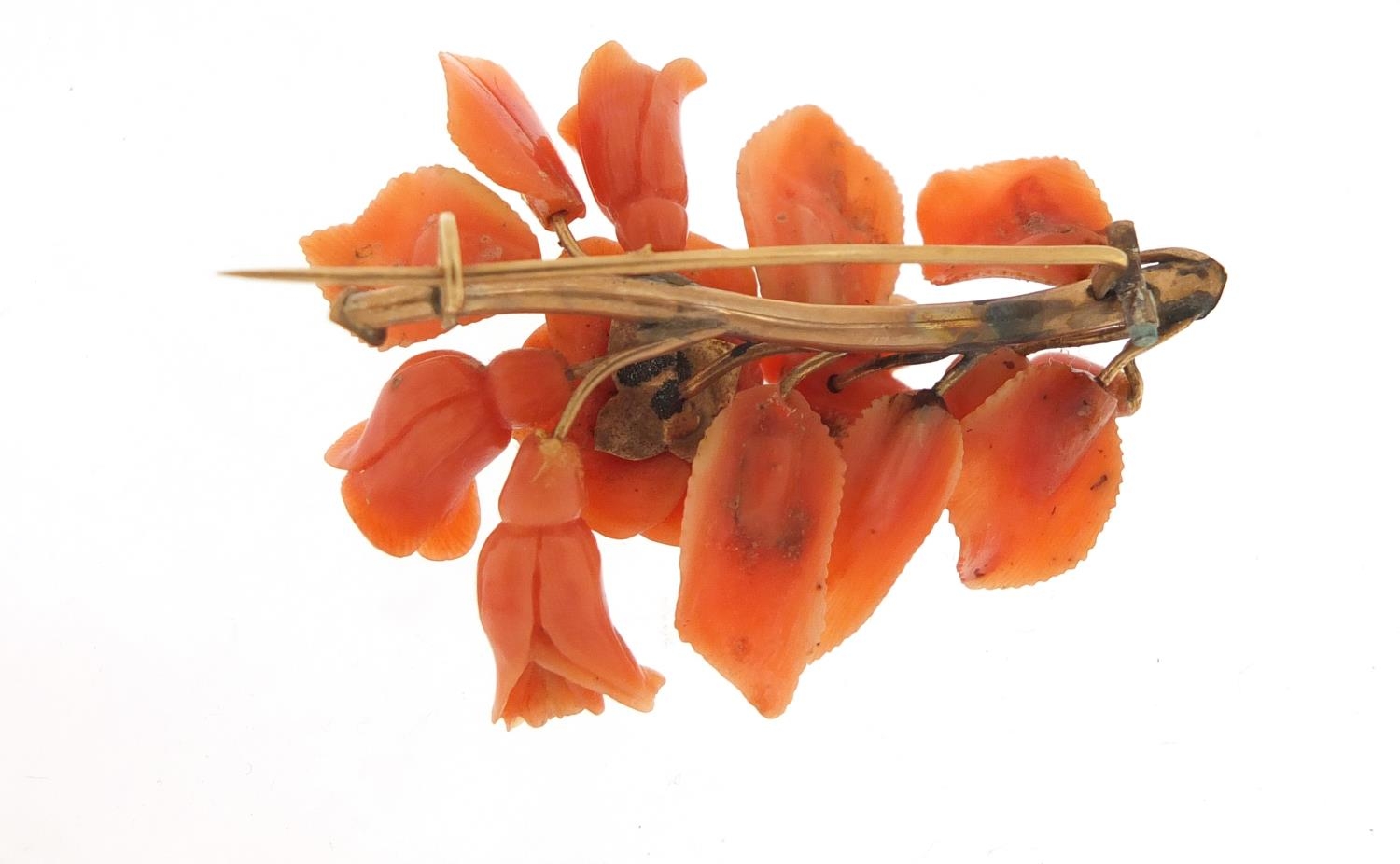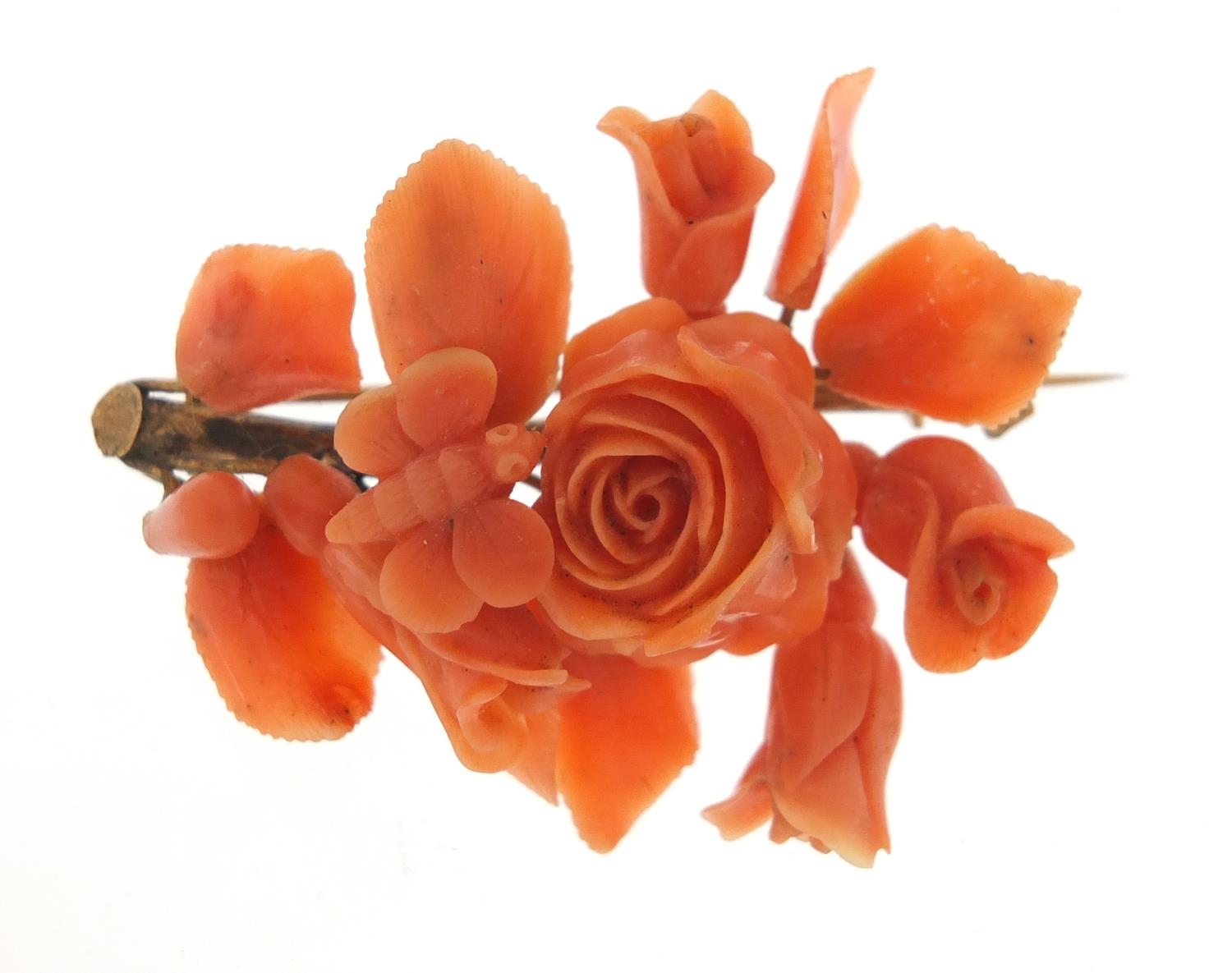 Victorian unmarked gold and coral brooch, carved with a bee in flowers, (tests as 12ct gold) 6cm in length, 16.8g