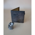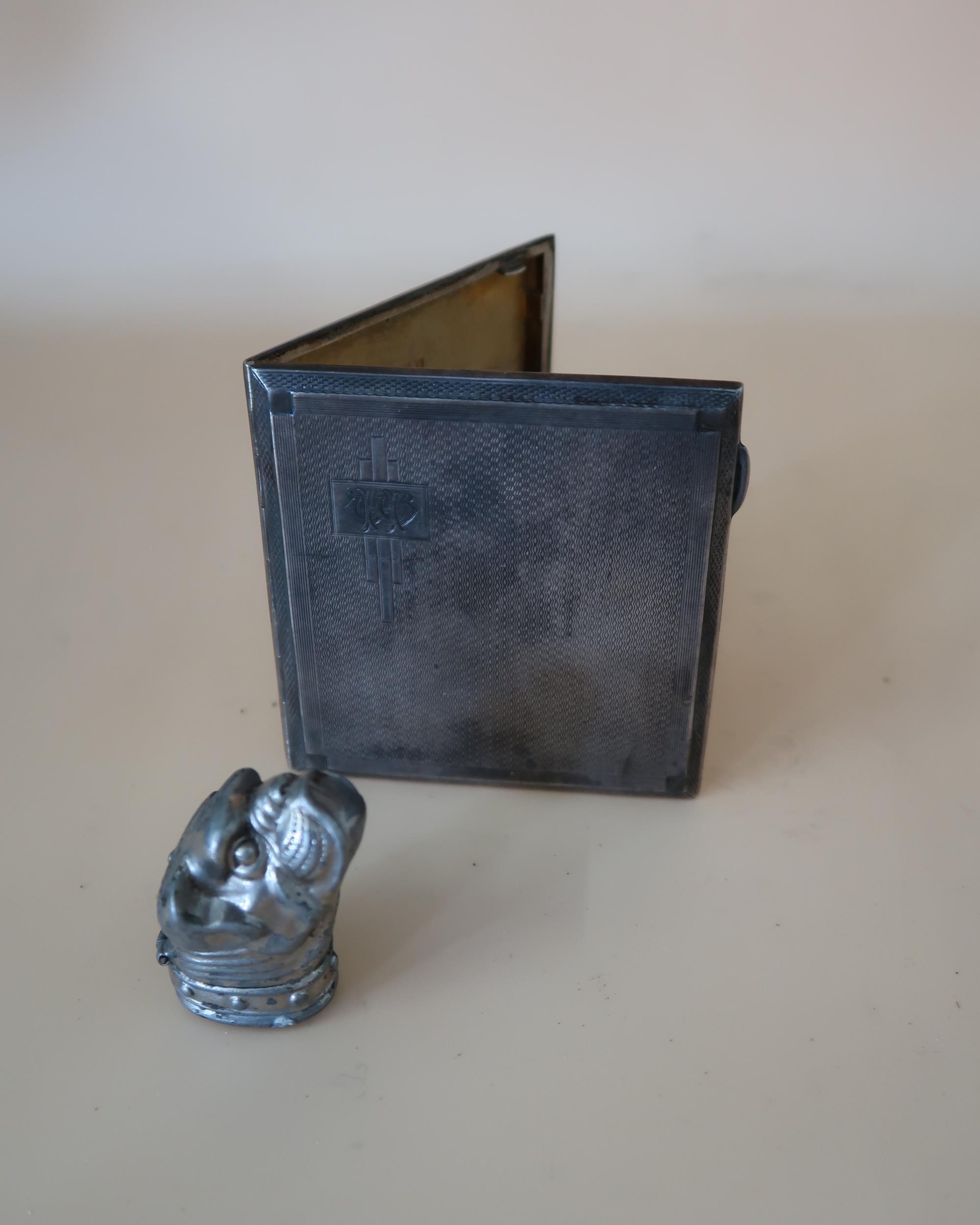 An Art Deco silver cigarette case, of almost square form with decorative engine turned decoration, monogram engraved, John Rose, Birmingham 1935, 8.5 by 8cm, 3.93toz, together with a silver plated snuff box in the form of a bulldog.