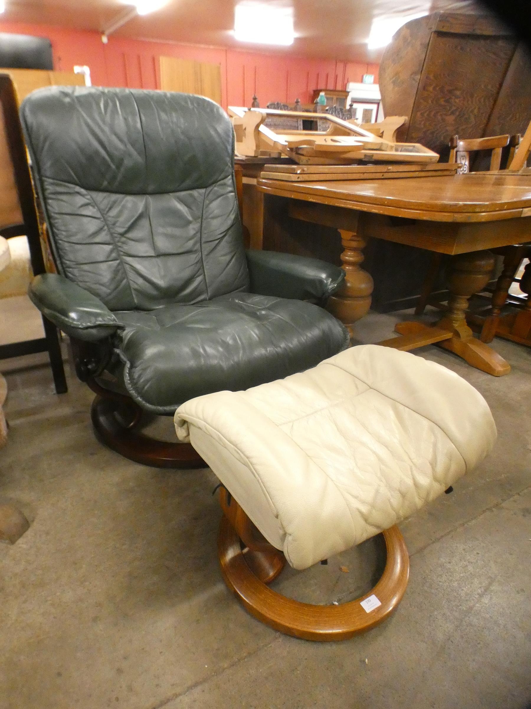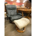 An Ekorness Stressless beech and green leather reclining armchair and a beige stool
