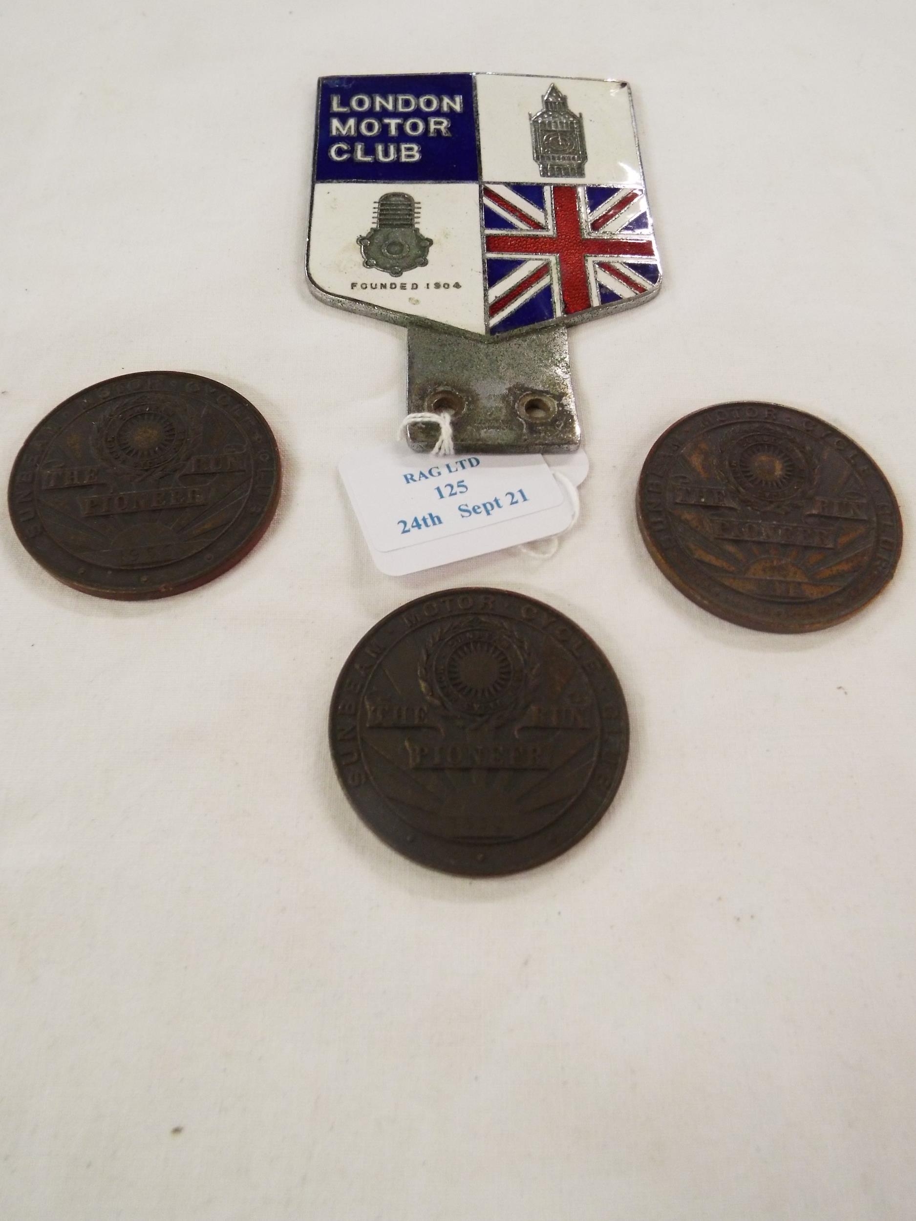 A vintage London Motor Club enamel car badge together with three Sunbeam Motorcycle Club medallions